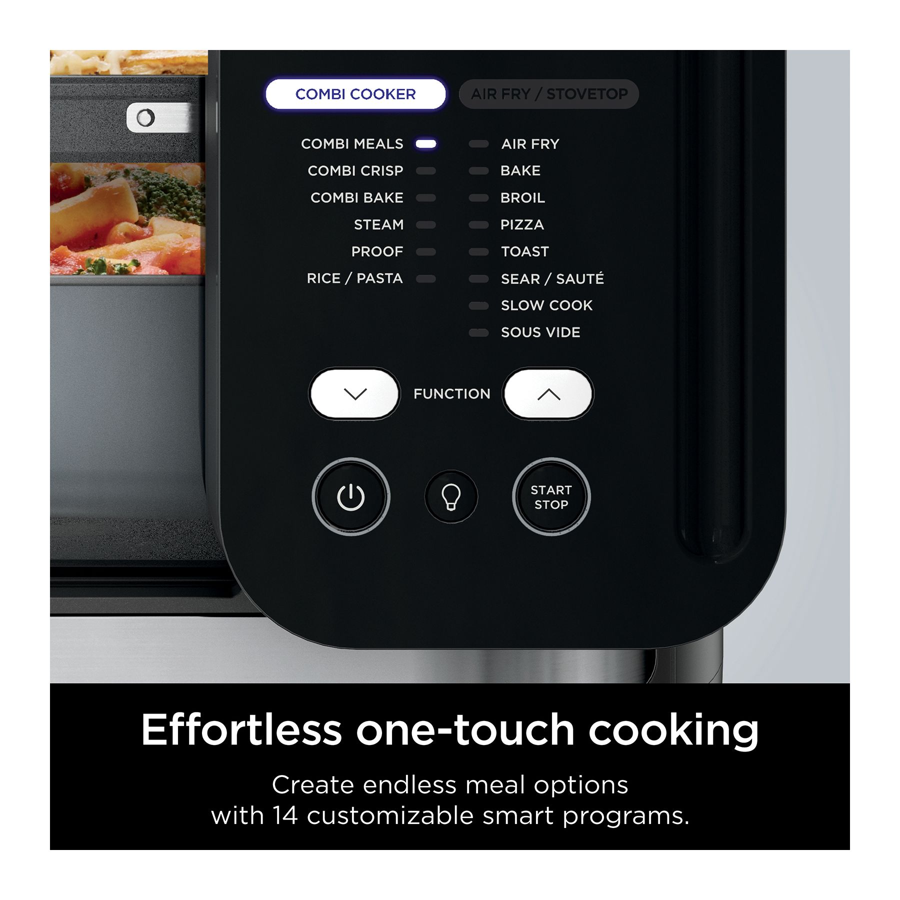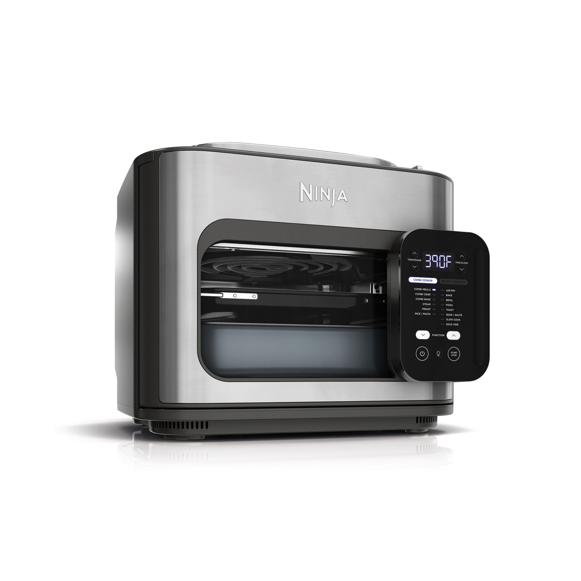 14-in-1 Versatility: Combi Meals, Combi Crisp, Combi Bake, Rice/Pasta, Sear/Sauté, Steam, Bake, Toast, Pizza, Slow Cook, Proof, Sous Vide, Air Fry, Broil Complete Meals that Cook in 15 Minutes: Cook your proteins, veggies, and pasta or grains all at the same time and make a meal 50% faster than in a wall oven One Stop Shop in Your Kitchen: With its all-in-one functionality and included accessories, the Ninja Combi is the only appliance you will ever need—no more cluttered countertops and endless piles of dishes to clean afterward Easy Cleanup: The Combi Cooker Pan doubles as a serving dish and all accessories are dishwasherz safe to make cleanup a breeze Ninja Combi Cooker Technology: HyperSteam and Air Fry combine to create juicy insides and deliciously crispy outsides all at once; super-heated steam evenly cooks and locks in juices while rapid cyclonic air crisps food to perfection Frozen to Table in Under 30 Minutes: No need to defrost—super-heated steam will quickly thaw frozen ingredients and cook them to a safe temperature in under 30 minutes Family-Sized Capacity: Perfect for large families or entertaining—feeds up to 8 people and fits 1.5 boxes (24 oz.) of pasta, 4 cups of dry rice, a 6 lb. roast chicken, 2 lbs. of fries, a 10" pizza, or a 5 lb. top round roast What's Included: A countertop multicooker, Combi Cooker Pan, bake tray, crisper tray, and recipe book with 20 chef-created recipes and cooking charts