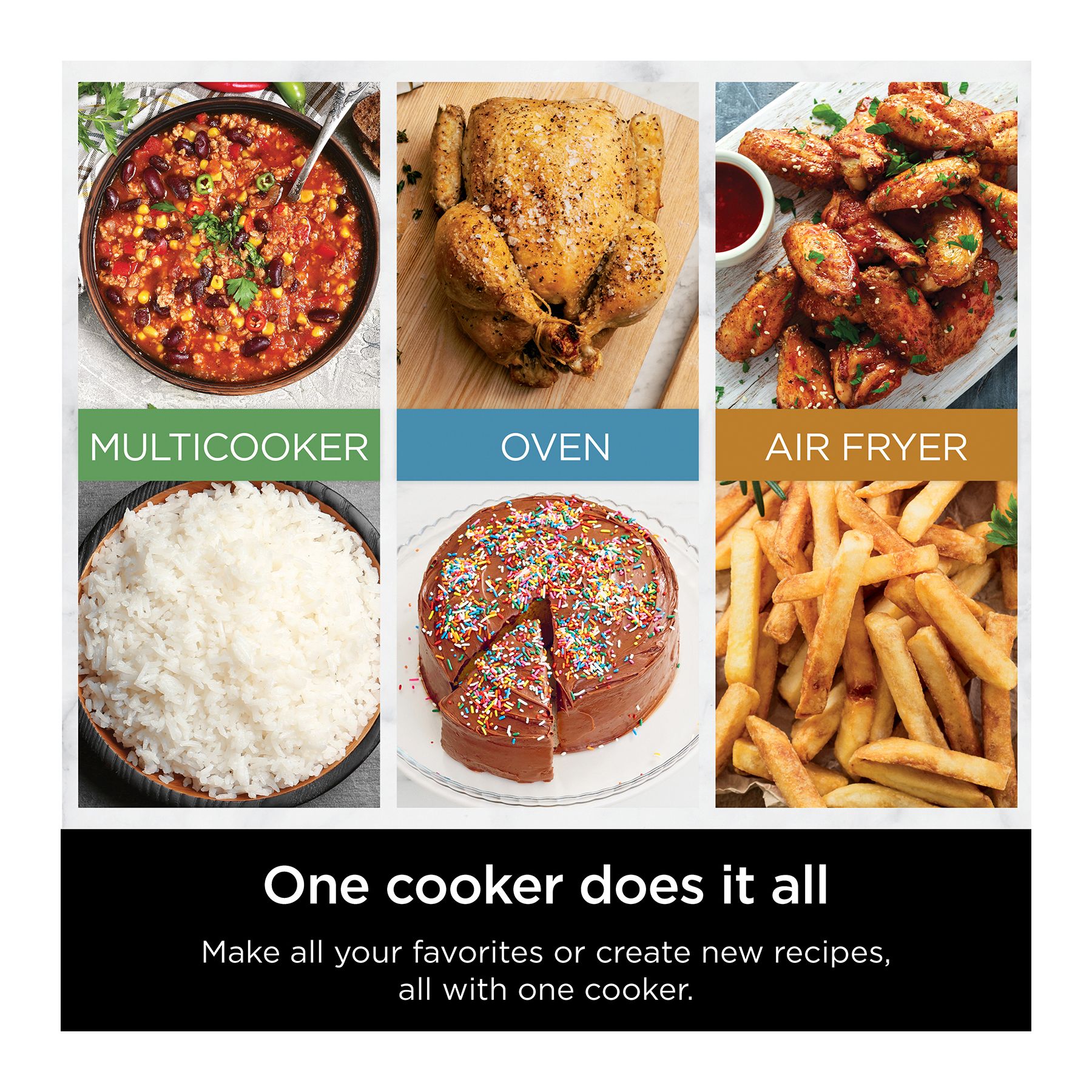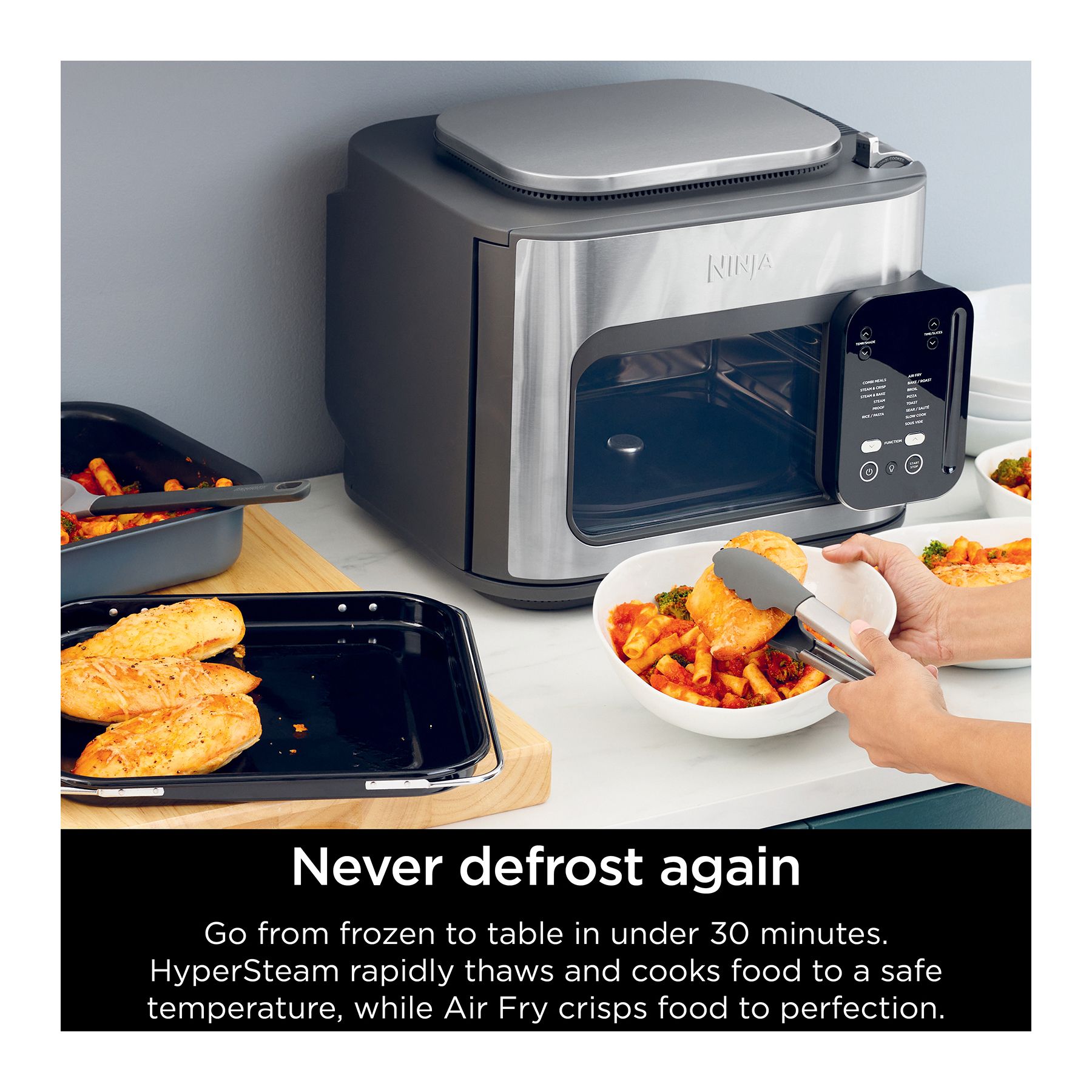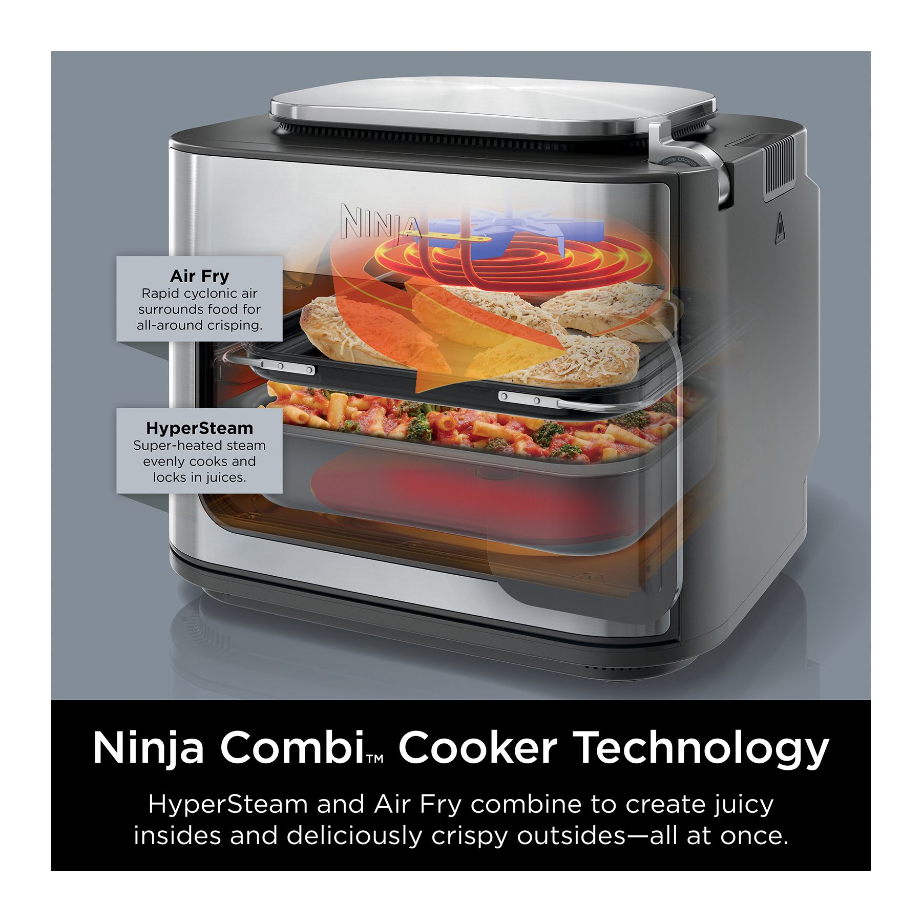 Meet the Ninja Combi—the only all-in-one multicooker, oven, air fryer and so much more that perfectly cooks complete meals for your whole family in just 15 minutes. With 14 functions and 3 included accessories, it’s so easy to use you will never have to turn on your kitchen again. A complete pasta dinner made from scratch in an oven without having to boil water? A full taco spread, including rice and beans in one single appliance? The Ninja Combi makes it all possible with our revolutionary Ninja Combi Cooker Technology that defies limits with a simultaneous combination of HyperSteam and Air Fry. Every ingredient is perfectly cooked in minutes—juicy on the inside, crispy on the outside. It’s the most effortless way to cook—the Combi Way.