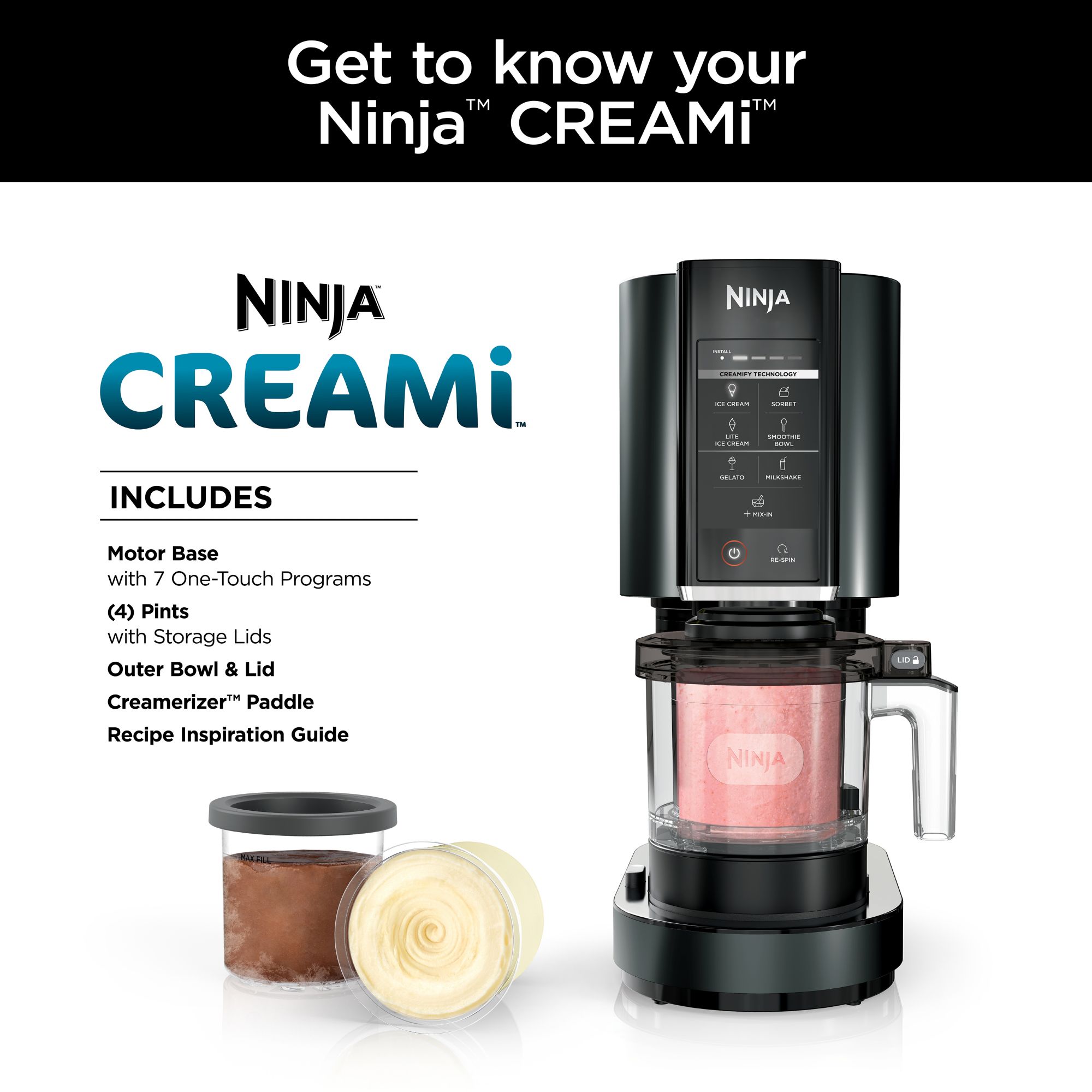 Includes motor base, paddle, four 16oz. CREAMi pints with storage lids, outer bowl, and lid to house pint while processing, recipe inspiration guide with 30 recipes, seven one-touch programs, LED progress bar