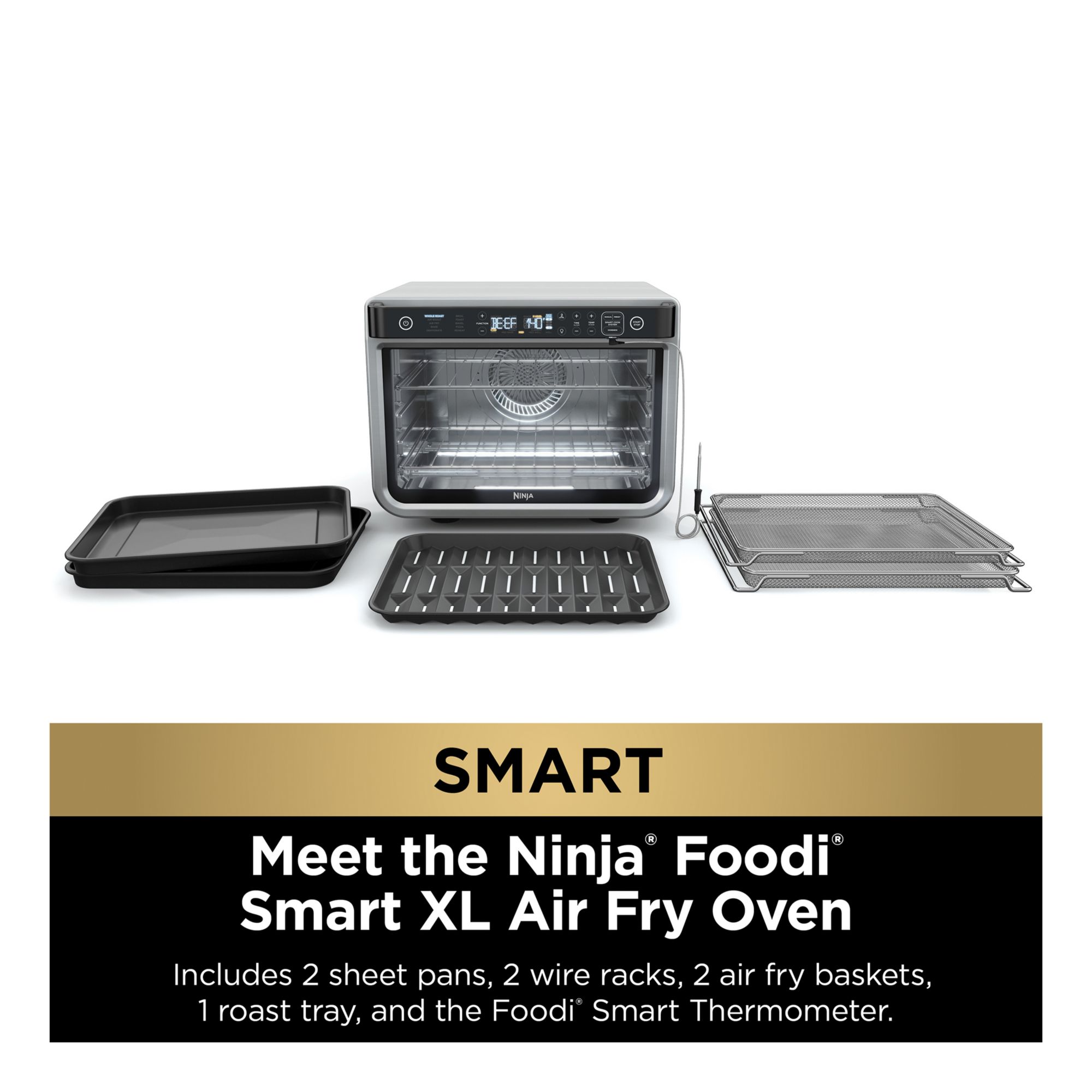 True Surround Convection: Up to 10X the convection power vs. a traditional full-size convection oven for faster, crispier, and juicy results Ultimate Versatility: Air Fry, Air Roast, Bake, Whole Roast, Broil, Toast, Bagel, Dehydrate, Reheat, and Pizza, all in one powerful 1800-watt appliance Smart Cook System: Achieve the perfect doneness from rare to well done at the touch of a button with the integrated Foodi Smart Thermometer—no guesswork required Quick Family Meals: 90-second oven preheat time and up to 30% faster cooking than a traditional full-size convection oven Extra-Large Countertop Oven Capacity: 2-level even cooking, no rotating required—fit a 5-lb chicken and a sheet pan of vegetables, 2 12-in pizzas, or a 12-lb turkey Air Fryer Healthy Meals: Up to 75% less fat when using the Air Fry function vs. traditional deep frying* (*tested against hand-cut, deep-fried French fries) Digital Display Handle: The optimal oven rack positions will illuminate based on the selected function. When the door is open, display settings freeze to prevent any accidental changes to the cook cycle Crispier Results: Up to 30% crispier results vs. a traditional convection oven Perfect Countertop Oven for Baking: Up to 50% more even baking results vs. a leading countertop oven Includes Ninja Foodi Smart XL Pro Air Oven, 2 wire racks, 2 sheet pans, 2 air fry baskets, 1 roast tray, 1 removable crumb tray, Foodi Smart Thermometer