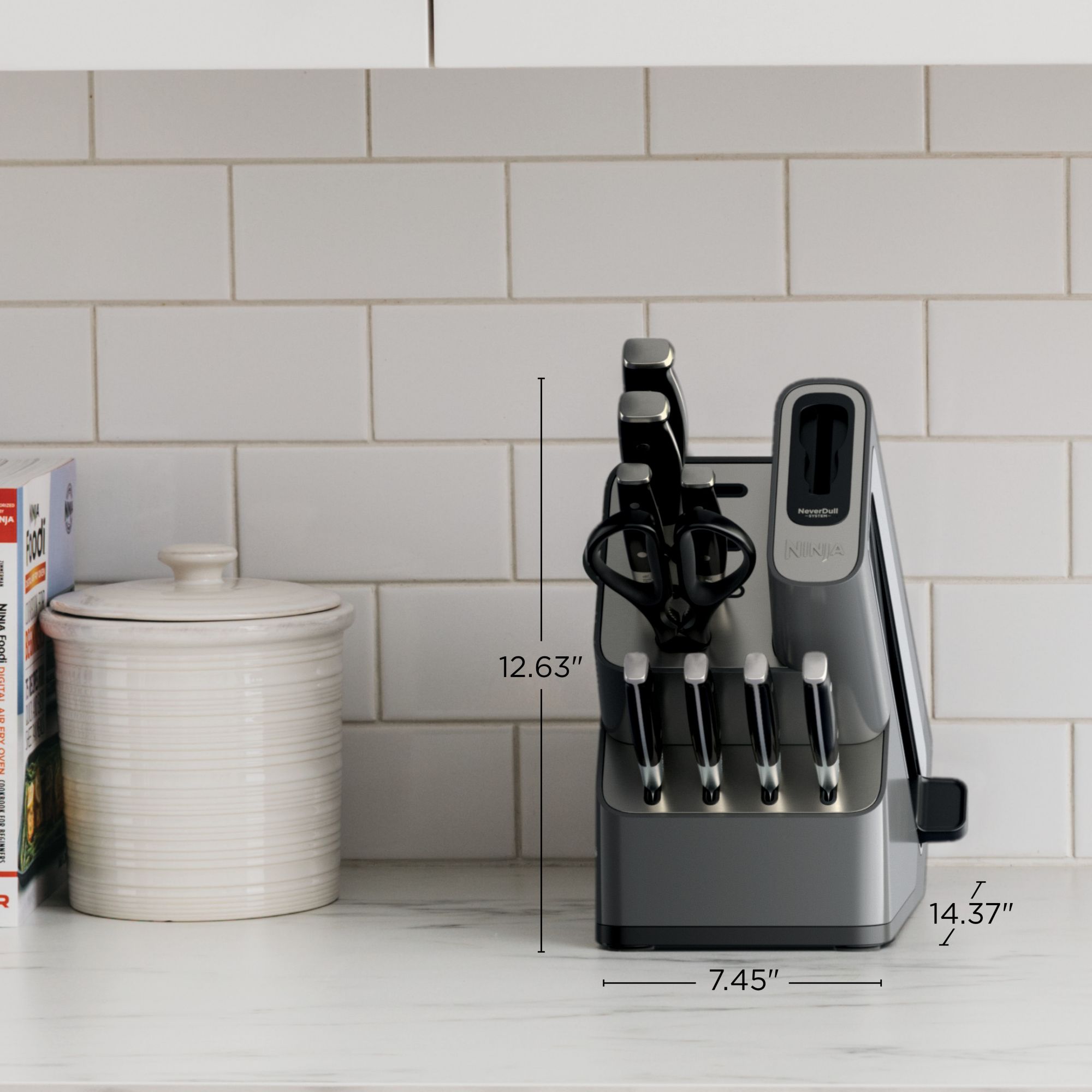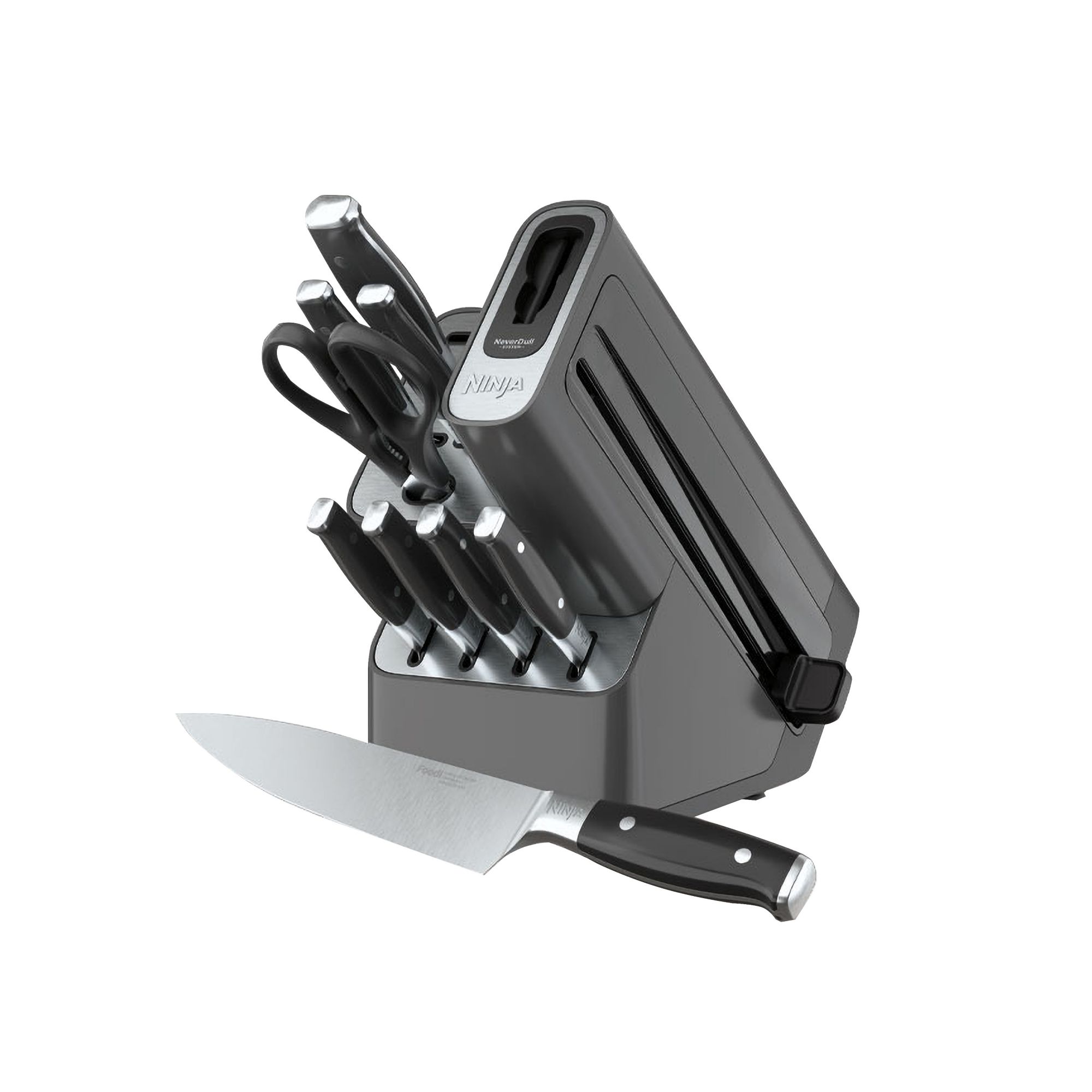 Introducing the Ninja Foodi NeverDull Premium Knife System, the premium knives that stay razor-sharp for over 10 years. This versatile set includes knives with forged German stainless steel blades, full-tang construction, and a premium half-bolster, making them rust-resistant and strong enough for all your kitchen tasks. The superior sharp edge easily glides through tough ingredients with a razor-sharp cutting angle, and the ergonomic, chef-approved design is perfectly balanced for comfort and control. NeverDull Technology is conveniently built into the storage block for professional sharpening results that will maintain a razor-sharp edge for over 10 years. With only a few swipes of the built-in foolproof sharpener, this all-in-one system maintains the superior sharp edge you crave use-after-use. As you swipe, the dynamic stone sharpening wheel engages your blade at the perfect angle and applies the optimal amount of pressure to restore your edge to superior sharpness in seconds. The modern, stylish block design with stainless steel accents fits conveniently on your countertop and complements any kitchen decor.