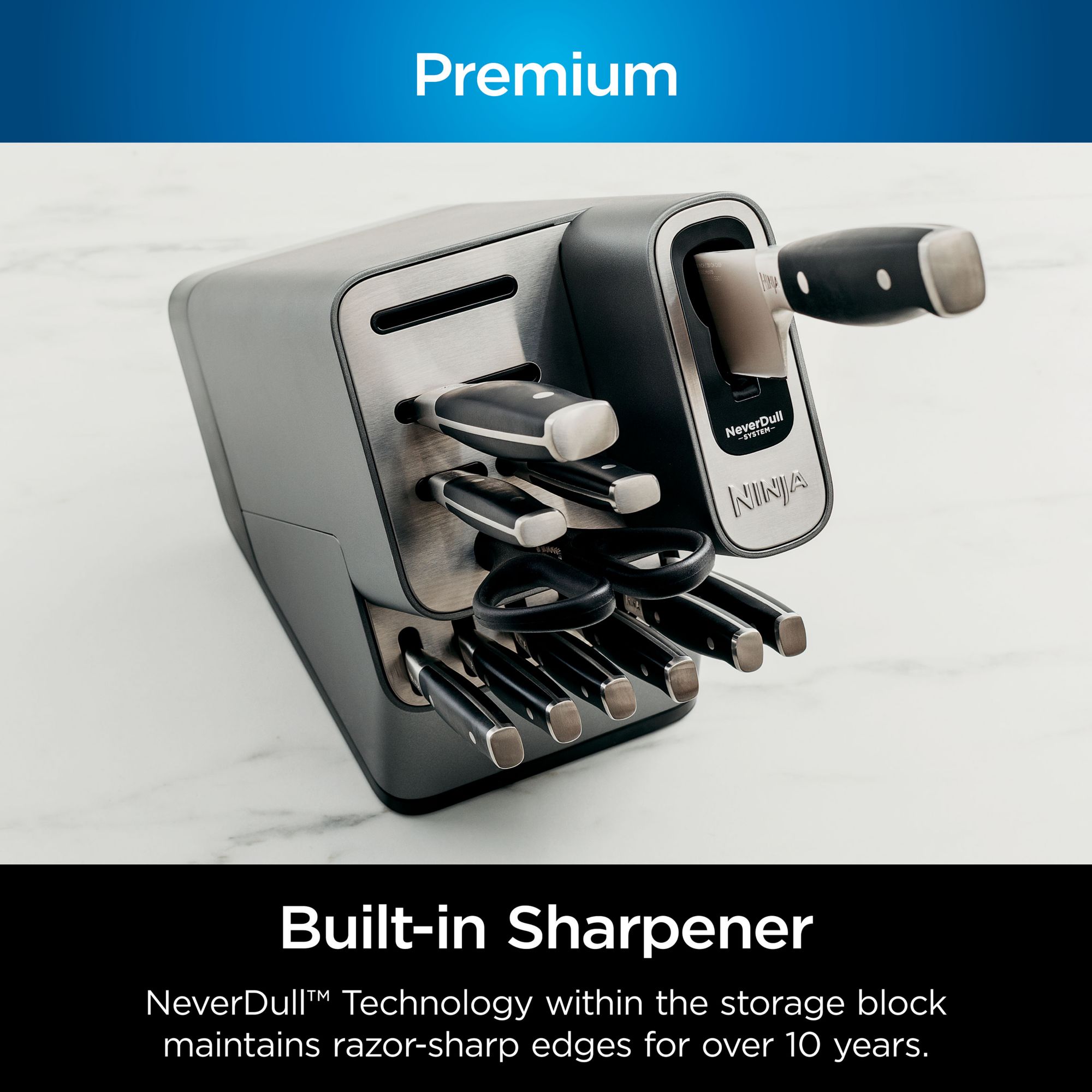 NeverDull Technology is conveniently built into the storage block for professional sharpening results that will maintain a razor-sharp edge for over 10 years