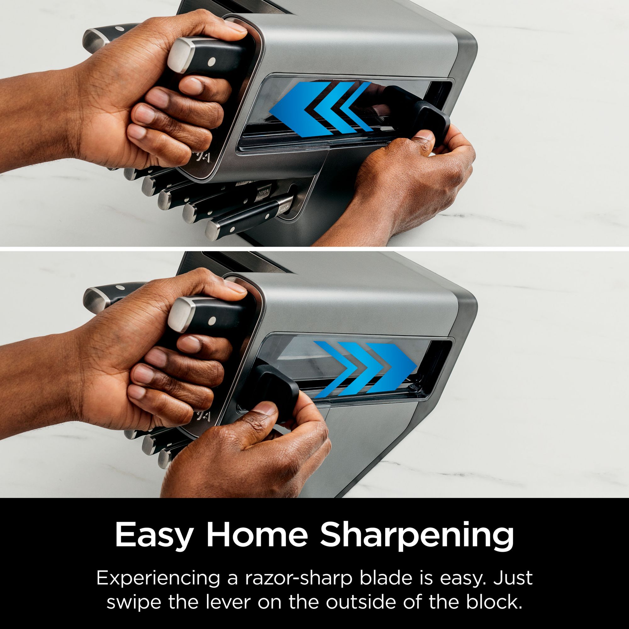 Easy, foolproof sharpening ensures you’ll never experience the frustration of a dull knife again. All you do is swipe the lever on the outside of the block