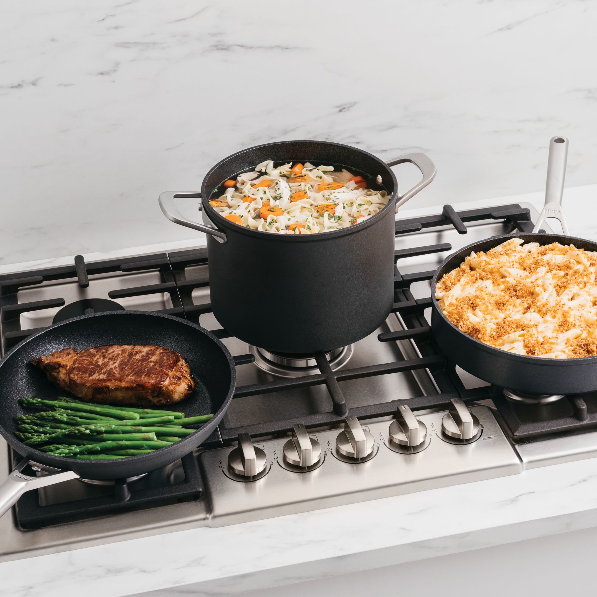 Ninja Foodi NeverStick Premium Cookware is the NeverStick cookware that won't stick, chip, or flake. With a max manufacturing temperature of 30,000 degrees, this cookware won't rapidly lose nonstick like traditional nonstick pans made at 900 degrees can. The cookware coating is oven safe to 500 degrees and dishwasher safe. Premium, solid stainless steel handles allow for oven use up to 500 degrees F and are ergonomically designed for comfort. Double-riveted for strength and maneuverability. Long handles stay cool when cooking on the stovetop. Heavy-gauge 4.5 mm aluminum base for improved heat retention. Uniquely designed to distribute metal thickness throughout the pan to prevent hot spots so food cooks quickly and evenly. 30% more aluminum than the Ninja Foodi NeverStick C100 series. This premium cookware has an extremely durable shot-blasted, hard-anodized exterior that resists scratches like stainless steel. The sleek tempered glass lids have a 13-mm-thick stainless steel rim and lock in moisture while ensuring maximum visibility. Sear like you can in stainless steel. Plus sauté, griddle, pan-fry, shallow fry, deep fry, boil, steam, braise, bake, roast, and broil. No need to cook with oil or butter. Dishwasher safe and all range capable: gas, electric, glass-ceramic, and induction. Easy-to-clean. It includes 14-pieces.