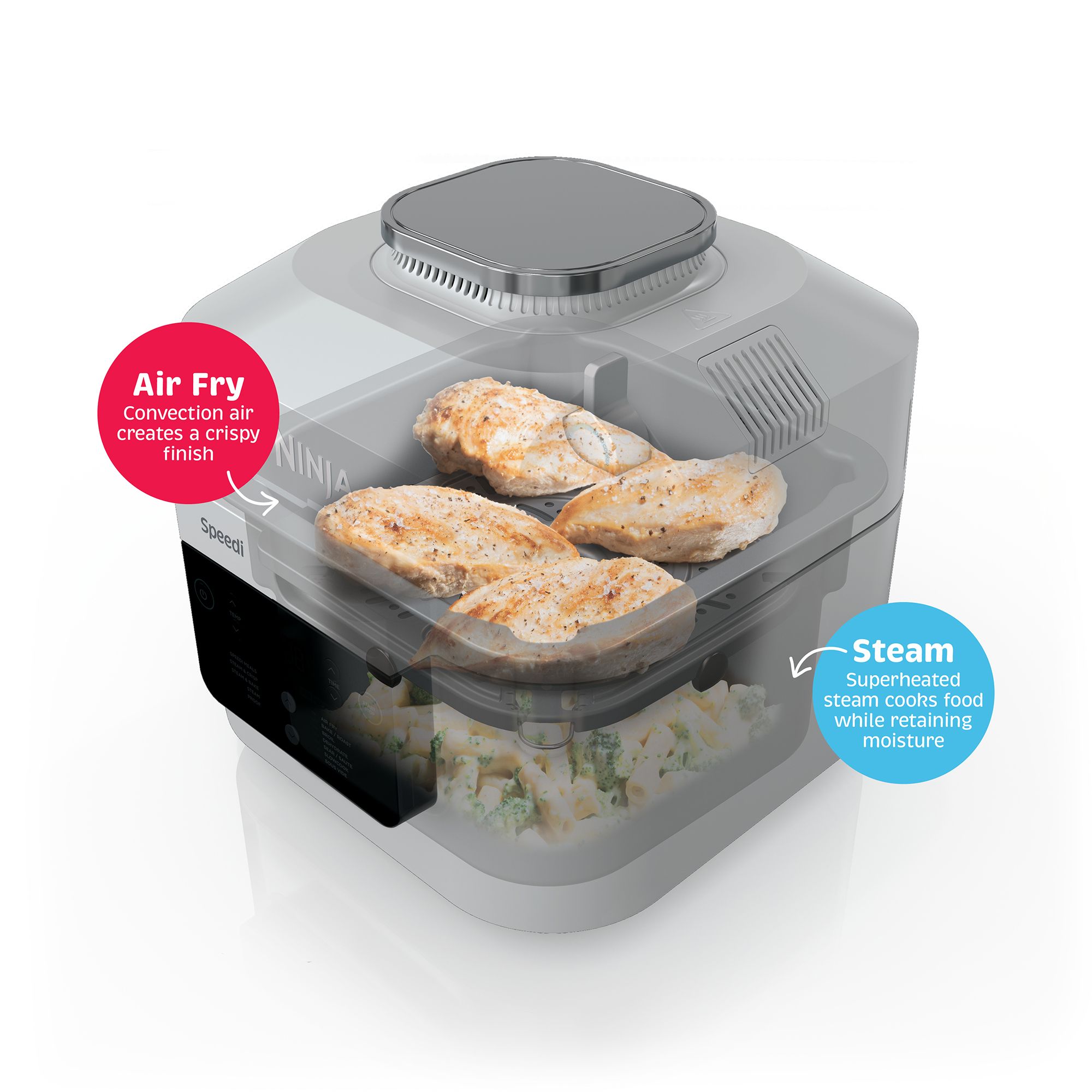 14-in-1 functionality: Unlock speedi meals, steam and crisp, steam and bake, steam, or proof in rapid cooker mode and air fry, air broil, bake/roast, dehydrate, keep warm, reheat, sear and saute, slow cook, and sous vide functions in air fry mode