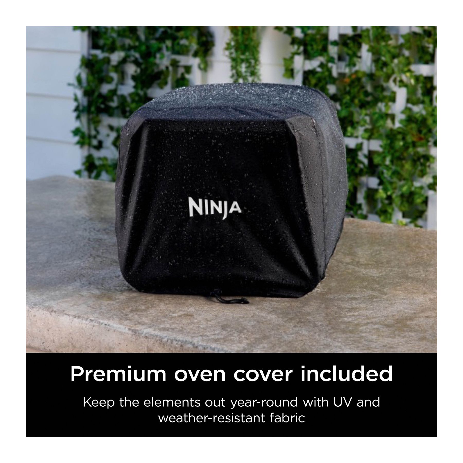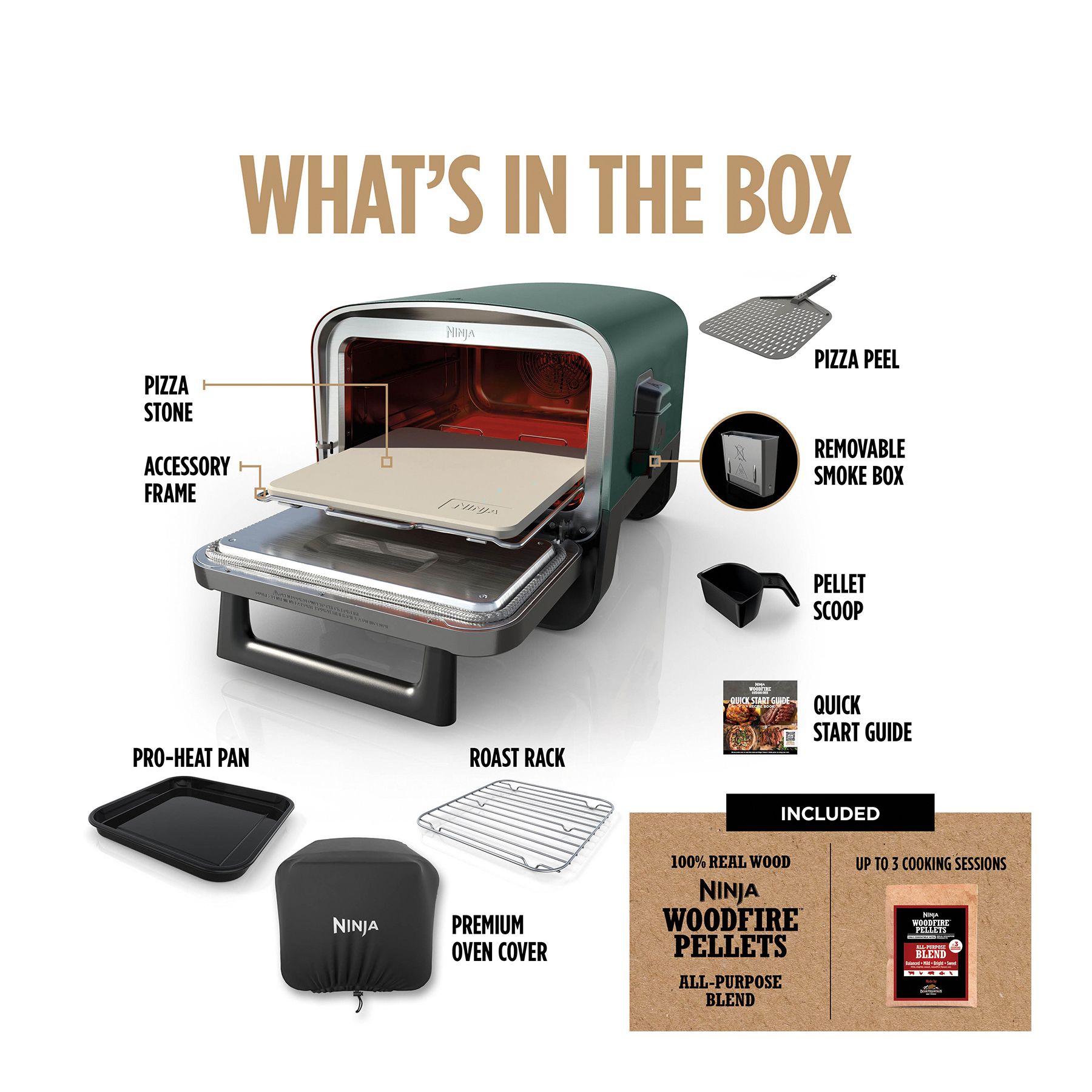 Includes outdoor oven, pro-heat pan, pizza stone, roast rack, accessory frame, pellet scoop, quick start guide, all-purpose blend starter pack, Ninja perforated pizza peel and premium oven cover
