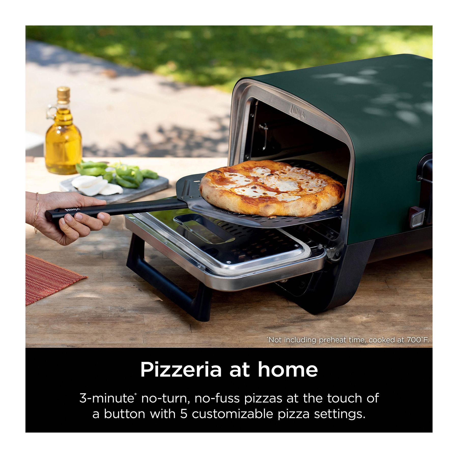Three-minute no turn, no fuss pizzas**. Choose from five different settings to satisfy any craving; Neapolitan, thin crust, pan, New York, and frozen