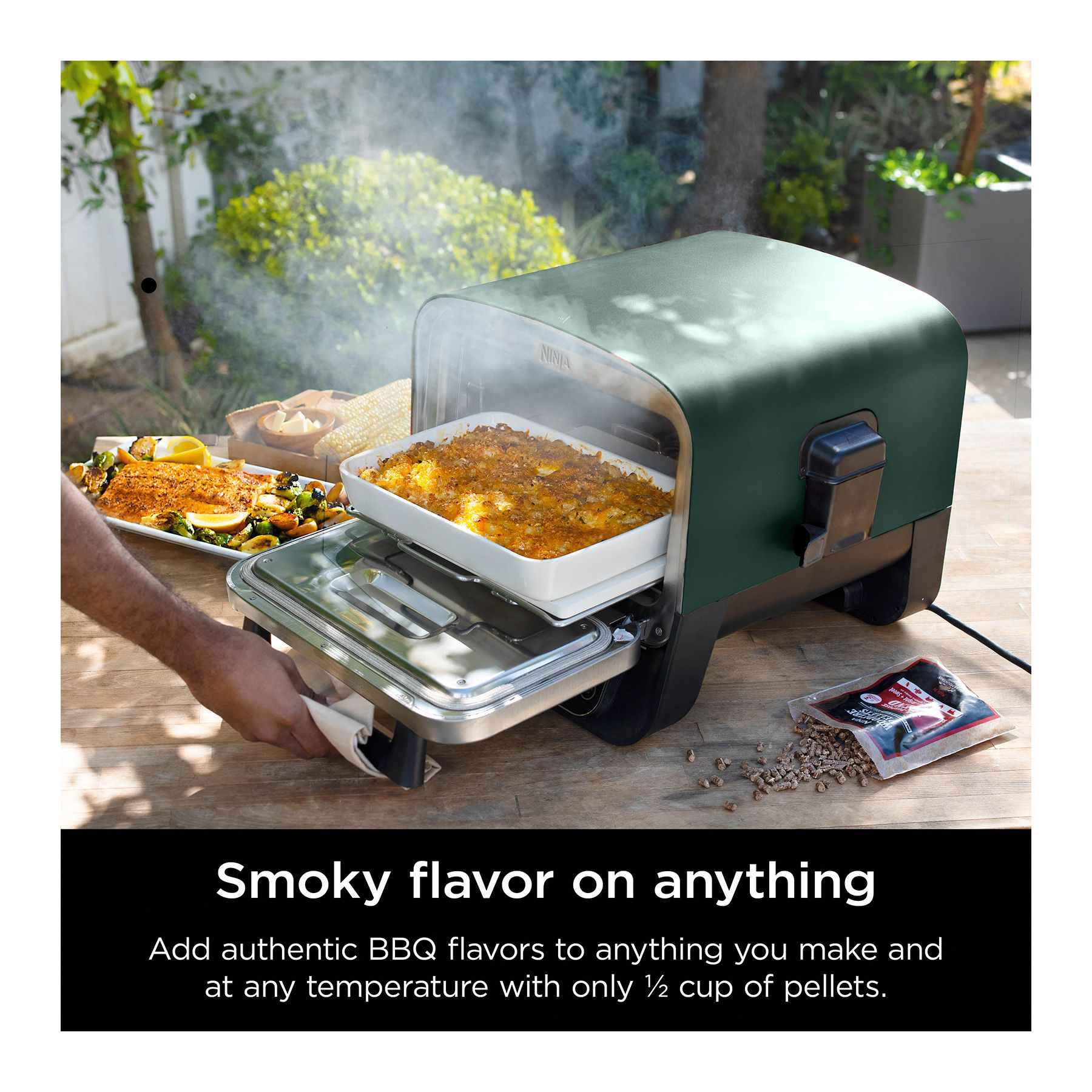Reimagine what you can cook outdoors with the Ninja Woodfire Outdoor Oven. This electric outdoor oven unlocks eight-in-one versatility with a wide temperature range of 105-700 degrees for a world of premium flavors, textures, and results at the touch of a button. Plus, add authentic woodfire flavor to anything you make at any temperature with just a 0.5 cup of pellets with woodfire technology. Member exclusive includes added value with a Ninja Woodfire perforated pizza peel and premium oven cover.