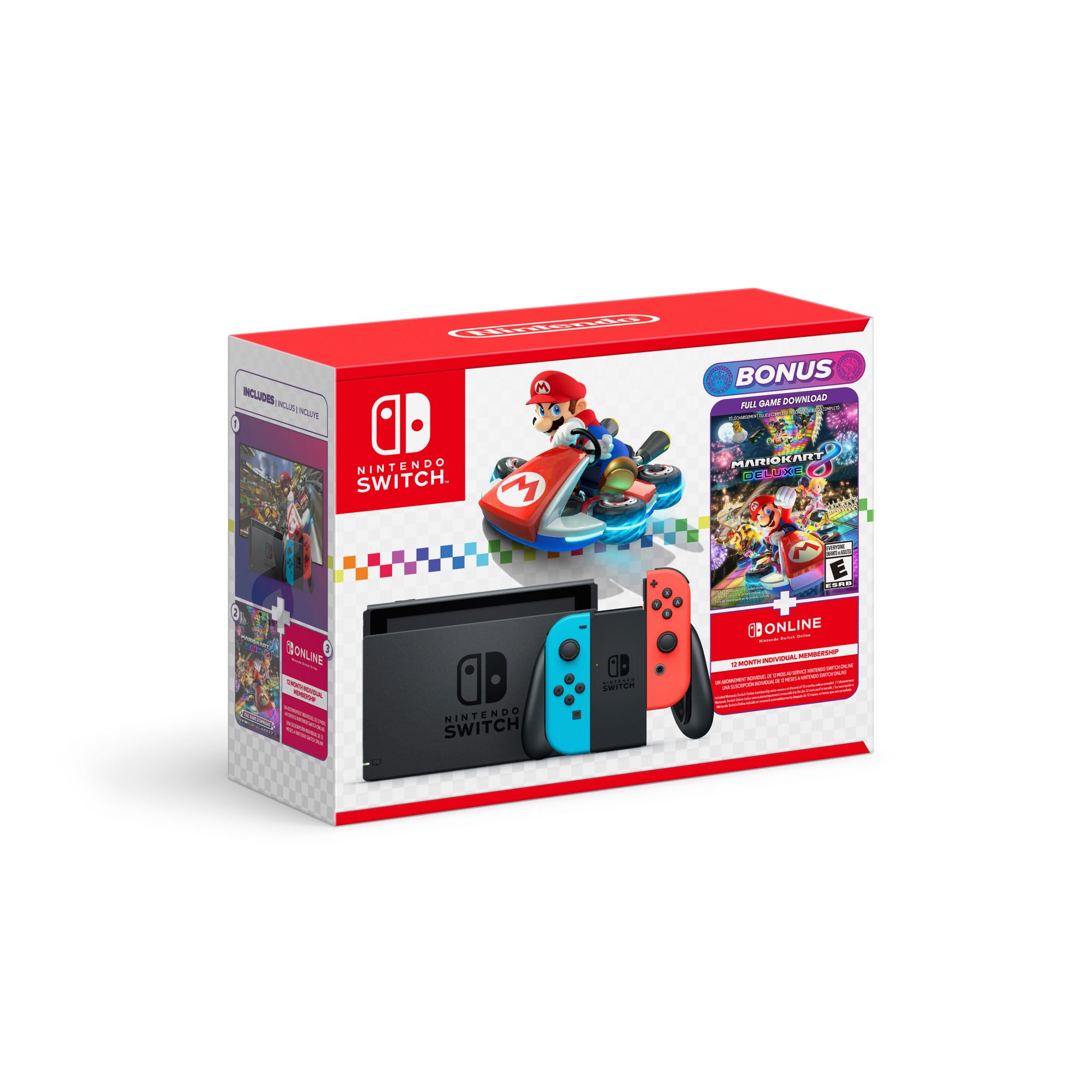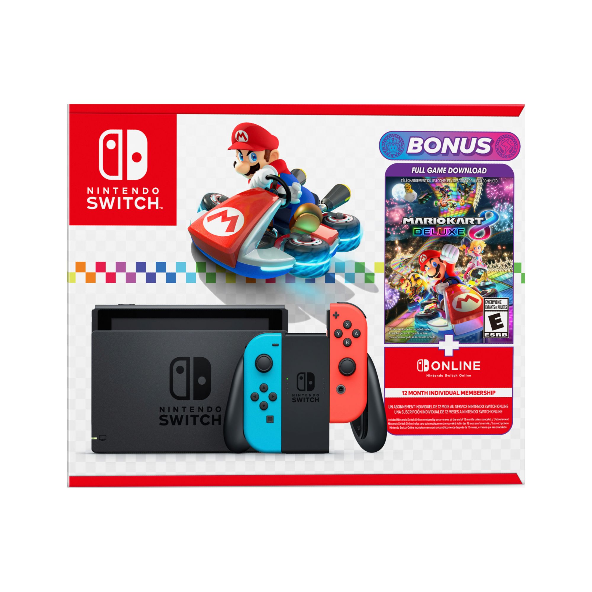 Zoom into the world of Mario and friends. This bundle has everything you need to start your Super Mario adventures, including a Nintendo Switch system with Neon Red and Neon Blue Joy-Con controllers. Plus, enjoy an added $79.99 value with a download code for the Mario Kart 8 Deluxe game and 12 months of Nintendo Switch Online Individual membership. You can start multiplayer races right out of the box— just pass a Joy-Con controller to a friend and play together on the same system. Or pick up more controllers (sold separately) and get up to four people in on the fun. Play at home or on the go with one system The Nintendo Switch system is designed to go wherever you do, instantly transforming from a home console you play on TV to a portable system you can play anywhere. So you get more time to play the games you love, however you like. Burn rubber across Mushroom Kingdom courses Choose from a roster of 42 characters in the Mario Kart 8 Deluxe game. Race underwater, in the sky, upside-down in zero-G, and past the finish in 48 courses. Race players around the world with Nintendo Switch Online With the included Nintendo Switch Online membership, up to 12 people can play together online in Grand Prix, VS Race, and Battle modes. Plus, you can enjoy online play in other multiplayer games like Splatoon 3. Membership also includes access to a 100+ library of class Super NES, NES, and Game Boy games, exclusive special offers, and more. Games for the whole family Nintendo Switch systems are home to games like Super Mario Bros. Wonder, Mario Kart 8 Deluxe, and many more starring Mario and friends. And don’t forget series like Animal Crossing, The Legend of Zelda, Splatoon, Pikmin, and beyond. Features 6.2"LCD touch screen, three play modes- TV, tabletop, and handheld, Local co-op, local wireless, and online multiplayer, and Detachable Joy-Con controllers, Nintendo Switch is home to Mario games and more family-friendly series, Mario Kart 8 Deluxe includes 48 Mushroom Kingdom courses and a roster of 42 characters to race, Up to 4 players can race in local multiplayer, 2-8 players in local wireless, and 2-12 players online, Nintendo Switch Online unlocks online play, classic games, special offers, and more.