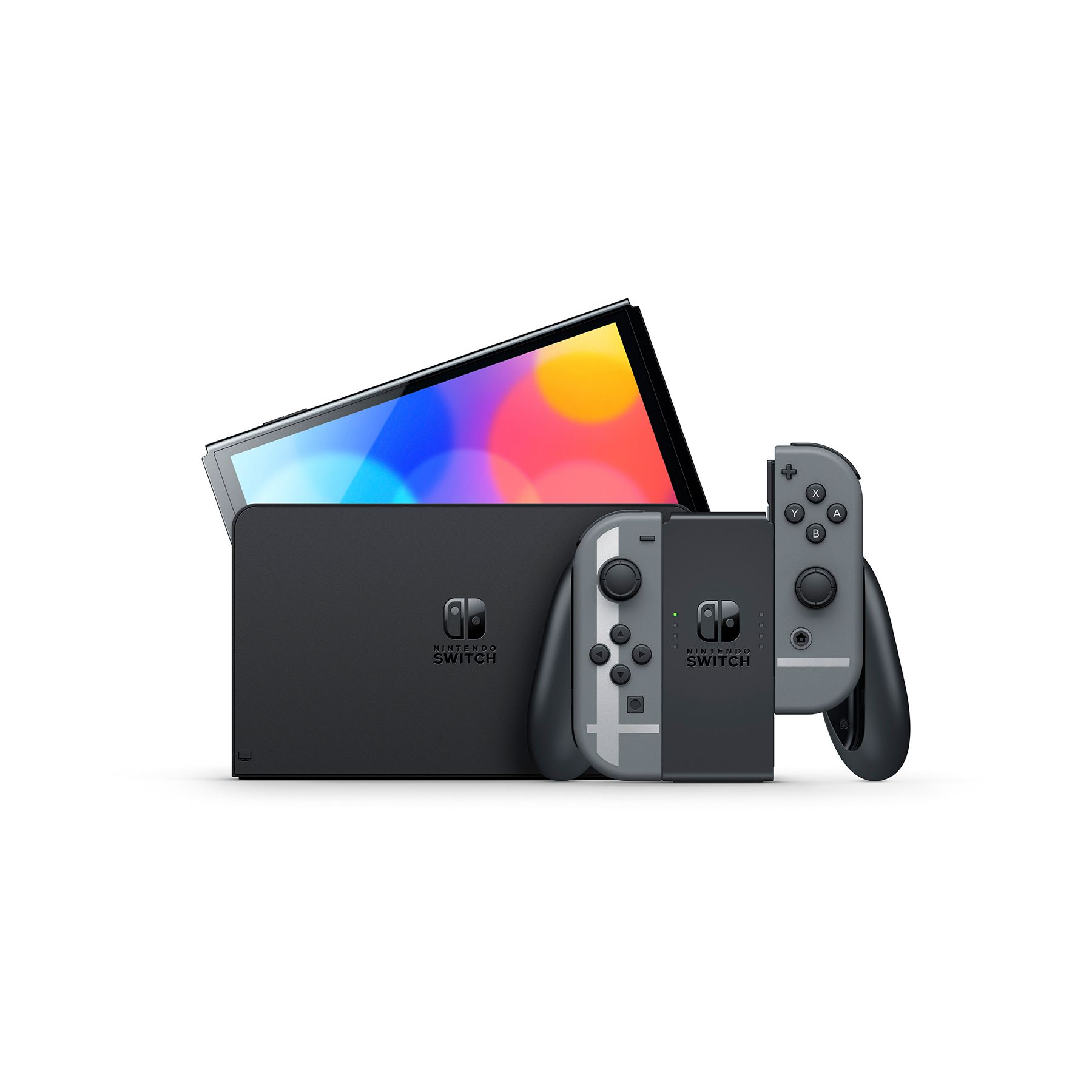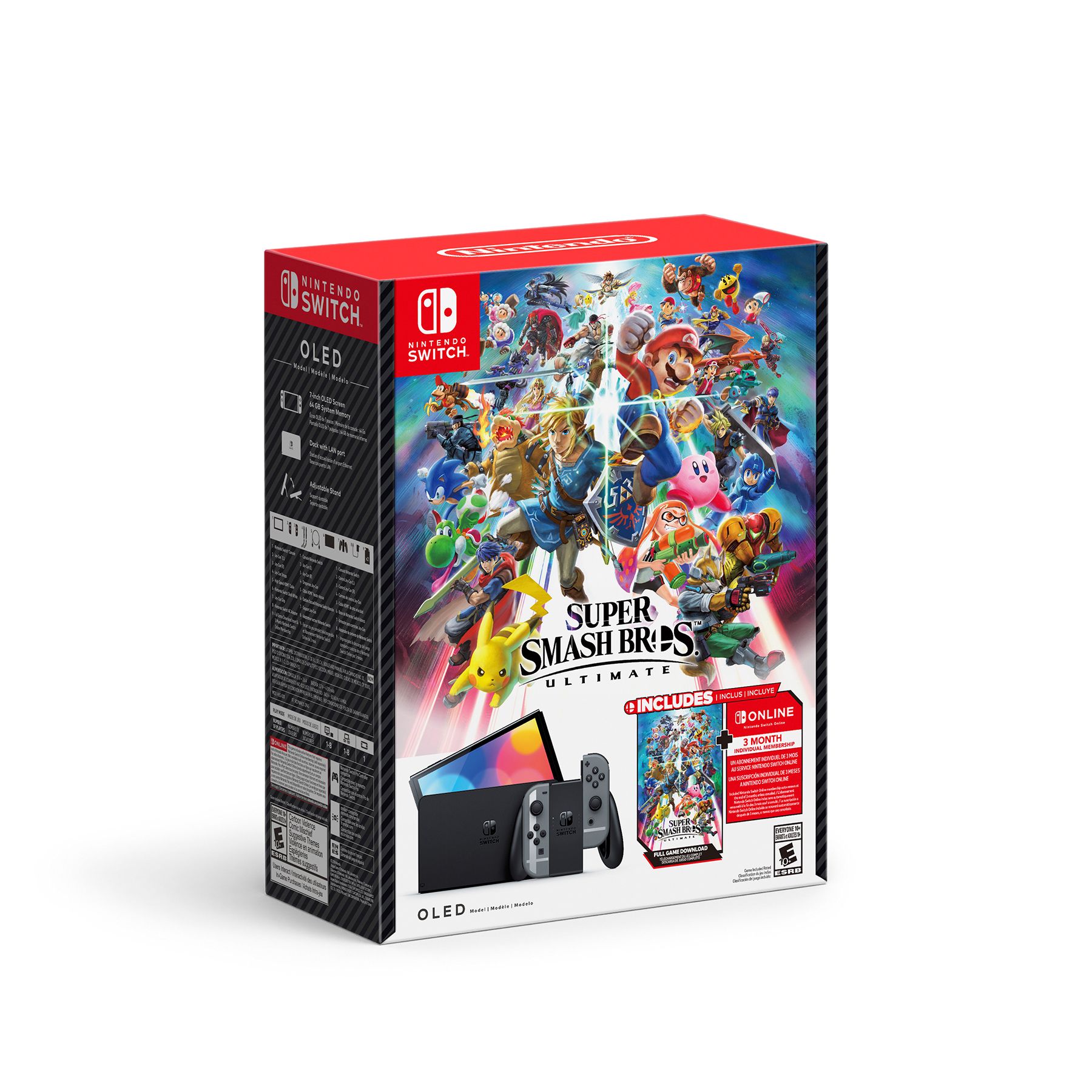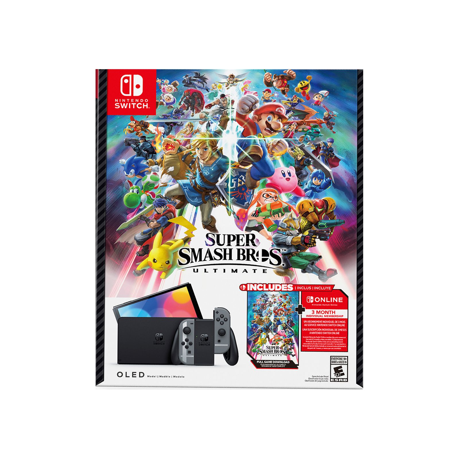 Includes Nintendo Switch OLED console, OLED model dock, Joy-Con (L + R) Super Smash Bros. Ultimate, wrist straps, Joy-Con grip, HDMI cable, AC adapter, download code for full Super Smash Bros. Ultimate game, redemption code for three-month NSO individual membership