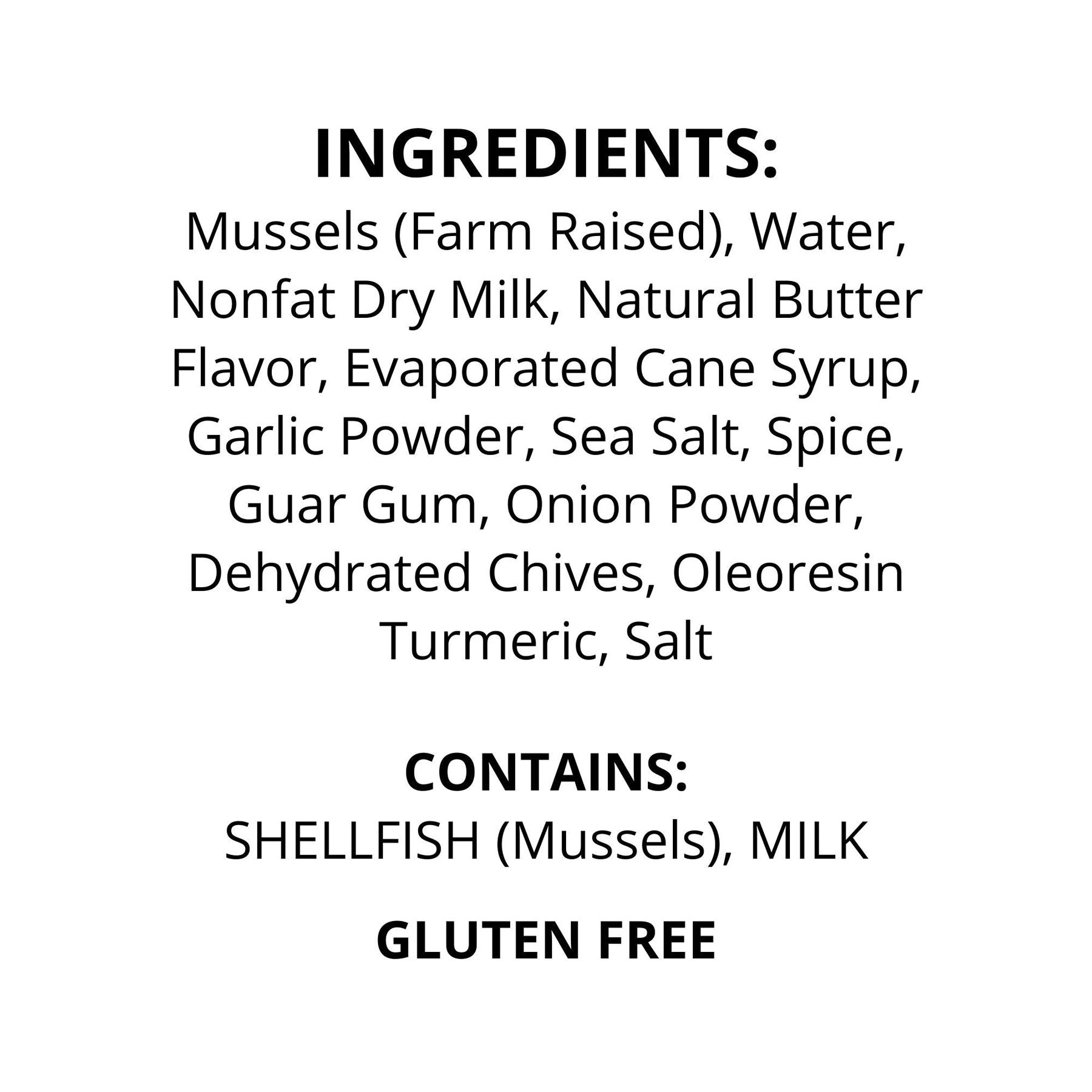 Ingredients: Organic Mussels (Farm Raised), Water, Nonfat Dry Milk, Natural Butter Flavor, Corn Starch, Evaporated Cane Syrup, Garlic Powder, Sea Salt, Spice, Guar Gum, Onion Powder, Dehydrated Chives, Oleoresin Turmeric, Salt.