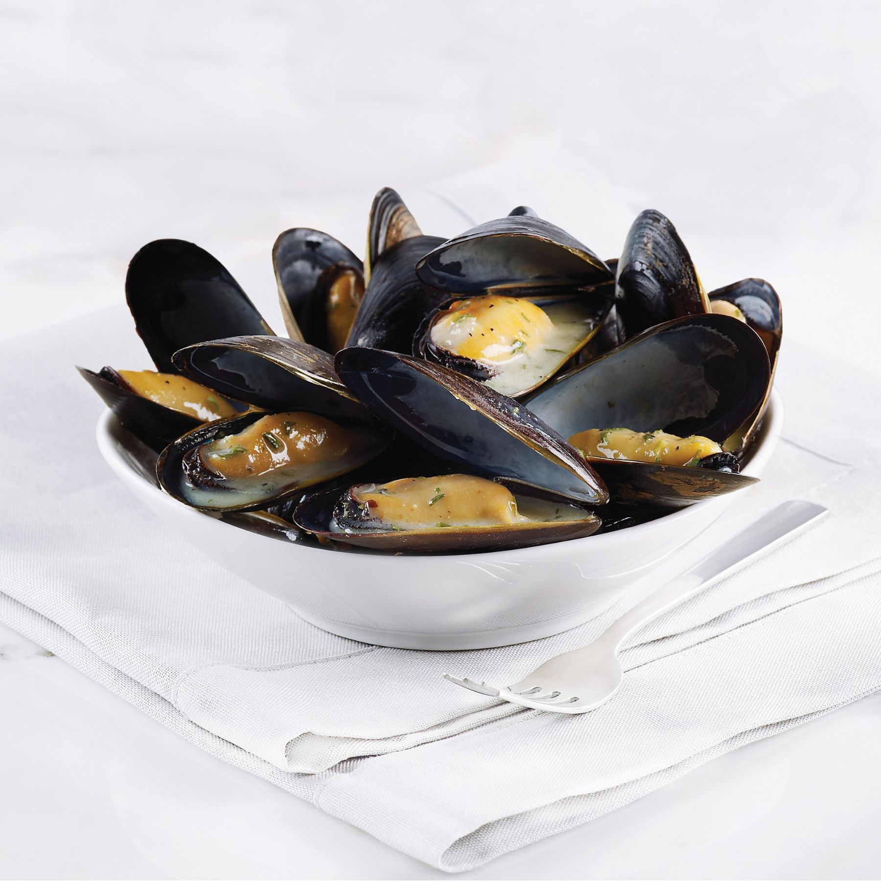 Includes frozen mussels in garlic butter sauce, 2 lbs.
