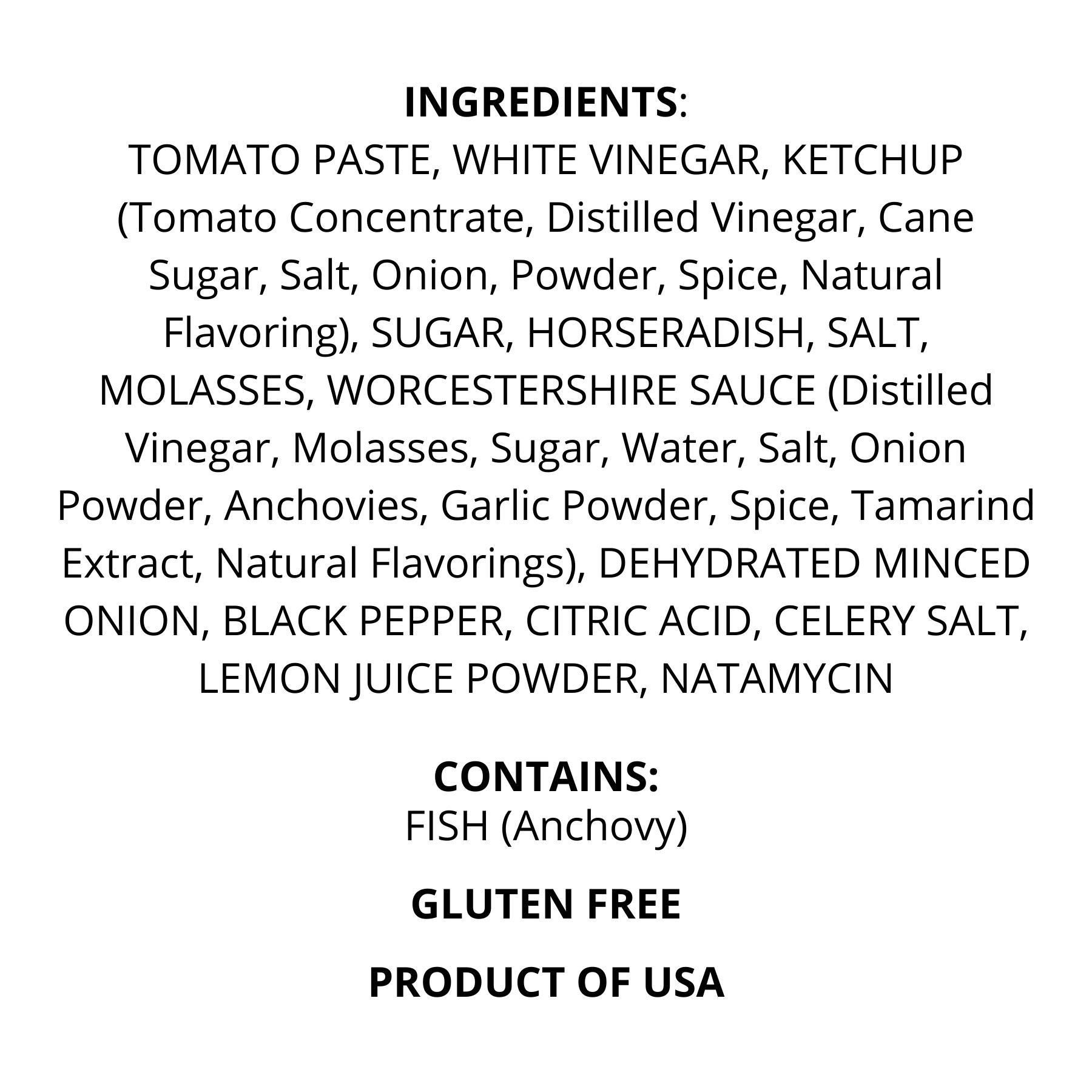 Ingredients: Tomato Paste, White Vinegar, Ketchup, Sugar, Horseradish, Salt, Molasses, Worcestershire Sauce, Onion Minced Dehydrated, Pepper Black, Citric Acid, Celery Salt, Lemon Juice Powder, Natamycin.