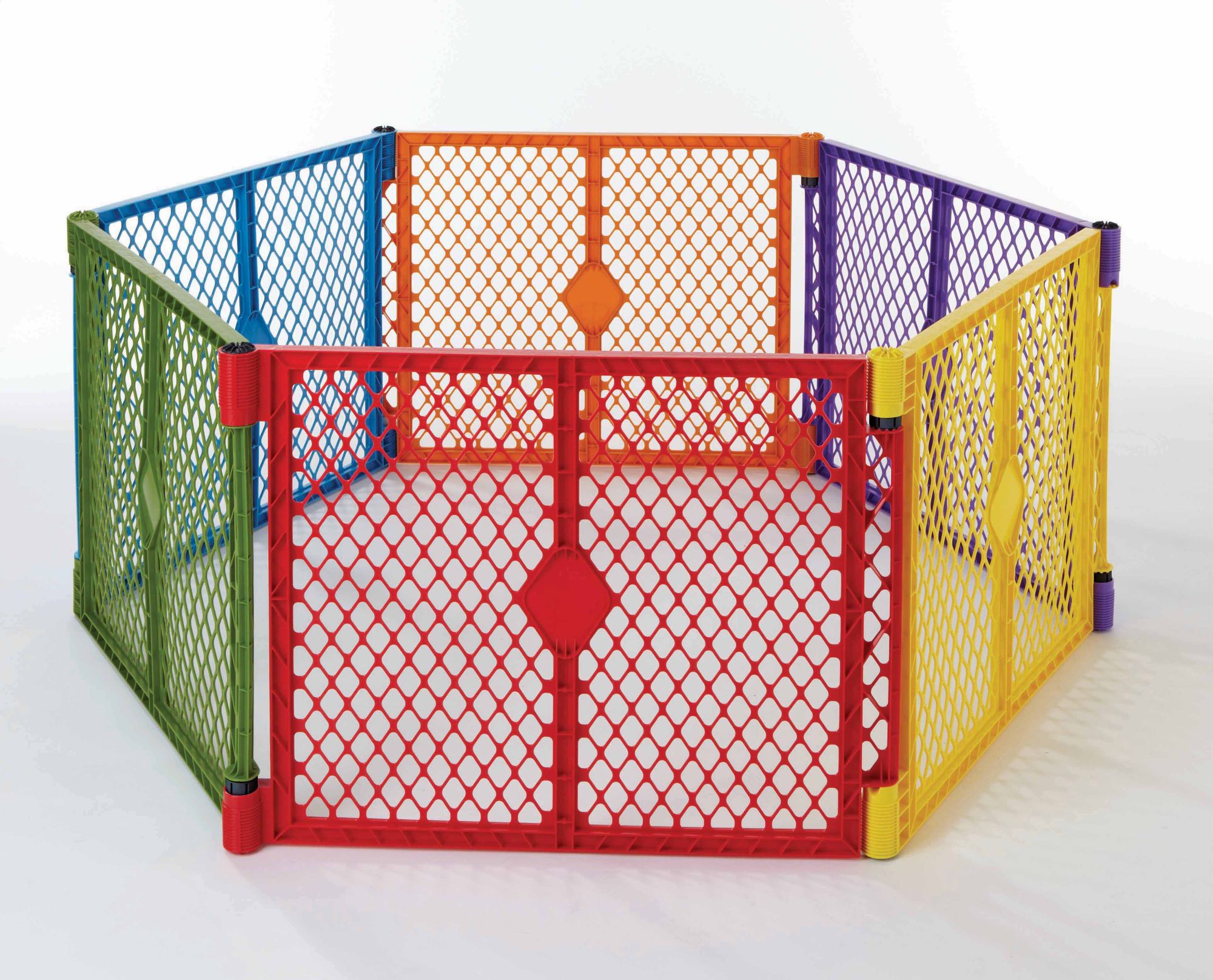The Super Color Play Yard is an excellent solution to providing a safe play area for your child. The six removable and adjustable panels are 26" high and enclose up to 18.5 sq. ft. Want to fit this play area into a smaller space? Just remove two panels to make a square shape. Use indoors or outdoors on any surface; the non-slip pads won't scratch.