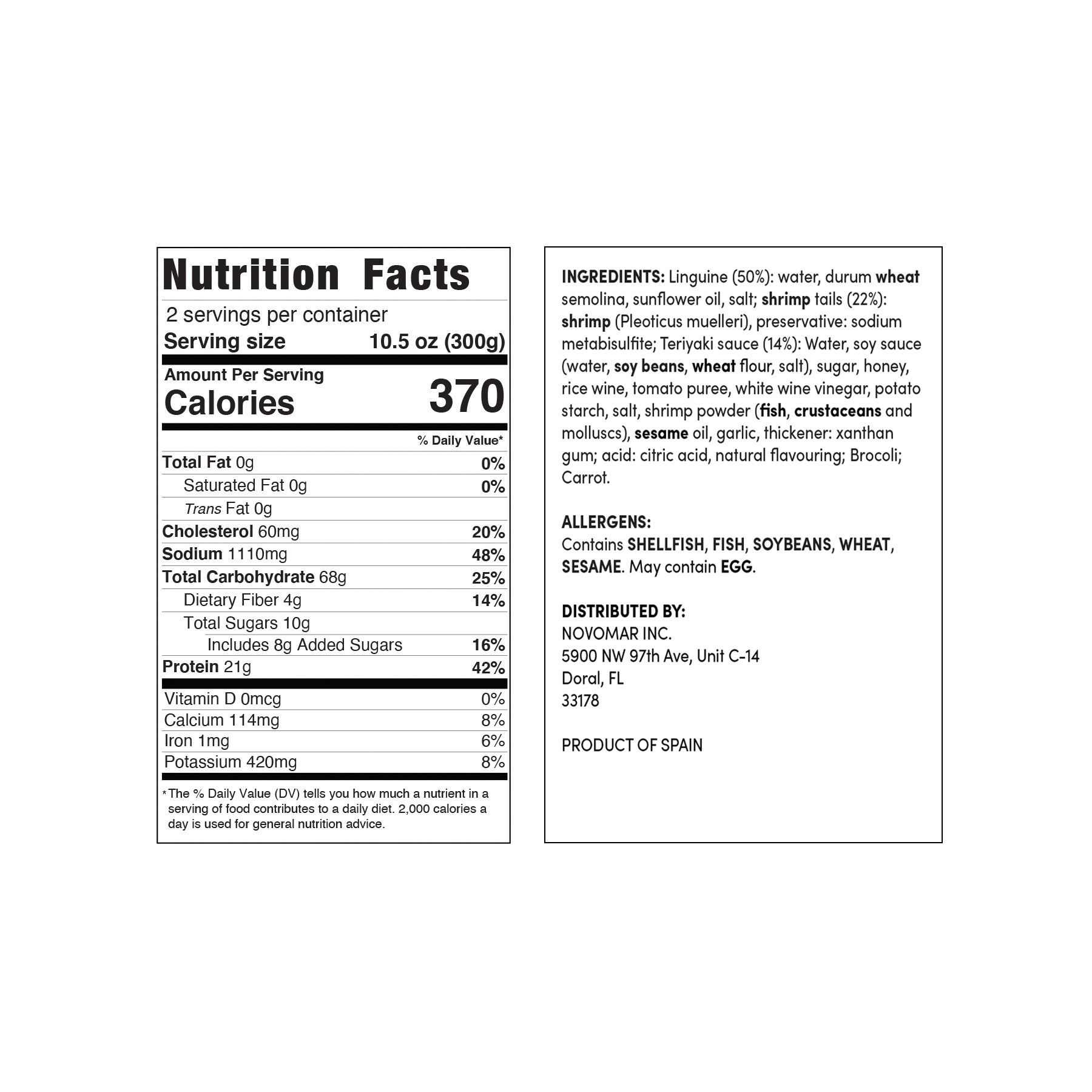 Ingredients: Linguine (50%): Water, Durum Wheat Semolina, Sunflower Oil, Salt; Shrimp Tails (22%): Shrimp (Pleoticus Muelleri), Preservative: Sodium Metabisulfite; Teriyaki Sauce (14%): Water, Soy Sauce (Water, Soybeans, Wheat Flour, Salt), Sugar, Honey, Rice Wine, Tomato Paste, White Wine Vinegar, Potato Starch, Salt, Shrimp Powder (Fish, Crustaceans And Molluscs), Sesame Oil, Garlic, Thickener: Xanthan Gum; Acid: Citric Acid, Natural Flavor; Broccoli; Carrot.