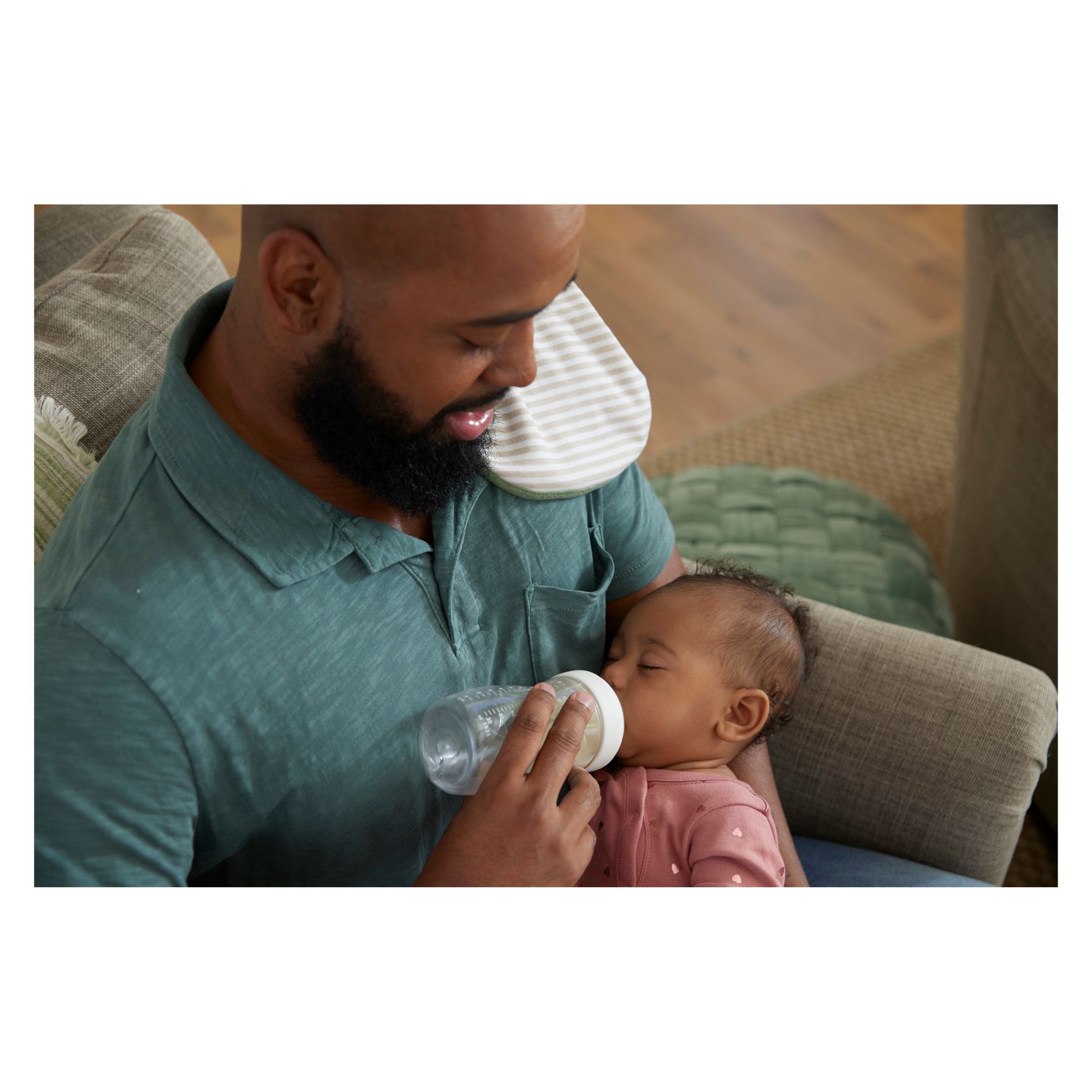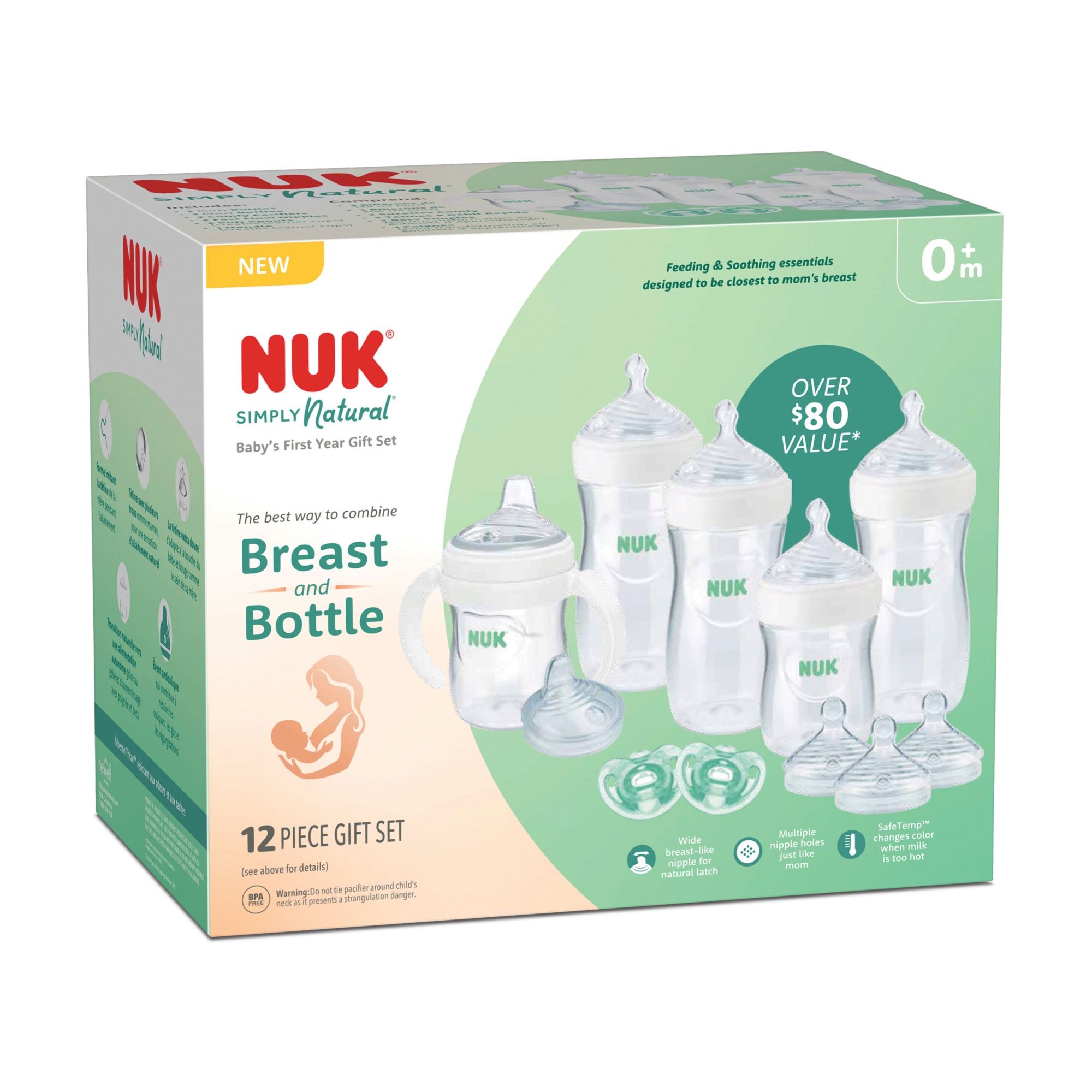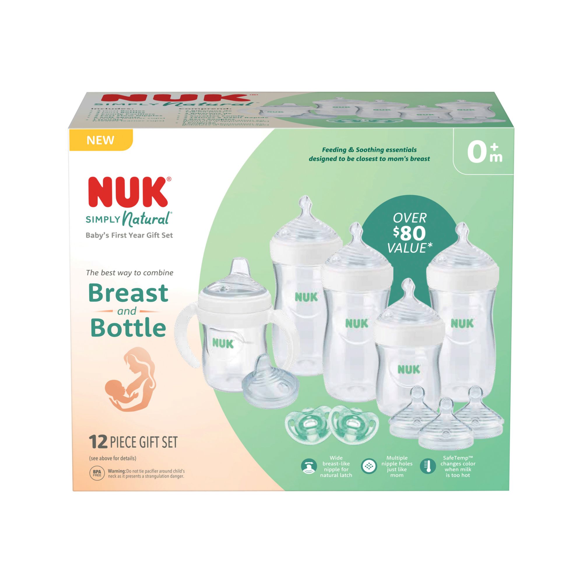 Get ready for baby's first year with the NUK Simply Natural Bottles with SafeTemp 12-Piece Gift Set. Designed to mimic the fit, flow, and movement of mom as closely as possible, Simply Natural Bottles are the only bottles with up to 9 nipple holes, just like mom. This provides a natural feeding experience to ensure the mom-baby bond remains strong. The super-soft nipple mimics the shape of mom's breast while breastfeeding and allows space for baby's tongue and jaw to move like they do when breastfeeding. NUK Simply Natural bottles feature SafeTemp technology temperature indicator, which fades when milk is too hot and reappears when milk has cooled and is safe to drink. This 12-piece set includes two 5 oz. bottles, three 9 oz. bottles, two orthodontic comfy pacifiers, and two fast flow nipples, as well as two cup spouts and one handle to create a transition cup.