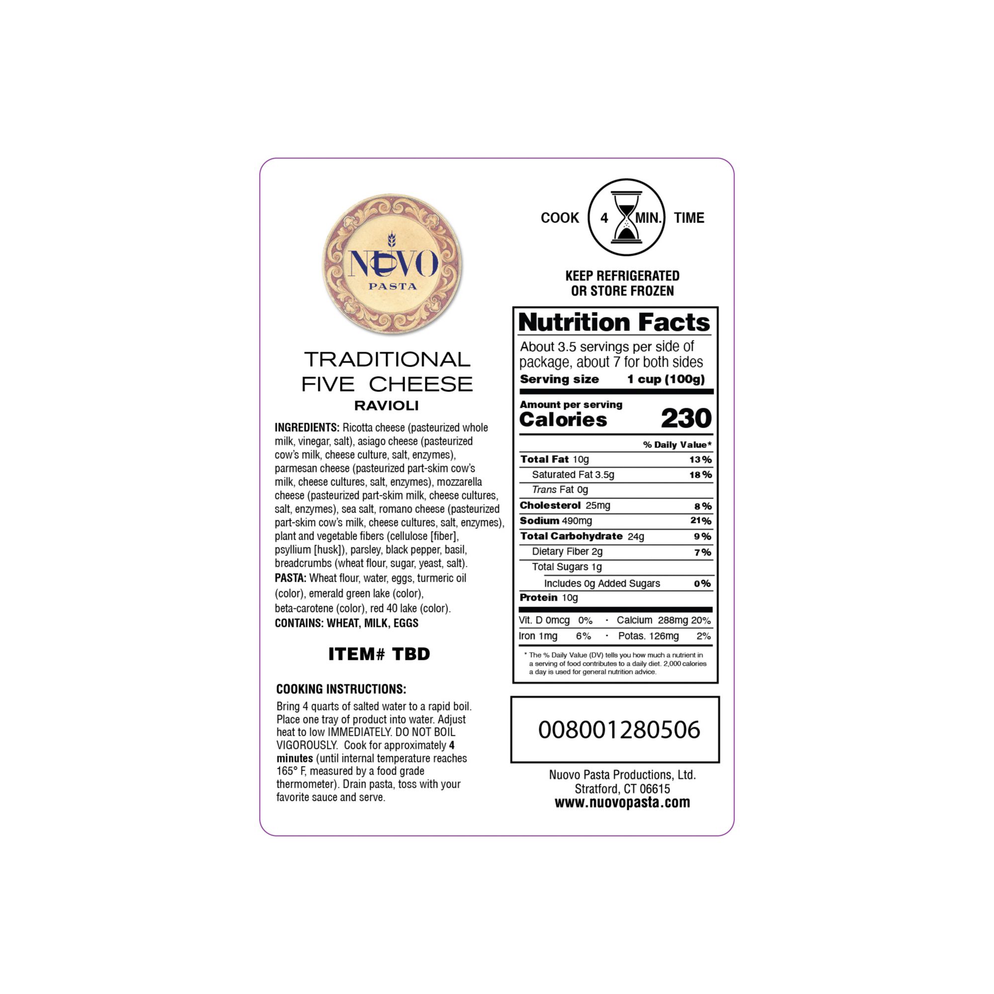 Ingredients Ricotta Cheese (Pasteurized Whole Milk, Vinegar, Salt), Asiago Cheese (Pasteurized Cow’s Milk, Cheese Culture, Salt, Enzymes), Parmesan Cheese (Pasteurized Part-skim Cow’s Milk, Cheese Cultures, Salt, Enzymes), Mozzarella Cheese (Pasteurized Part-skim Milk, Cheese Cultures, Salt, Enzymes), Sea Salt, Romano Cheese (Pasteurized Part-skim Cow’s Milk, Cheese Cultures, Salt, Enzymes), Plant And Vegetable Fibers (Cellulose [Fiber], Psyllium [Husk]), Parsley, Black Pepper, Basil, Breadcrumbs (Wheat Flour, Sugar, Yeast, Salt). Pasta: Wheat Flour, Water, Eggs, Turmeric Oil (Color), Emerald Green Lake (Color), Beta-carotene (Color), Red 40 Lake (Color). Contains: Wheat, Milk, Eggs.