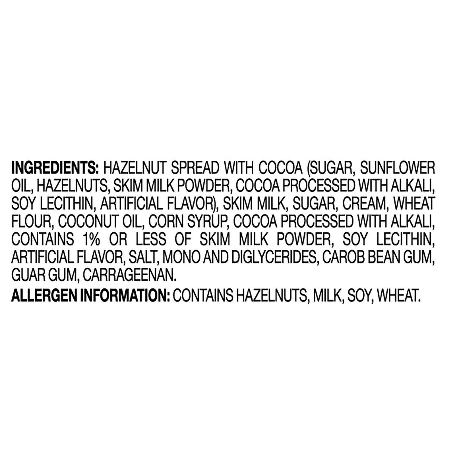 Ingredients: Hazelnut Spread with Cocoa (Sugar, Sunflower Oil, Hazelnuts, Skim Milk Powder, Cocoa Processed with Alkali, Soy Lecithin, Artificial Flavor), Skim Milk, Sugar, Cream, Wheat Flour, Coconut Oil, Corn Syrup, Cocoa Processed with Alkali, Contains 1% or less of Skim Milk Powder, Soy Lecithin, Artificial Flavor, Salt, Mono and Diglycerides, Carob Bean Gum, Guar Gum, Carrageenan.