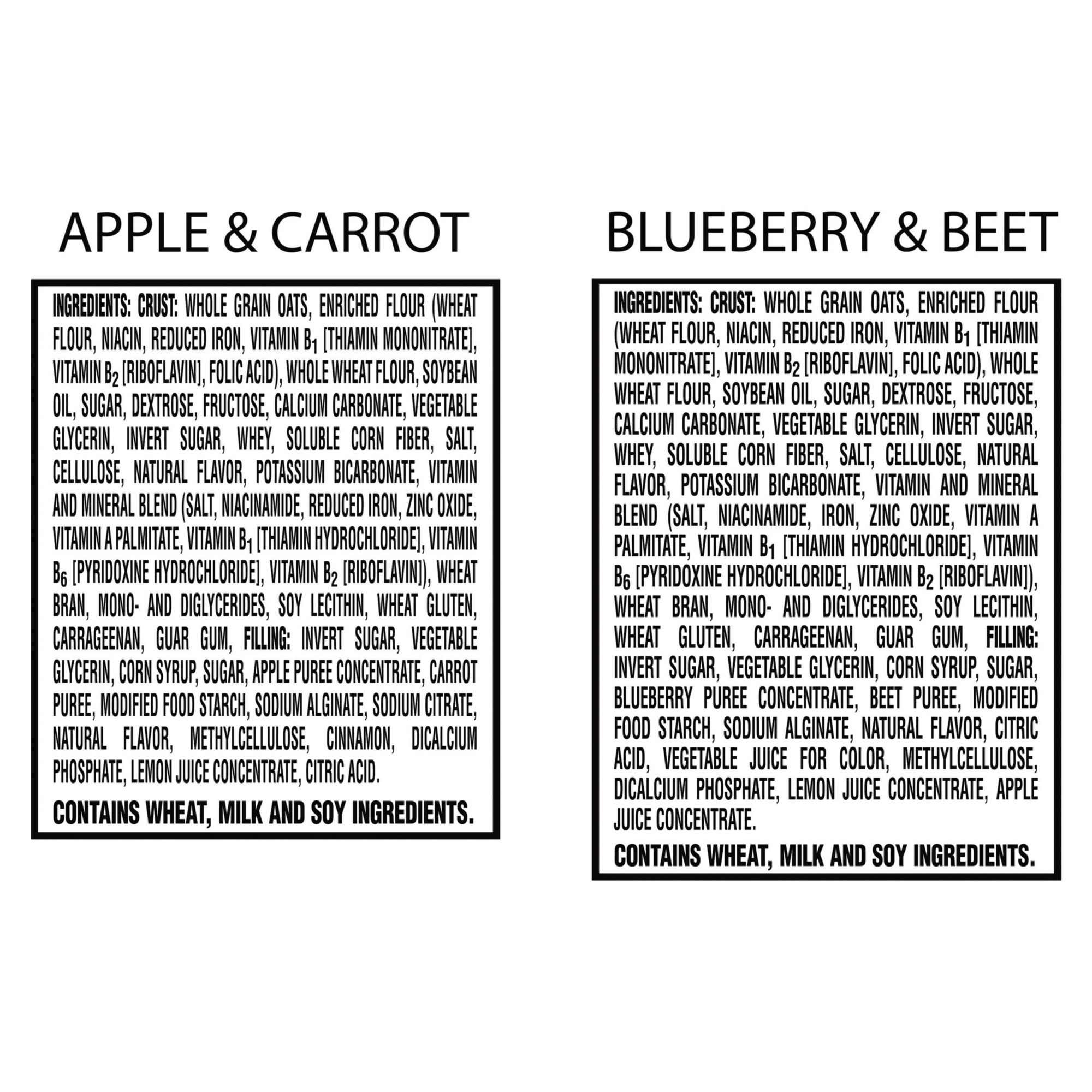 Ingredients: Whole Grain Oats, Enriched Flour (Wheat Flour, Niacin, Reduced Iron, Vitamin B1 [Thiamin Mononitrate], Vitamin B2 [Riboflavin], Folic Acid), Whole Wheat Flour, Soybean Oil, Sugar, Dextrose, Fructose, Calcium Carbonate, Vegetable Glycerin, Invert Sugar, Whey, Soluble Corn Fiber, Salt, Cellulose, Natural Flavor, Potassium Bicarbonate, Vitamin And Mineral Blend (Salt, Niacinamide, Reduced Iron, Zinc Oxide, Vitamin A Palmitate, Vitamin B1 [Thiamin Hydrochloride], Vitamin B6 [Pyridoxine Hydrochloride], Vitamin B2 [Riboflavin]), Wheat Bran, Mono- And Diglycerides, Soy Lecithin, Wheat Gluten, Carrageenan, Guar Gum, Filling: Invert Sugar, Vegetable Glycerin, Corn Syrup, Sugar, Apple Puree Concentrate, Carrot Puree, Modified Food Starch, Sodium Alginate, Sodium Citrate, Natural Flavor, Methylcellulose, Cinnamon, Dicalcium Phosphate, Lemon Juice Concentrate, Citric Acid.