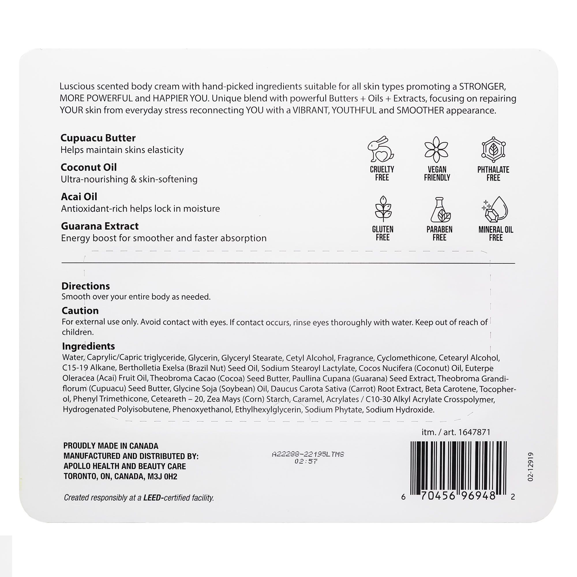 Nutrius Brazilian Body Butter Cream that is Infused With Cupuacu Butter+coconut Oil+acai Oil+guarana Extract Net Weight 2x6 fl. oz. Luscious scented body cream with hand-picked ingredients suitable for all skin types promotes a stronger, more powerful, and Happier you. A unique blend with powerful butters+oils+extracts. Focuses on repairing your everyday stressed skin and reconnecting you with a vibrant, youthful, and smoother appearance.