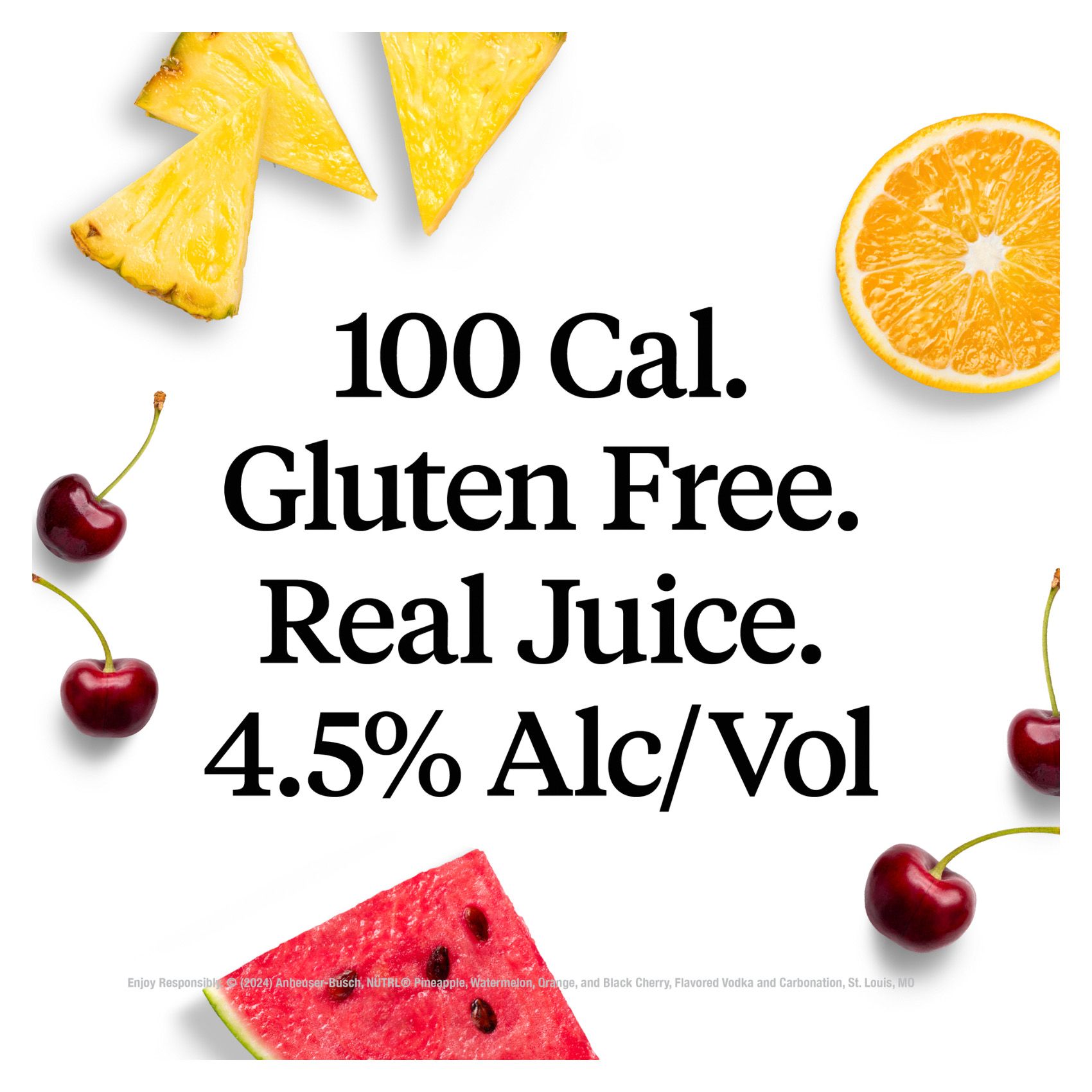 Nutrl Real Fruit Juice Vodka Seltzer is an easy-to-drink hard seltzer that combines vodka with a deliciously fruity twist. This spiked seltzer variety pack includes flavored hard seltzers of watermelon seltzer, orange seltzer, black cherry seltzer and pineapple seltzer. These alcoholic beverages are made with refreshingly simple, tasty and uncomplicated ingredients like vodka, seltzer water, and real fruit juice. It's that simple and it's even more refreshing. Nutrl Vodka Seltzer fruit drinks are gluten free with natural flavors, no added sugar, and 100 calories. These gluten free alcohol drinks have a 4.5% ABV and can be enjoyed cold or over ice right out of the can. No matter how you prefer it, these sugar free drinks are down right delicious, and the slim cans of Nutrl seltzer are easy to hold, store and transport wherever the party goes whether you need crisp alcohol beverages or simple zero sugar drinks that can be enjoyed year-round, no matter the season. Real Vodka. Real Juice. Enjoy Nutrl Responsibly.