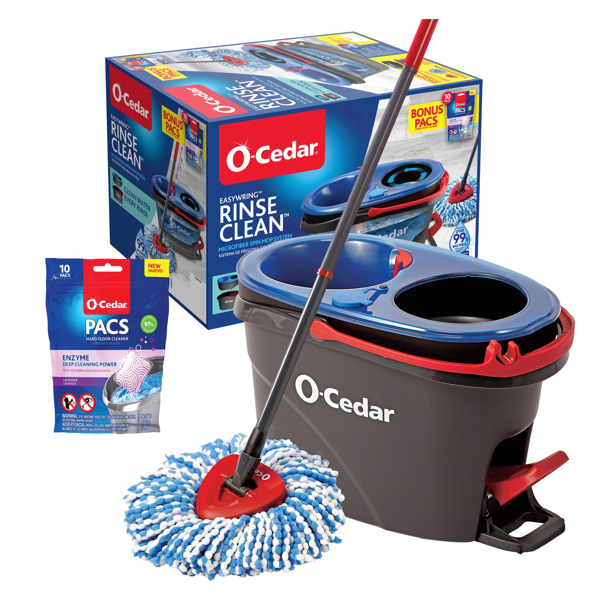 The perfect pairing in cleaning chemistry, the O-Cedar EasyWring RinseClean Spin Mop & Bucket System and Lavender O-Cedar PACS Hard Floor Cleaner deliver a spotless clean. The RinseClean Spin Mop features an innovative two-bucket system to separate clean and dirty water, so you’re always mopping with clean water. It’s equipped with a foot-activated pedal for easy, hand-free cleaning, and a genuine, microfiber mop head that’s washable and reusable. Use with O-Cedar PACS, a perfectly-portioned enzyme cleaner, specifically designed for mopping. PACS take the guesswork out of measuring and deliver a powerful clean with no harsh chemicals. Naturally derived enzymes target stubborn dirt and grime and dissolve it away. And with the soothing scent of lavender, your senses get a pick-me-up too.