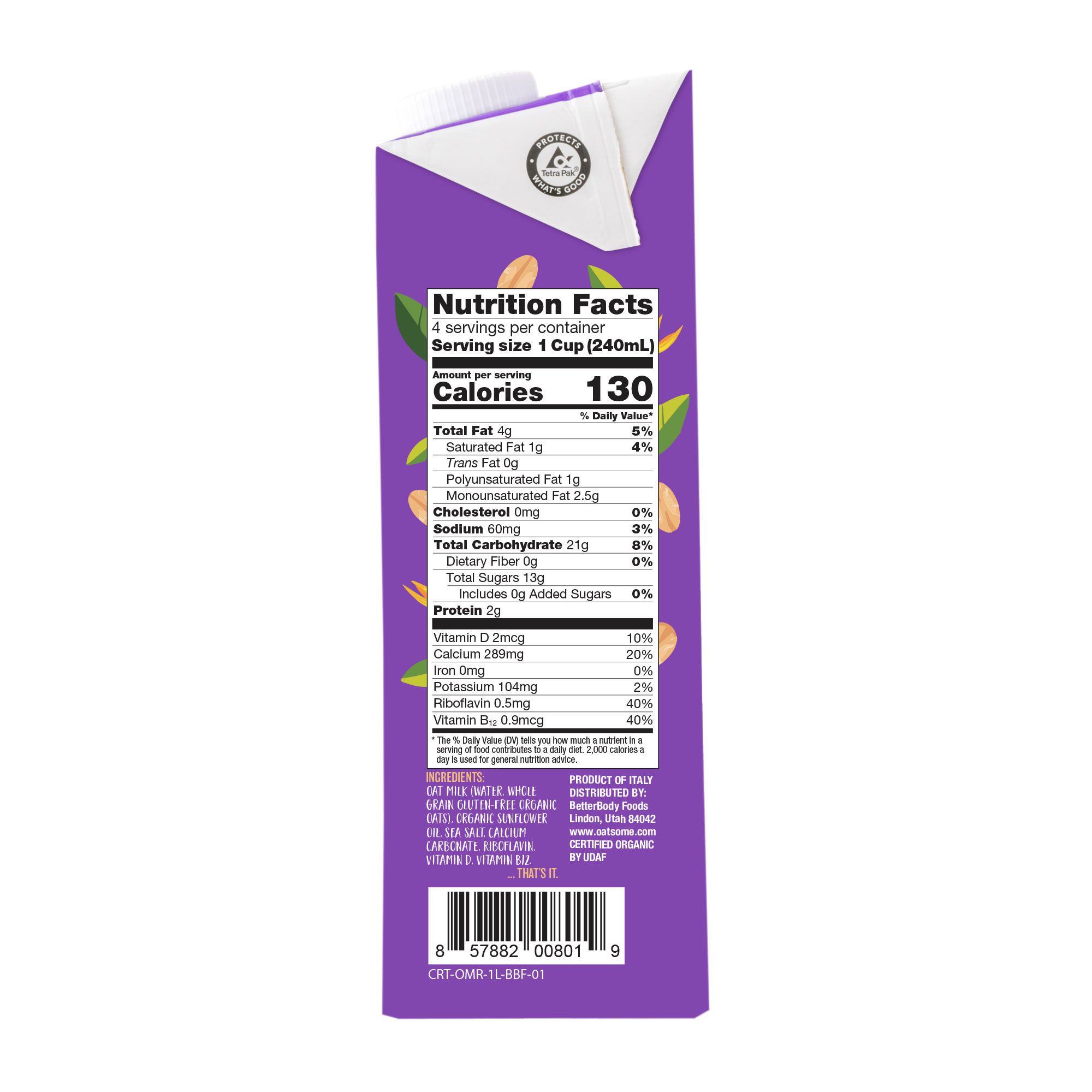 Oatmilk (Water, Organic Gluten-Free Oats), Organic Sunflower Oil, Sea Salt, Calcium Carbonate, Riboflavin, Vitamin D, Vitamin B12