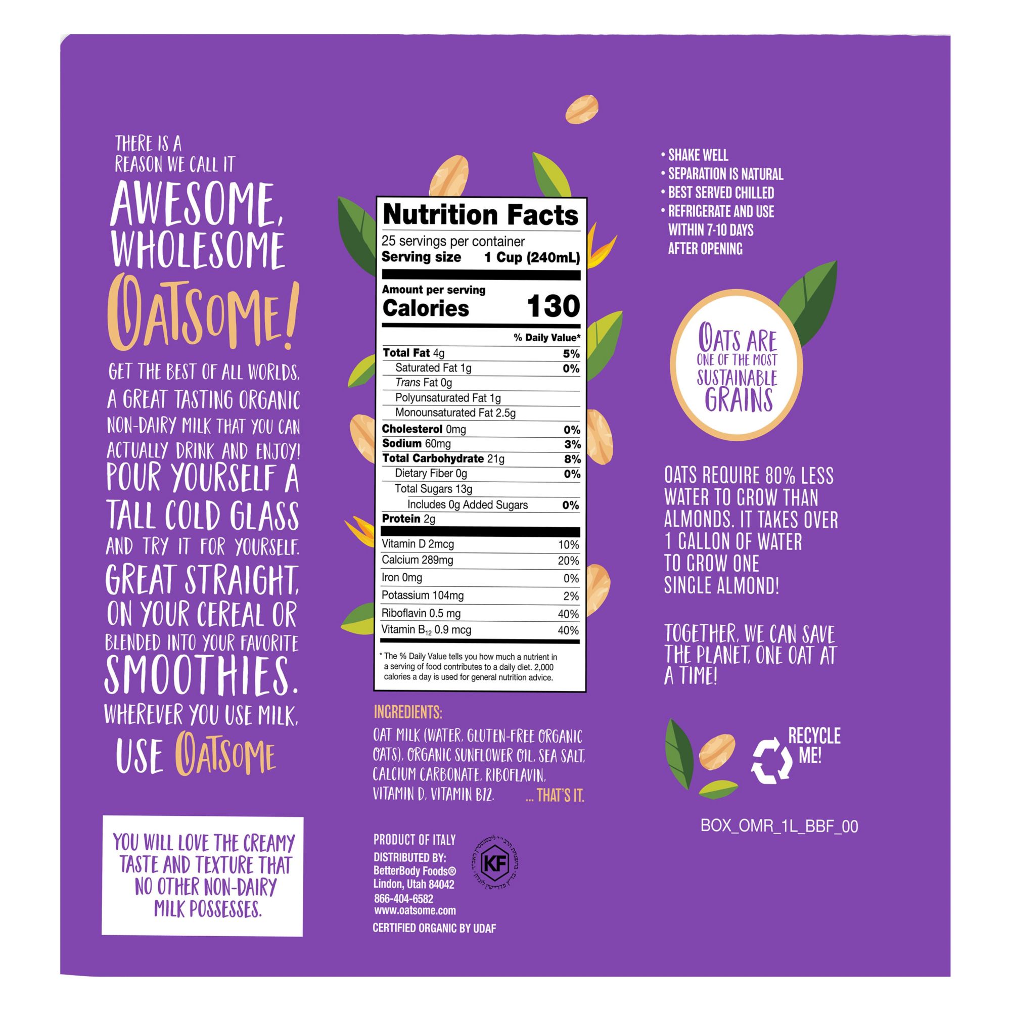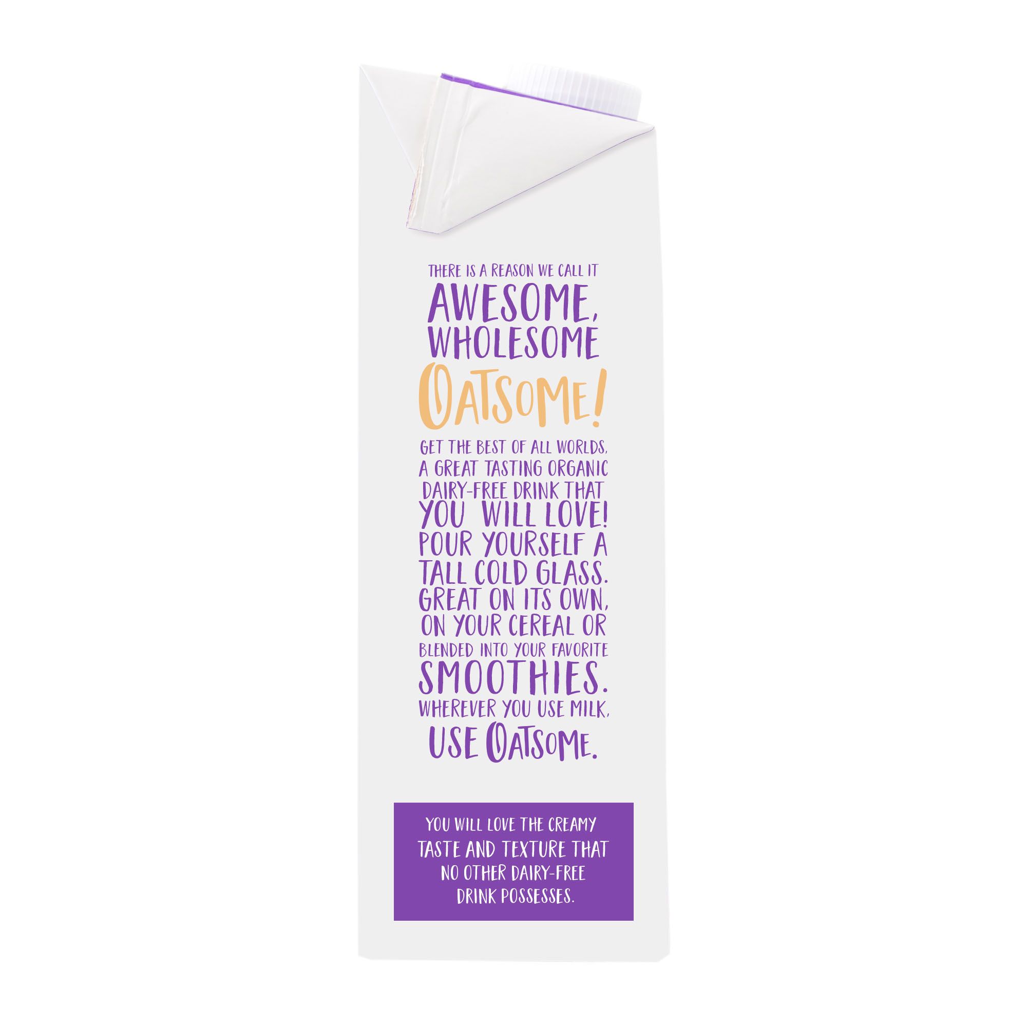 Oatsome Organic Oatmilk is a deliciously drinkable, fantastically frothable and without dairy, nuts, added sugars or anything artificial. You can drink oat milk, bake with it and enjoy the taste wherever you use milk. Delicious non-dairy goodness in every sip. Get the best of all worlds, a great tasting organic milk alternative that you can actually drink and enjoy. It’s deliciously drinkable, fantastically frothable and without dairy, nuts, added sugars or anything artificial. Enjoy the taste wherever you use milk. Simply try Oatsome by itself, with cereal or blended into your favorite smoothie, and its creamy taste and texture will rock your world.