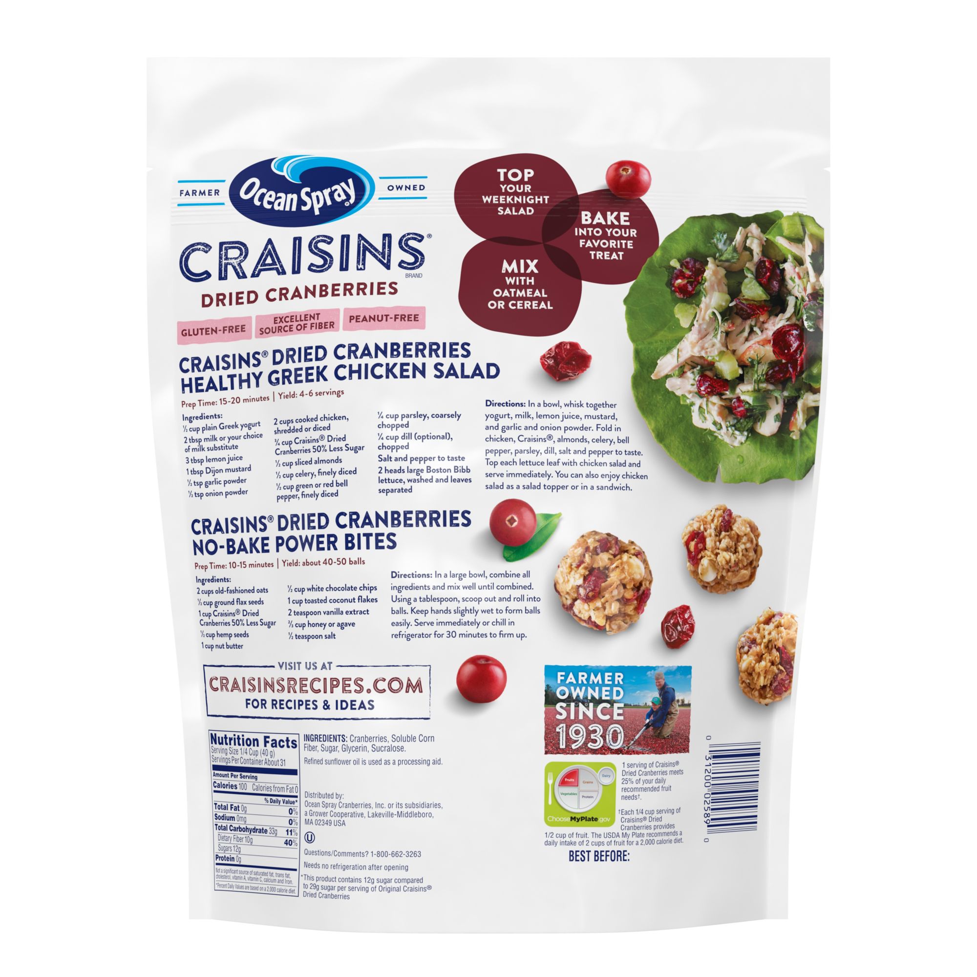 Mouth-watering flavor. 50% less sugar*. Ocean Spray Craisins 50% Less Sugar Dried Cranberries. The cranberries you love, half the sugar* than the Original Craisins Dried Cranberries. Enjoy the benefits of cranberry, even more. This cranberry dried fruit product is great for snacking, with only 100 calories per serving. An easy way to work in 25% of your daily recommended fruit needs**. No artificial flavors or preservatives. Enjoy real, bold dried cranberries in every dried fruit pouch. Potent little puckers that are peanut-free, gluten-free and judgment-free. Top your weeknight salads. Mix them in your oatmeal or cereal. Use as baking ingredients in your favorite treats, like chewy dried cranberry oatmeal chocolate chunk cookies. Step up your entertaining game by adding their powerful flavor and color to apps, charcuterie boards and more. Transform boring lunches and dinners into mic-dropping meals - from chicken salad and gourmet grilled cheeses to Crockpot curry, beef stew, and even Taco Tuesdays. It's true. They're surprisingly delicious on tacos and in guacamole. Can raisins do all that? Nope. They're also just really good on their own. However you use them, don't let anything stand in the way of your Ocean Spray Craisins fix. Ocean Spray even made the bags resealable so you have fresh access and endless options. Keep sealed in a dry place to keep dried cranberries plump and fresh for longer. Ocean Spray believes in the power of the mighty cranberry; Born Tart. Raised Bold.