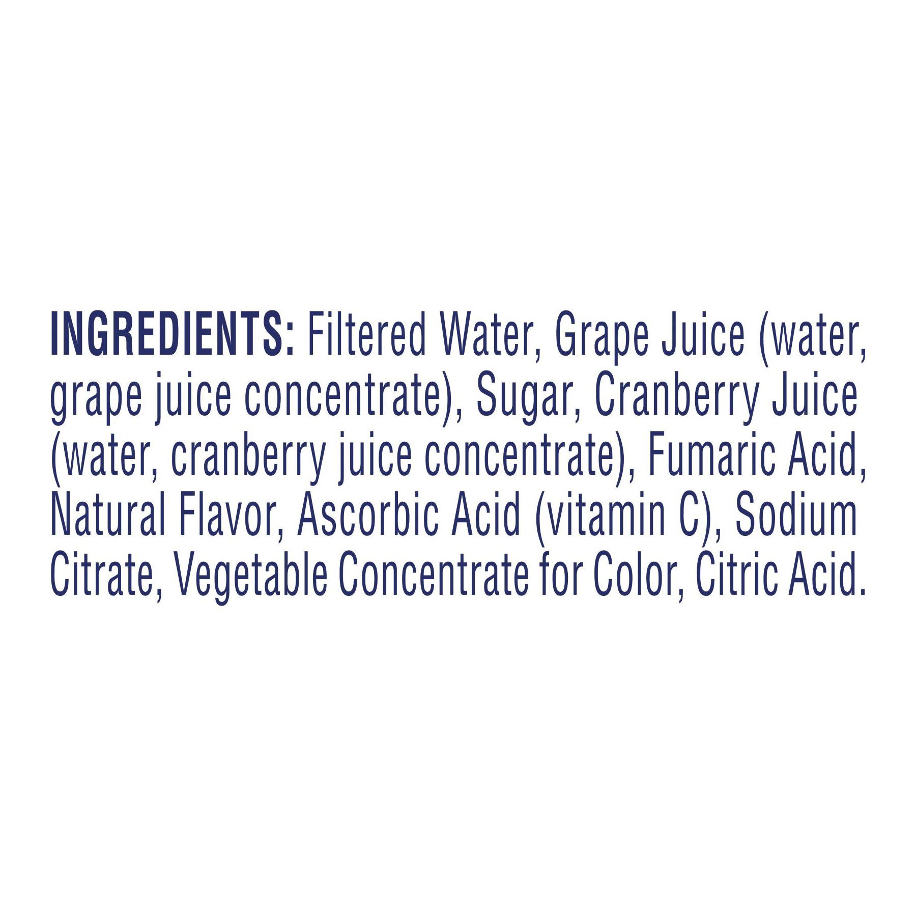 Ingredients: Filtered Water, Grape Juice (Water, Grape Juice Concentrate) Sugar, Cranberry Juice (Water, Cranberry Juice Concentrate) Fumaric Acid, Natural Flavor, Ascoric Acid ( Vitamin C) Sodium Citrate, Vegetable Concentrate For Color, Citric Acid.
