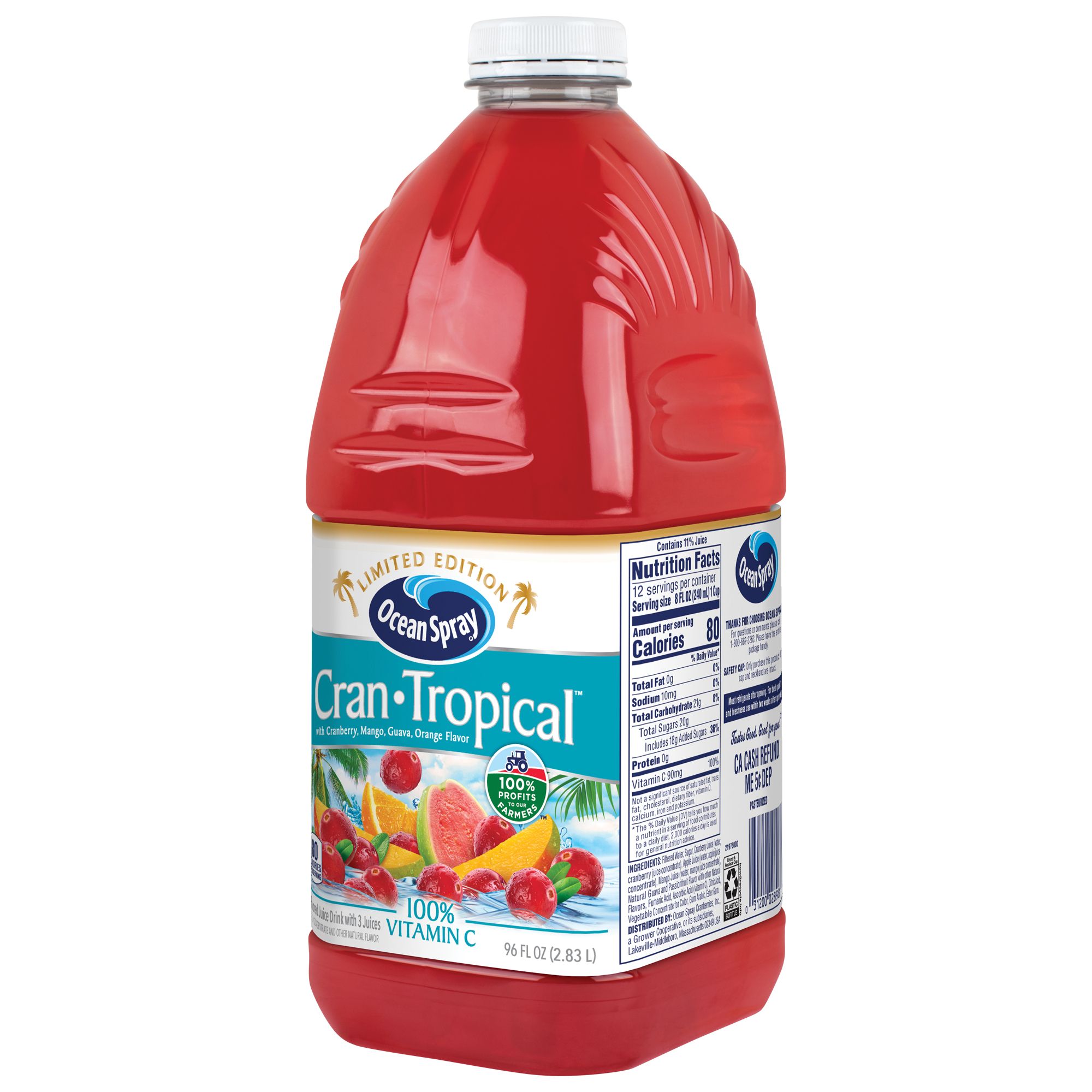 Radically refreshing. Unapologetically bold. Ocean Spray Cran-Tropical Cranberry Tropical Juice Drink has a fresh, zingy taste to quench the strongest thirst. The tropical flavors of mango, guava and orange with the crisp, tart taste of cranberries make this tropical cranberry juice beverage a bucket list item all on its own. With 100% of your recommended daily value of vitamin C and no high fructose corn syrup, this tropical drink is a full punch of flavor without compromise. Made from real fruit juice concentrate, it's low sodium and fat-free. Stir Cran-Tropical into your favorite drinks as a cocktail mixer, freeze into ice pops, or enjoy straight from the bottle. Ocean Spray won't judge. All this made possible by the 700+ cranberry farming families that make up their co-op.