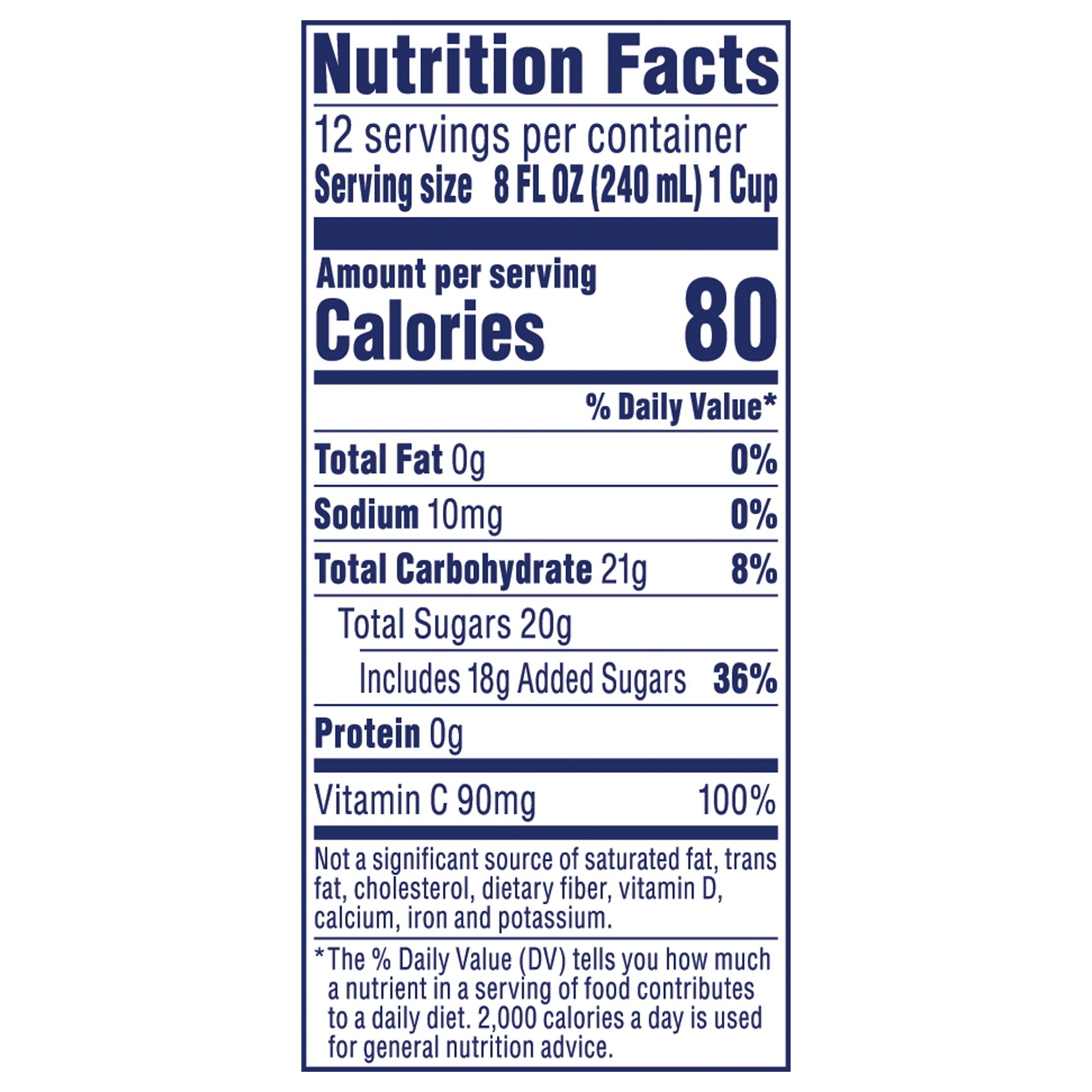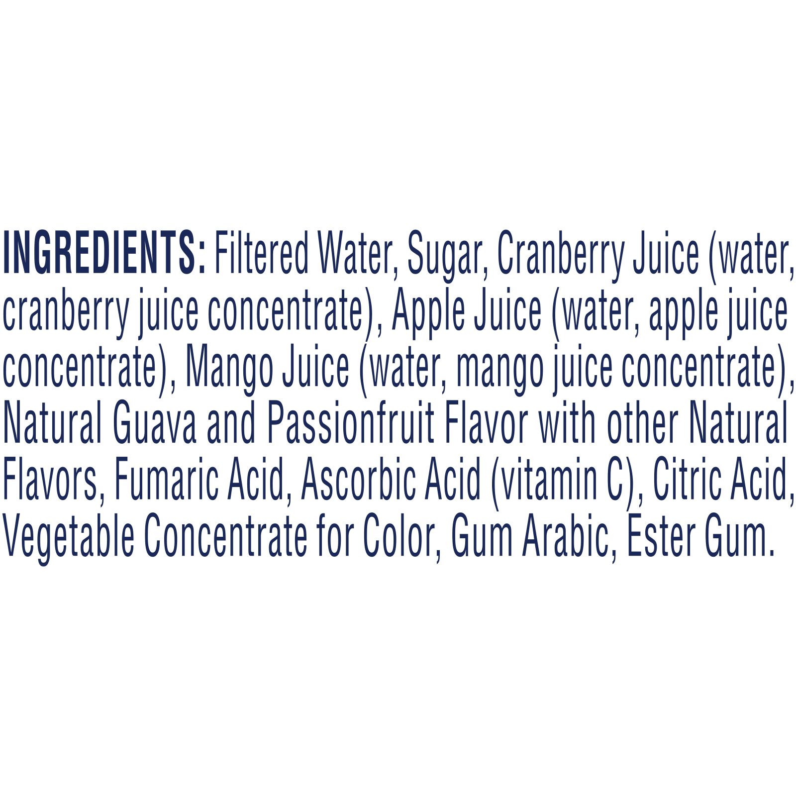 Ingredients: Filtered Water, Sugar, Cranberry Juice (Water, Cranberry Juice Concentrate), Apple Juice (Water, Apple Juice Concentrate), Mango Juice (Water, Mango Juice Concentrate), Natural Guava and Passionfruit Flavor with Other Natural Flavors, Fumaric Acid, Ascorbic Acid (Vitamin C), Citric Acid, Vegetable Concentrate for Color, Gum Arabic, Ester Gum.