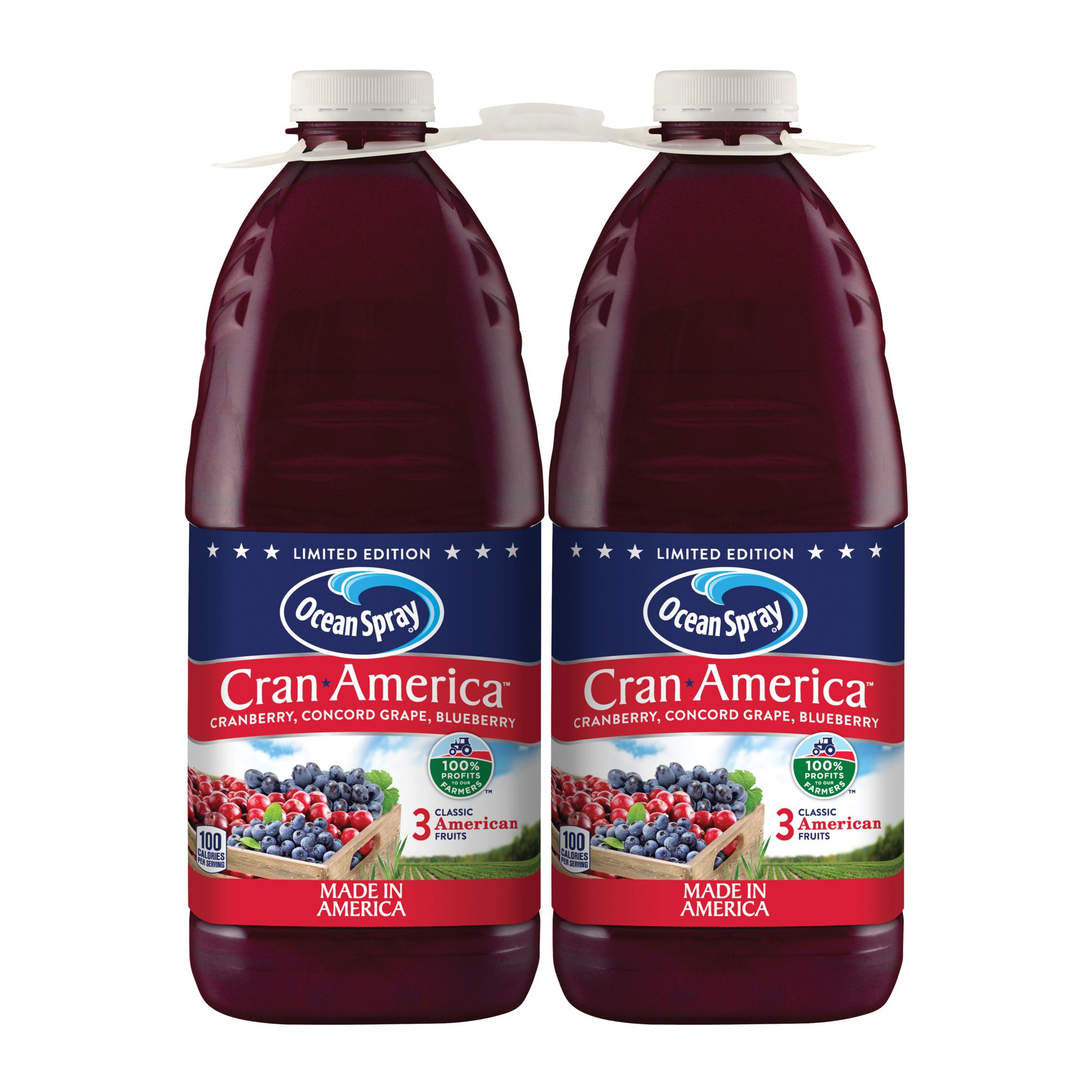 Cran-America juice drink combines three classic American fruits: cranberry, concord grape, and blueberry for a fun and patriotic drink available Summer 2019. This delicious juice is made in America, making it a perfect addition to your summer BBQ. This pack includes two 96 oz. Ocean Spray Cran-America juice.