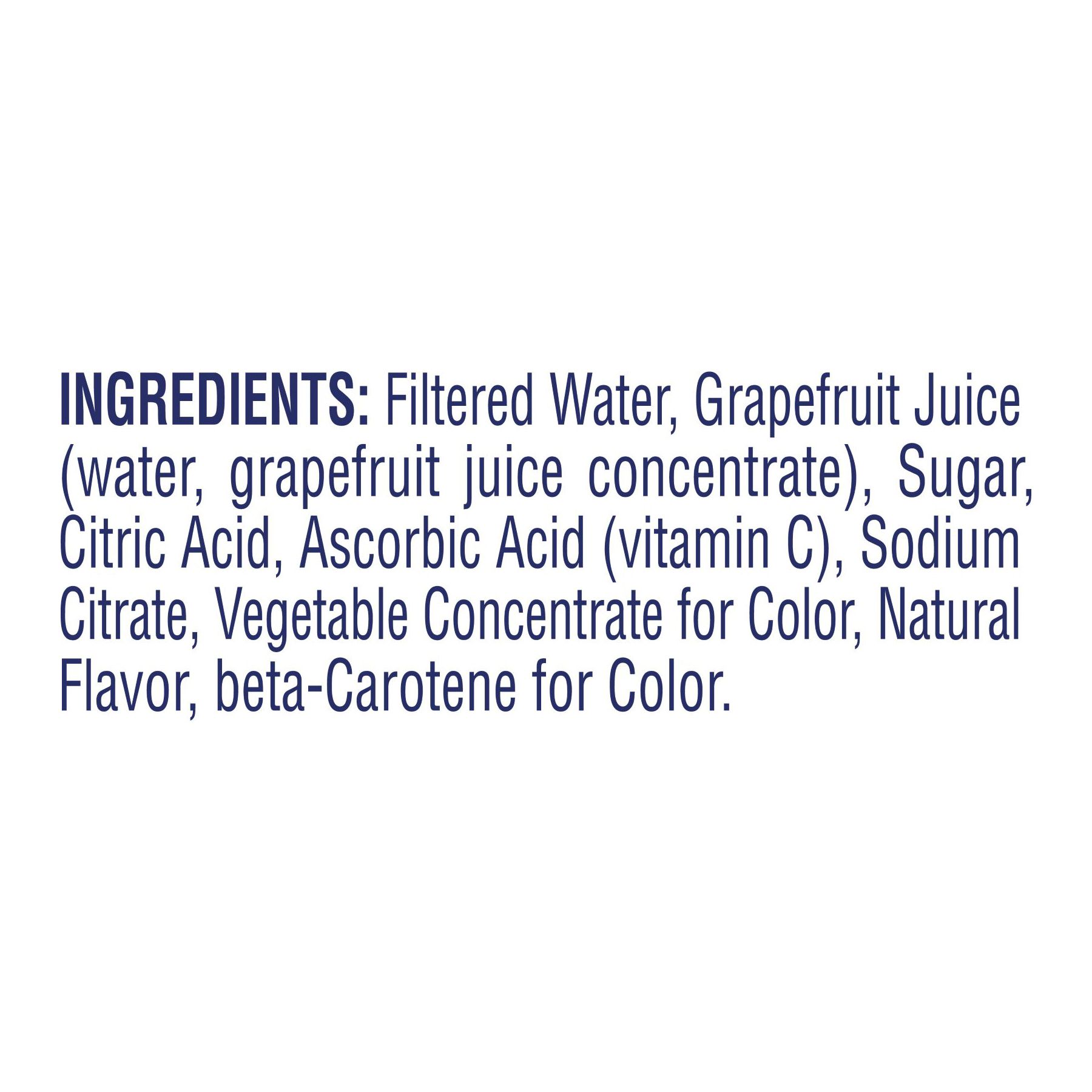 Ingredients: Filtered Water, Grapefruit Juice ( Water, Grapefruit Juice Concentrate) Sugar, Citric Acid, Ascorbic Acid ( Vitamin C) Sodium Citrate, Vegetable Concentrate For Color, Natural Flavor, Beta- Carotene For Color.