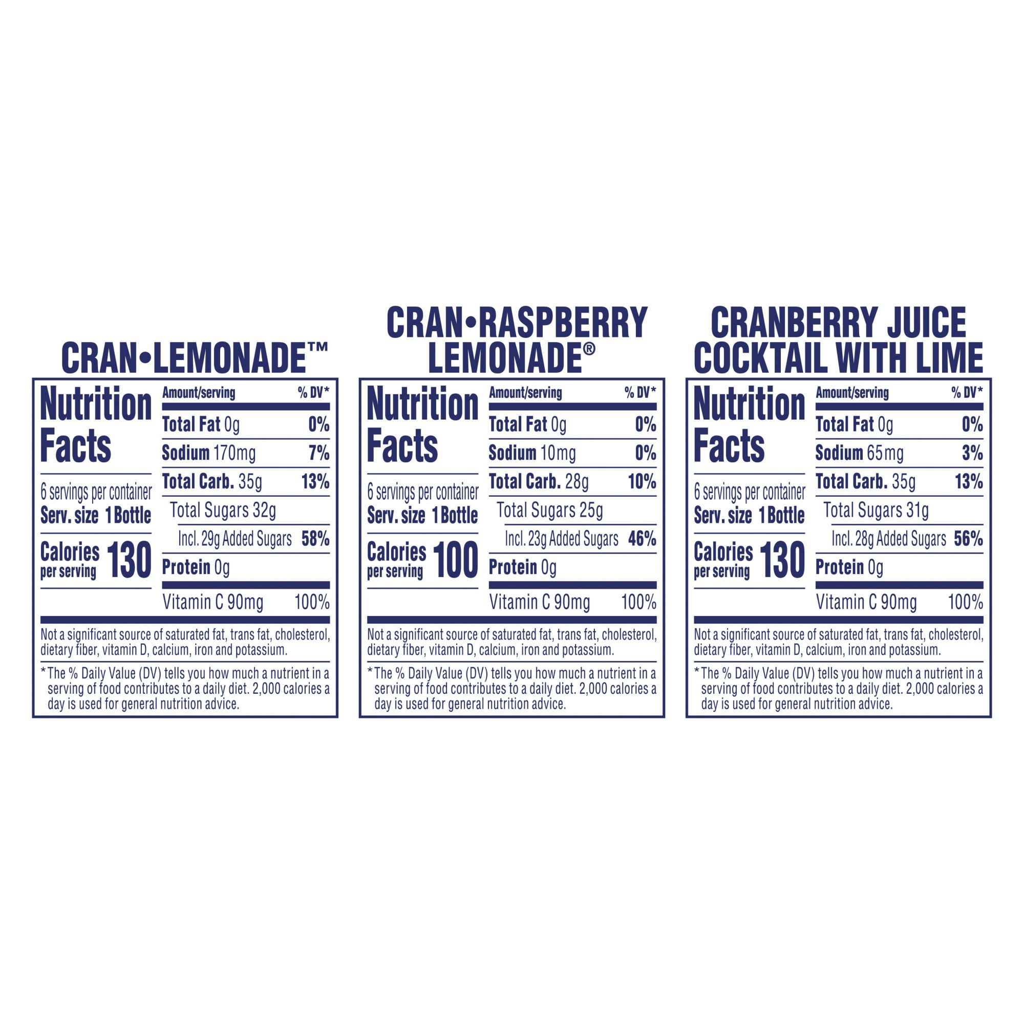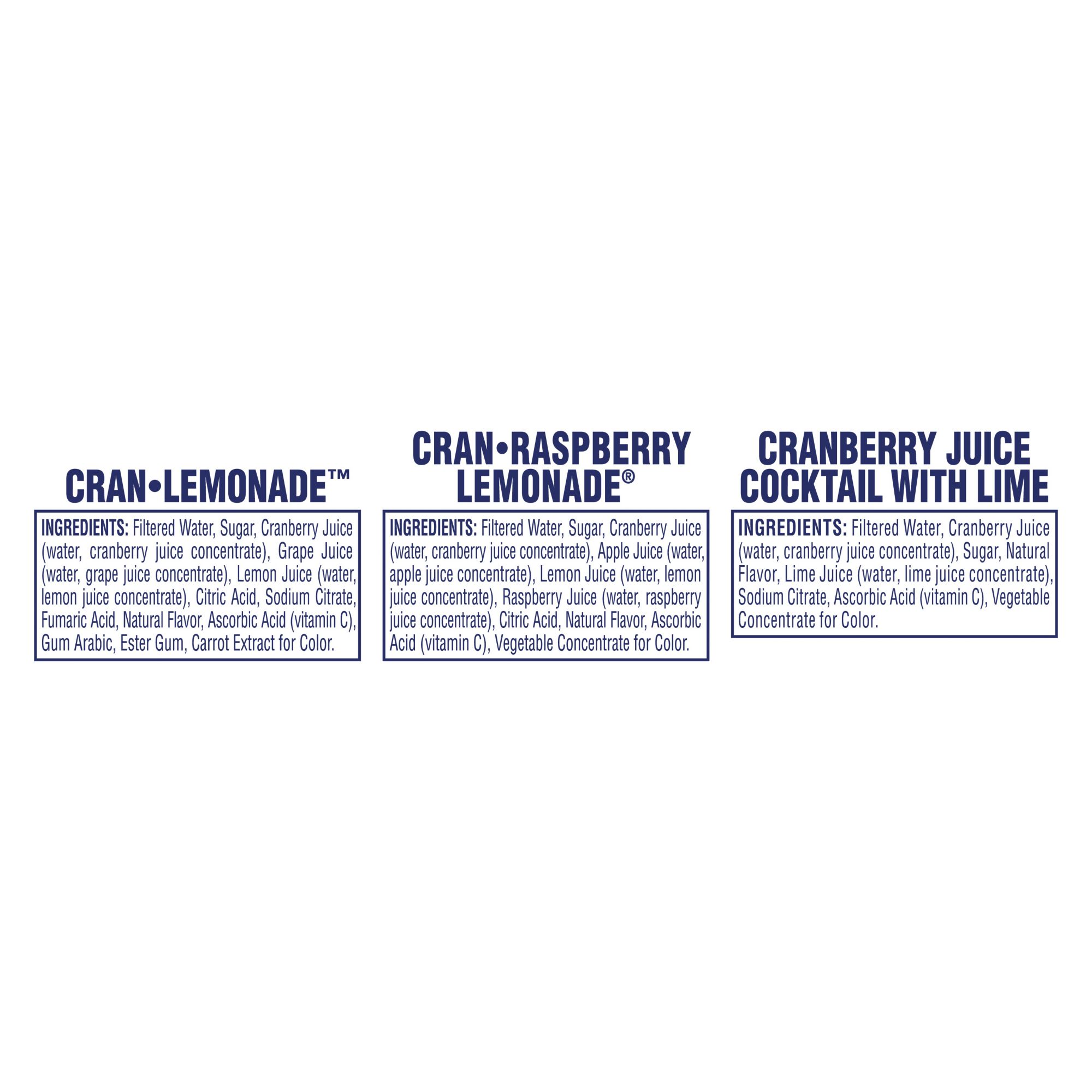 Ingredients Cran-raspberry Lemonade: Filtered Water, Sugar, Cranberry Juice (Water, Cranberry Juice Concentrate), Apple Juice (Water, Apple Juice Concentrate), Lemon Juice (Water, Lemon Juice Concentrate), Raspberry Juice (Water, Raspberry Concentrate), Citric Acid, Natural Flavor, Absorbic Acid (Vitamin C), Vegetable Concentrate For Color. Cran-lemonade: Filtered Water, Sugar, Cranberry Juice (Water, Cranberry Juice Concentrate), Grape Juice (Water, Grape Juice Concentrate), Lemon Juice (Water, Lemon Juice Concentrate), Citric Acid, Sodium Citrate, Natural Flavor, Fumaric Acid, Absorbic Acid (Vitamin C), Gum Arabic, Carrot Extract For Color, Ester Gum. Cranberry Cocktail With Lime: Filtered Water, Sugar, Cranberry Juice (Water, Cranberry Juice Concentrate), Lime Juice (Water, Lime Juice Concentrate), Sodium Citrate, Natural Flavor, Absorbic Acid (Vitamin C), Vegetable Concentrate For Color.