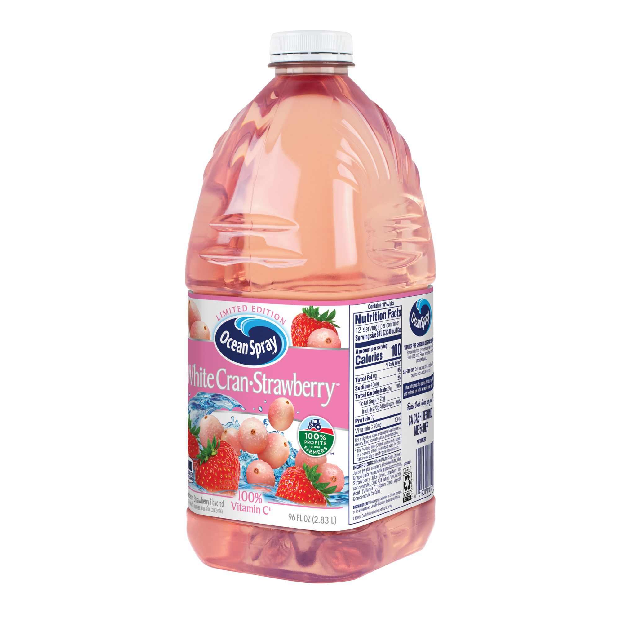 Sweeten the moment with Ocean Spray White Cran-Strawberry Juice Drink. Light and refreshing meets crisp and bold with this blend of white cranberry and strawberry juices. This fruit juice beverage packs 100% of your recommended daily value of vitamin C in a single serving. Enjoy the sweet, tasty flavor of white cranberry juice and strawberry juice concentrate. Did we mention Ocean Spray White Cran-Strawberry Juice Drink is made with no high fructose corn syrup? It's truly a win-win. Use this cranberry juice drink as a cocktail mixer for elevated drinks, or serve it cold on its own. White Cranberry makes a delicious, unique addition to blended beverages and ice pops, too. Go ahead and get creative. This juice drink won't let you down. All this made possible by the 700+ cranberry farming families that make up Ocean Spray's co-op.