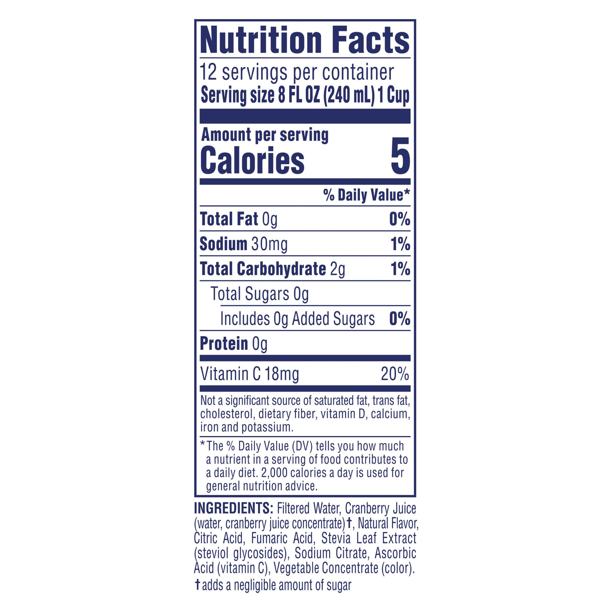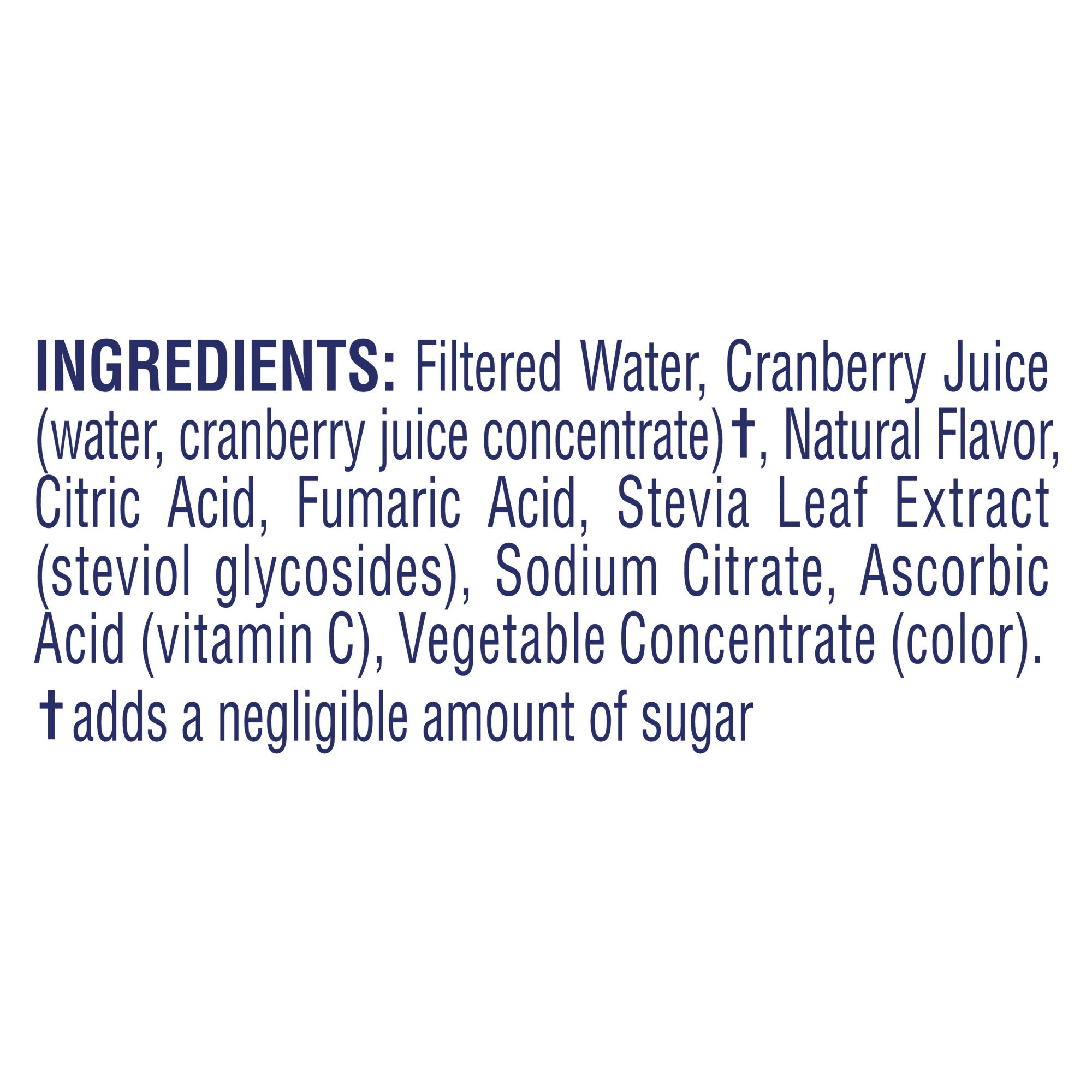 Ingredients: Filtered Water, Cranberry Juice (water, cranberry juice concentrate)†, Natural Flavor, Citric Acid, Fumaric Acid, Vegetable and Fruit Concentrate (color), Sodium Citrate, Stevia Leaf Extract (rebausiosude M, rebaudioside A), Ascorbic Acid (vitamin C).