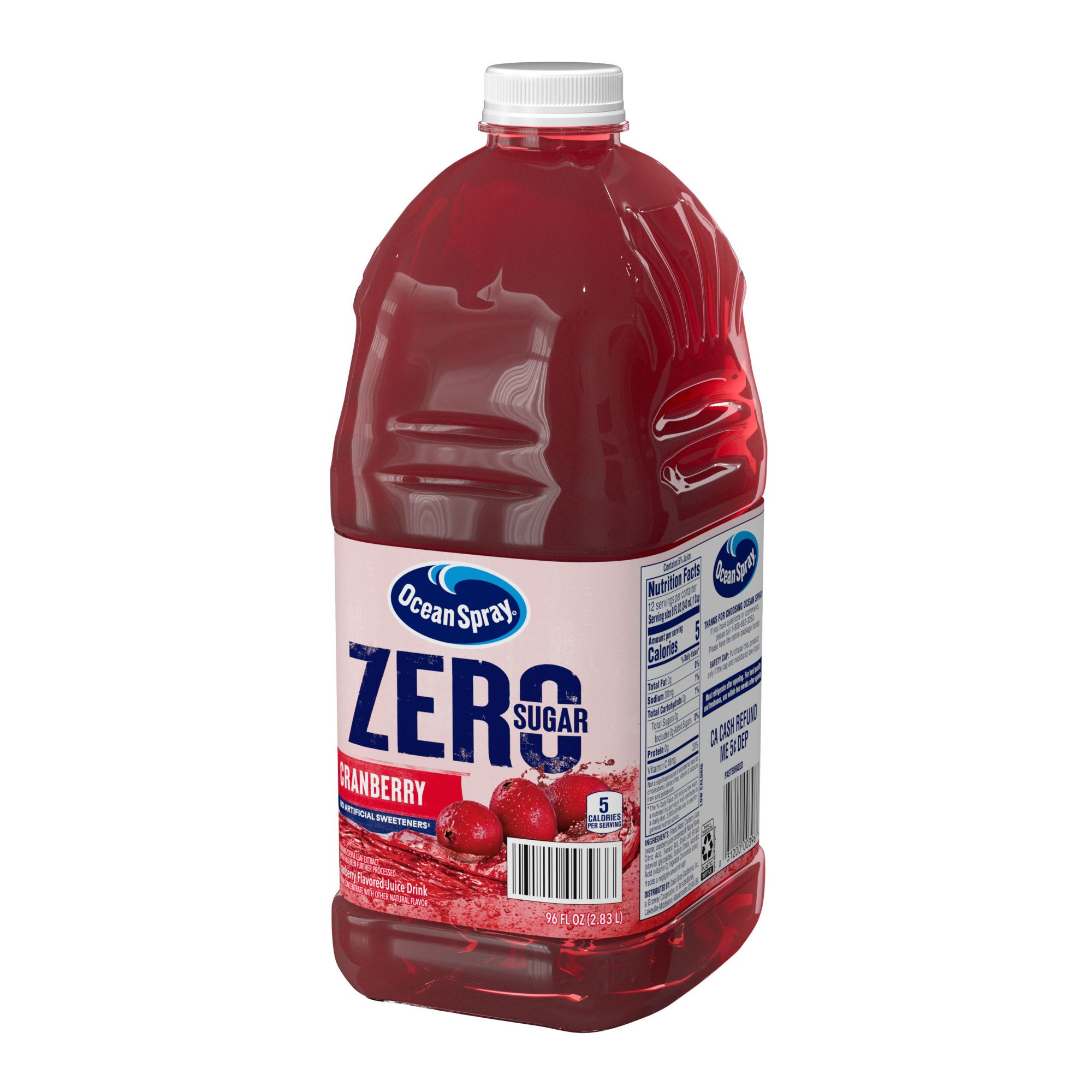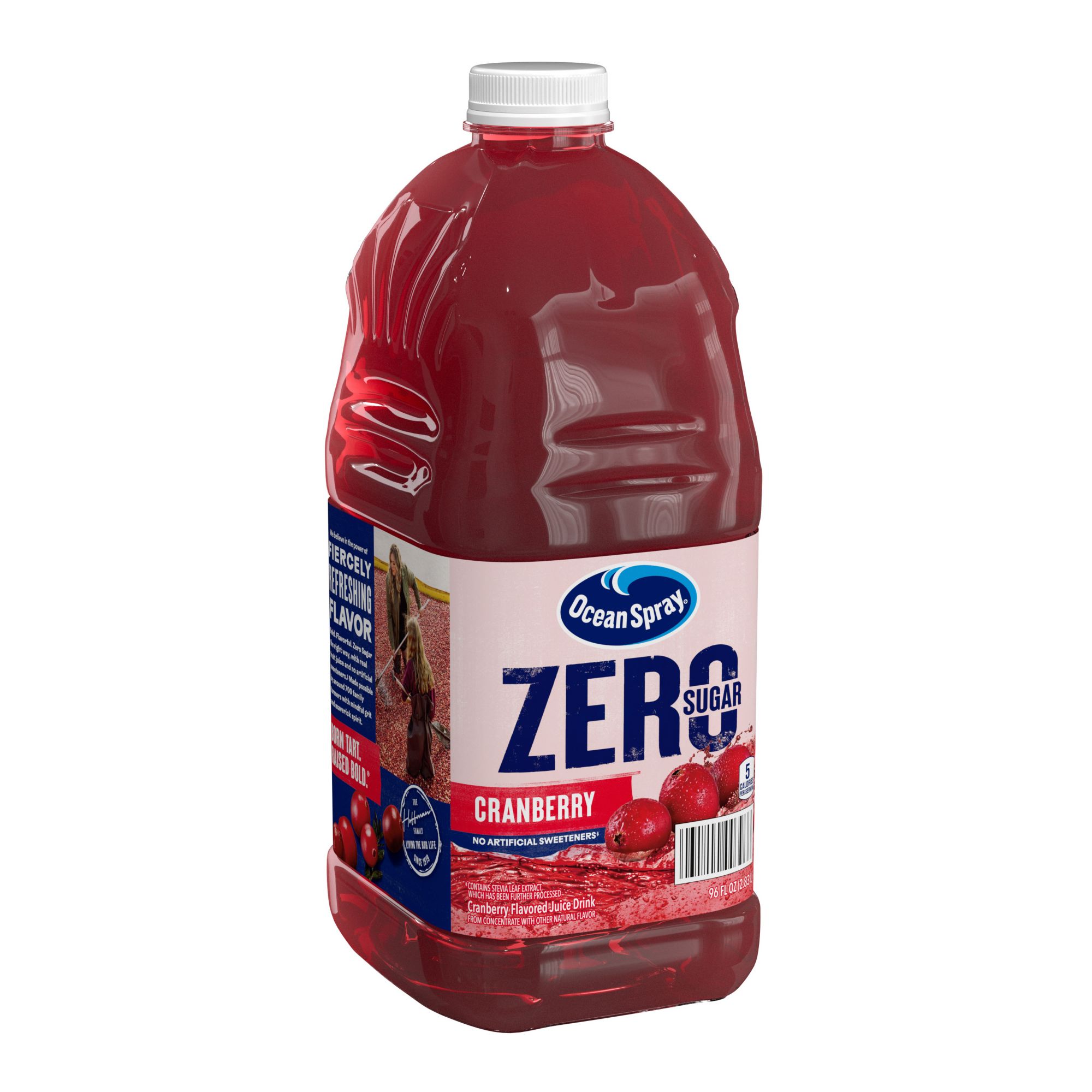 Zero sugar. Bold flavor. Try Ocean Spray Zero Sugar Cranberry Juice Drink. Experience the crisp, fresh taste of cranberries straight from the bog without compromise. This radically refreshing juice drink is made from real fruit juice, 0g of sugar per 8 fl. oz. serving and no artificial sweeteners(1). Just stevia sweetener from stevia leaf extract for a tasty beverage your entire family can feel good about. It's also an excellent source of vitamin C. Ocean Spray Zero Sugar Cranberry is a tasty thirst-quencher that adds flavor to meals. Enjoy on its own, blend into smoothies or use it as a Zero-sugar cocktail mixer for beverages that don't trade sugar for taste. This 64 fl. oz. bottle is big enough to share with the family. Try other Ocean Spray Zero flavors for absolutely delicious, Zero sugar juice drink options. All this made possible by around 700+ cranberry farming families that make up our co-op. Our owners. Our heartbeat. Our inspiration. Ocean Spray believes in the power of the mighty cranberry; Born Tart. Raised Bold. (1) Contains stevia leaf extract, which has been further processed.