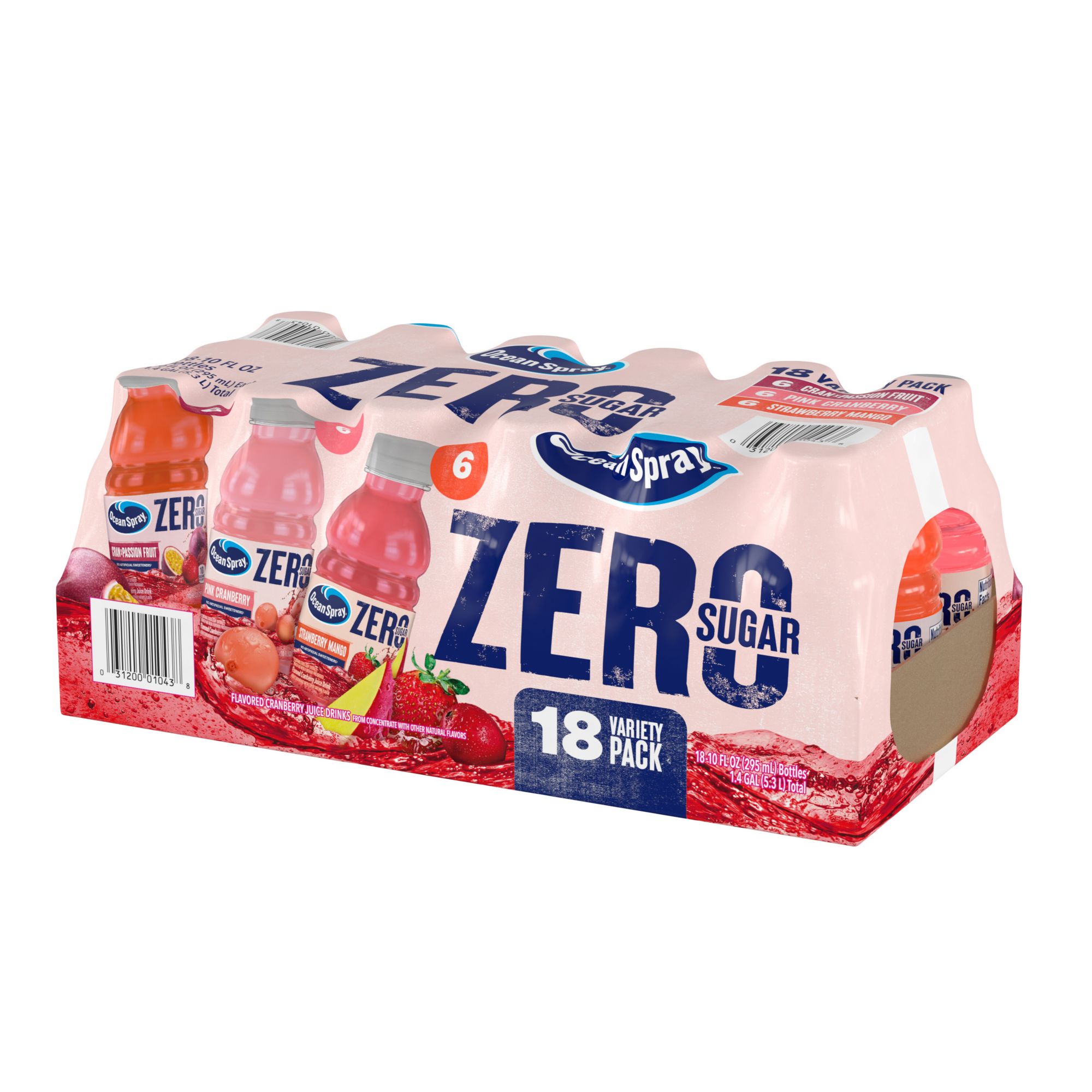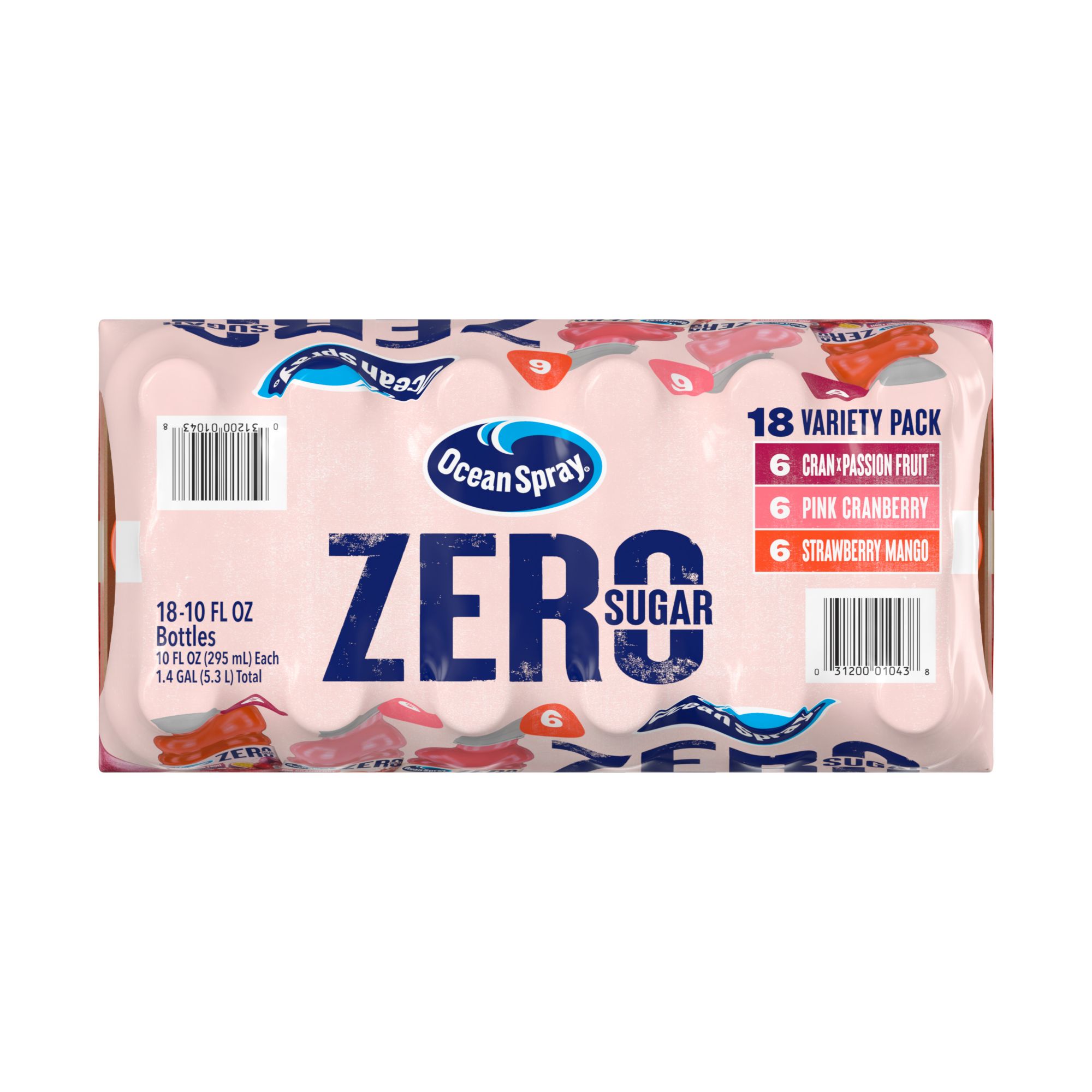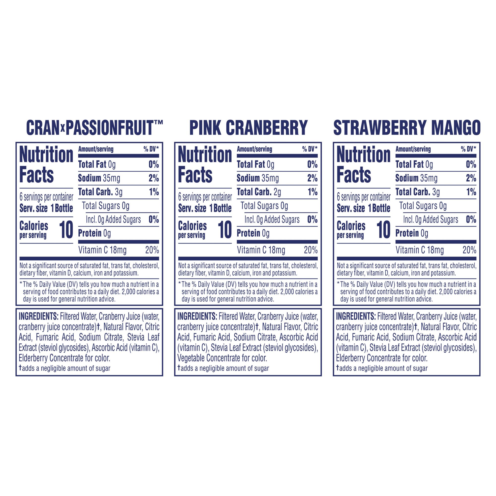 Includes (6) 10 fl. oz. bottles Zero Sugar Cran-Passionfruit, (6) 10 fl. oz. bottles Zero Sugar Pink Cranberry, (6) 10 fl. oz. bottles Zero Sugar Strawberry Mango