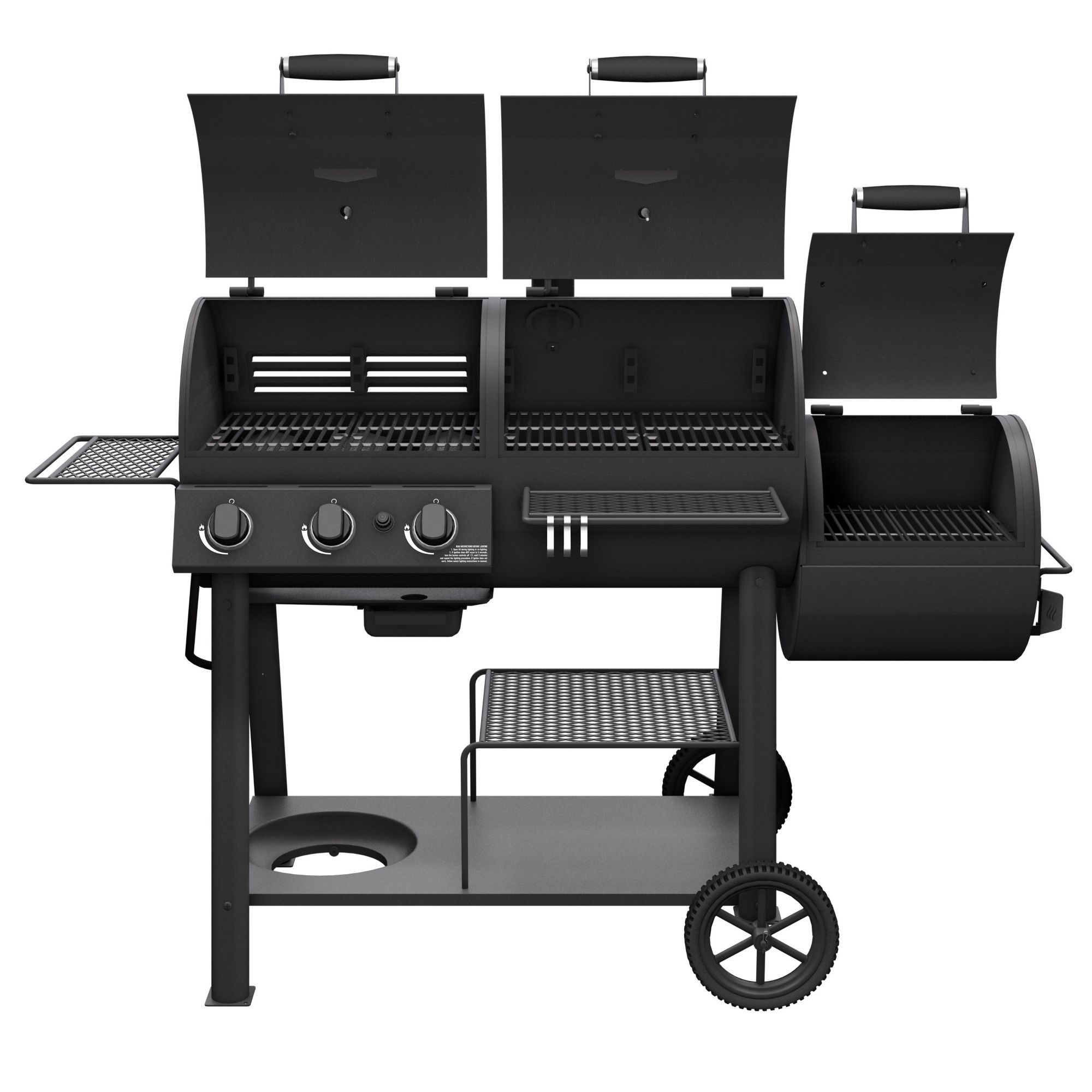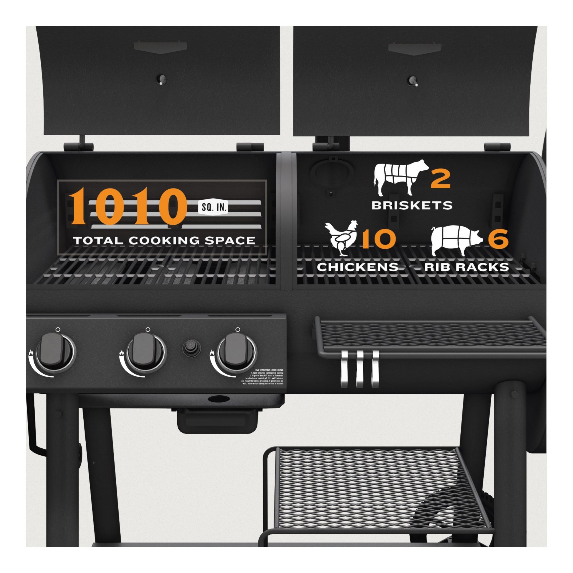 Combo smoker and grill: With a horizontal cooking chamber and a firebox on the side, the smoker is fueled by charcoal and flavored by hardwood splits and chunks, sold separately, to cook low and slow with indirect heat. The three-burner gas grill is powered by liquid propane gas and runs on a 20 lbs. propane tank, not included. It has a 36,000 BTU rating, reaches cooking temperatures quickly, delivers high temps and maintains even heat