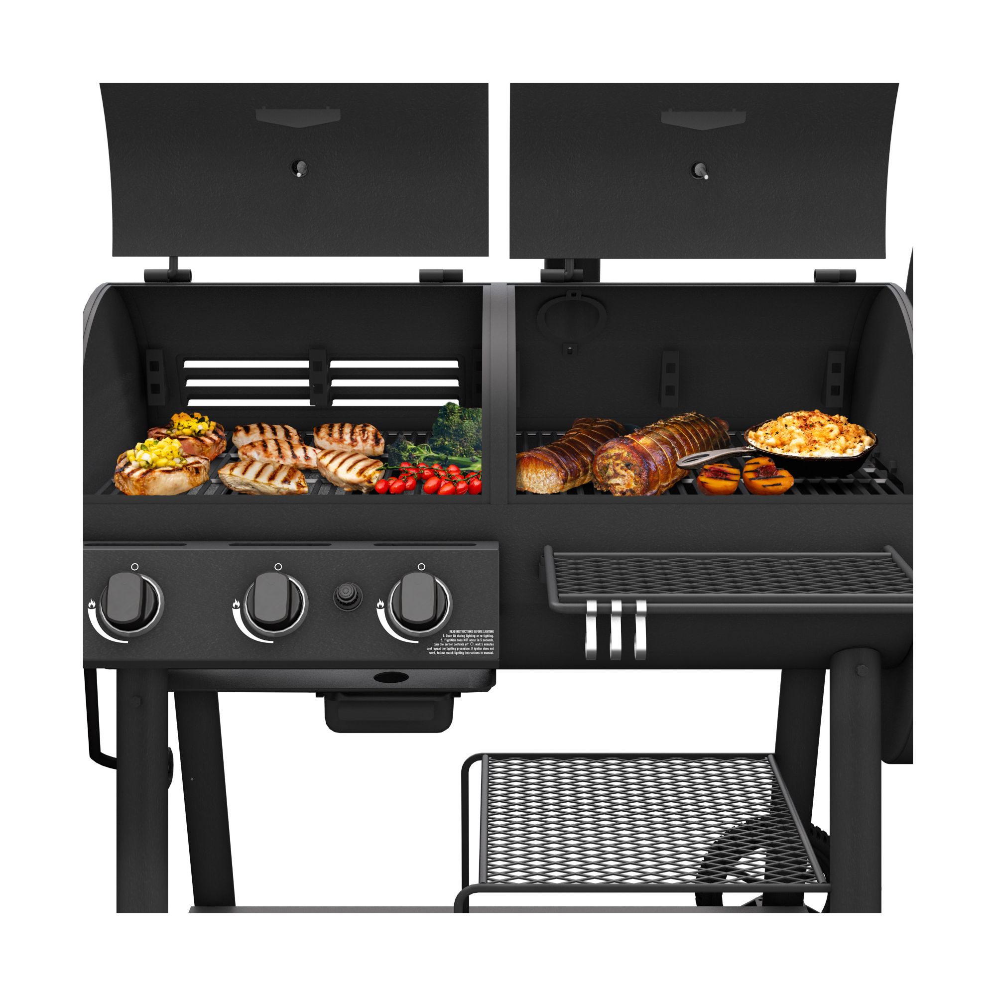 Front and side shelf: The front and side shelves give you a convenient place to set your tools, sauces and basting bowl while you cook