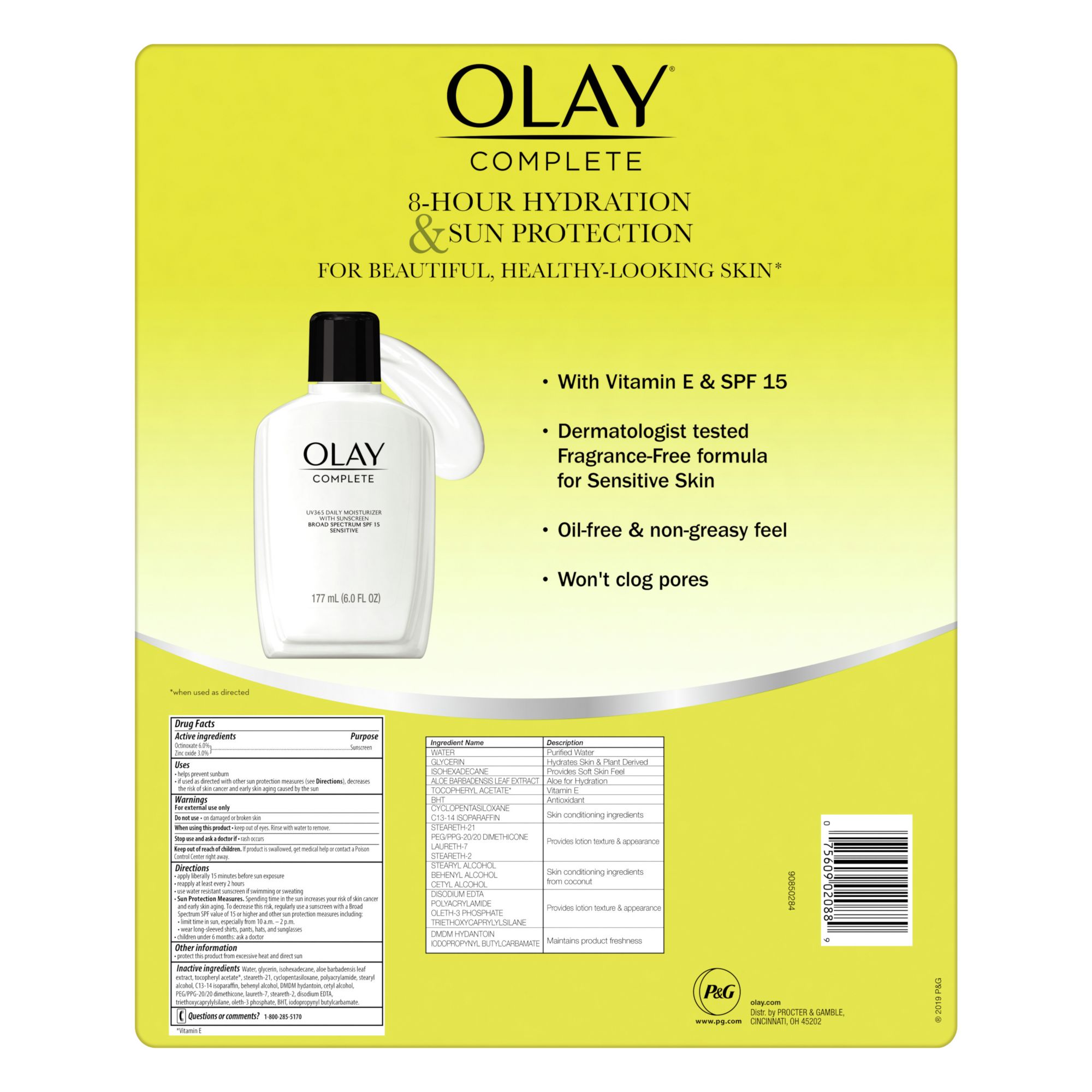 Protect against the #1 cause of aging skin - damage from the sun's rays. Recommended by the Skin Cancer Foundation, Olay complete Daily Moisturizer with Broad Spectrum UVA/UVB protection Sunscreen SPF 15 Facial Moisturizer, provides eight hours of hydration for sensitive skin. This gentle moisturizer with a mineral sunscreen zinc oxide, provides sun protection and is now formulated with Vitamin E Antioxidant Complex to help protect skin's surface from damaging free radicals. Plus, its fragrance-free formula features aloe to condition skin's surface. Unlike many facial moisturizers with sunscreen, Complete Daily facial moisturizer with SPF is non-greasy and lightweight. This face moisturizer for sensitive is oil-free, fragrance-free, dermatologically tested and non-comedogenic (won't clog pores). This formula nourishes seven layers deep into skin's surface to help protect beautiful, younger-looking skin. Using a deep understanding of skin aging, superior ingredients and formulations, and proven performance testing, Olay scientists design and develop products that work. At Olay, they're serious about their commitments. Their Olay Skin Promise to you is zero skin retouching in all advertising. Olay is the first mass skin care brand in the US to take this stance, because they know real beauty is honestly beautiful. They also guarantee you'll love your Olay product. If you are not satisfied, they'll give you your money back via a prepaid card. Must submit within 60 days of purchase. Call toll-free 1-855-845-9797 or visit olay.com/guarantee.