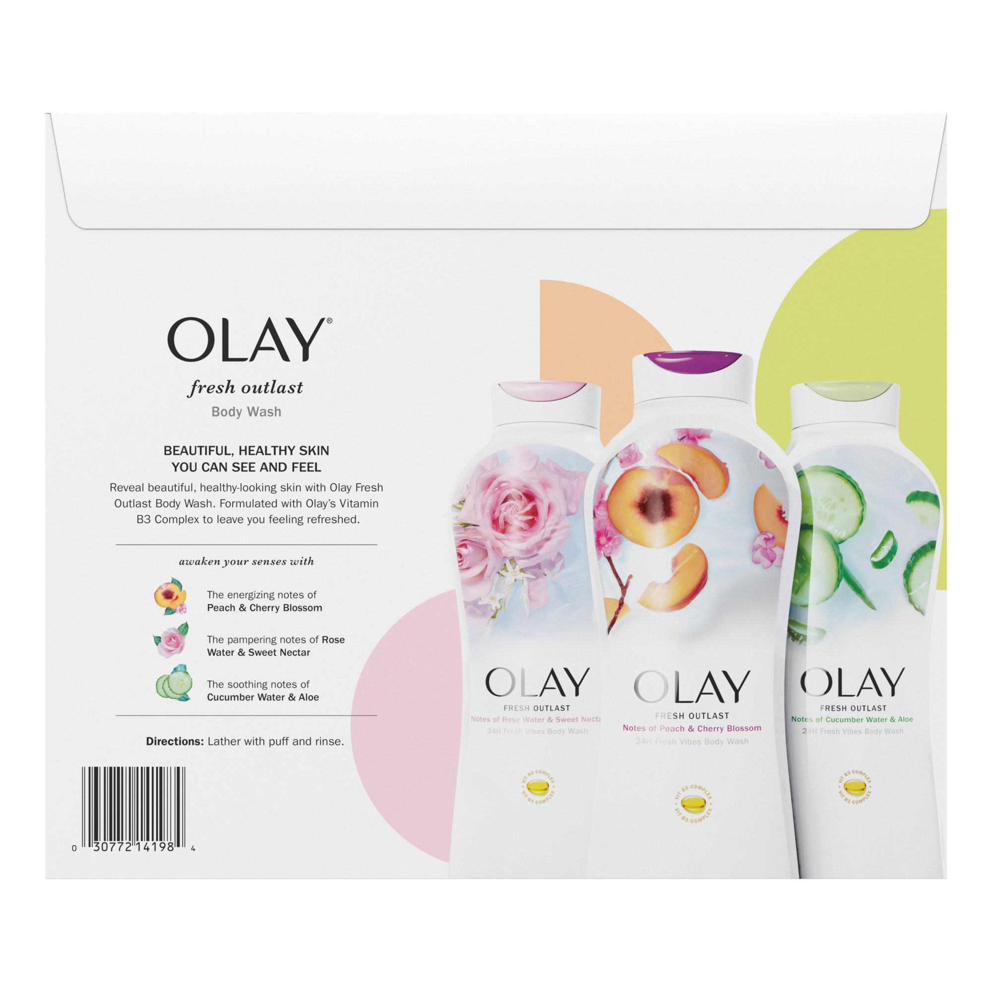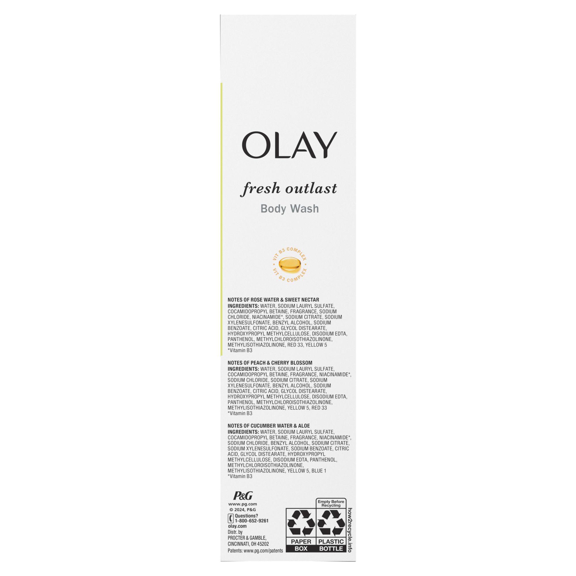 Transform dry and irritated skin into beautiful, healthy skin that you can see and feel. All three amazingly fresh moisturizing body washes restore hydration so skin feels healthy. Plus, it's made with Olay's revitalizing formula with vitamin B3 complex. This triple-pack will delight your senses with three distinct scents, giving you fragrantly delightful skin and the flexibility to switch up scents daily. Aloe: rejuvenatingly soothing with notes of cucumber water. Peach: energizing and sharp with notes of cherry blossom rose: comforting and indulgent with notes of sweet nectar. Transform your shower into a spa-like oasis, leaving your skin moisturized, clean, and fresh. Plus, it boosts hydration better than regular soap. Each craveable scent will wrap your skin in fragrance, awakening the senses. Which uplifting experience you have is completely up to you. Directions: Lather with a puff and rinse. At Olay, they believe in superior science. With over 65 years of a science-first approach to skin care they're dedicated to giving you quality products, safe ingredients, and real results. They're also serious about their commitments. Their Olay Skin Promise to you is zero skin retouching in all advertising. Olay is the first mass skin care brand in the U.S. to take this stance because they know real beauty is honestly beautiful. They also guarantee you'll love your Olay product. If you are not satisfied, they'll give you your money back via a prepaid card. Must submit within 60 days of purchase. Call toll-free 1-855-845-9797 or visit https://www.olay.com/guarantee.