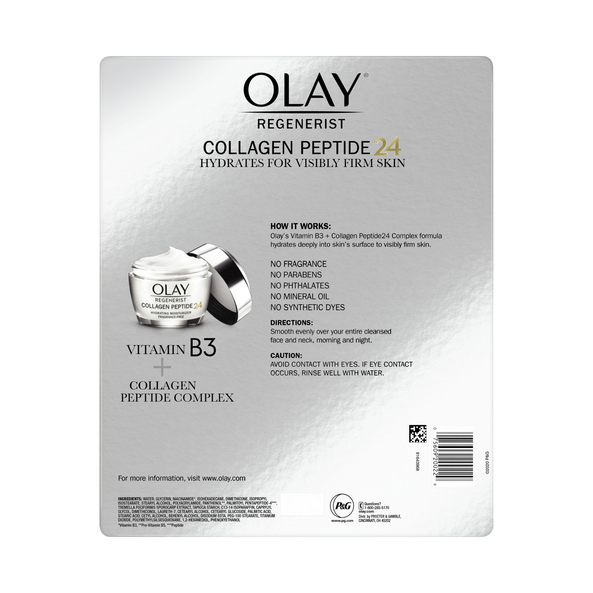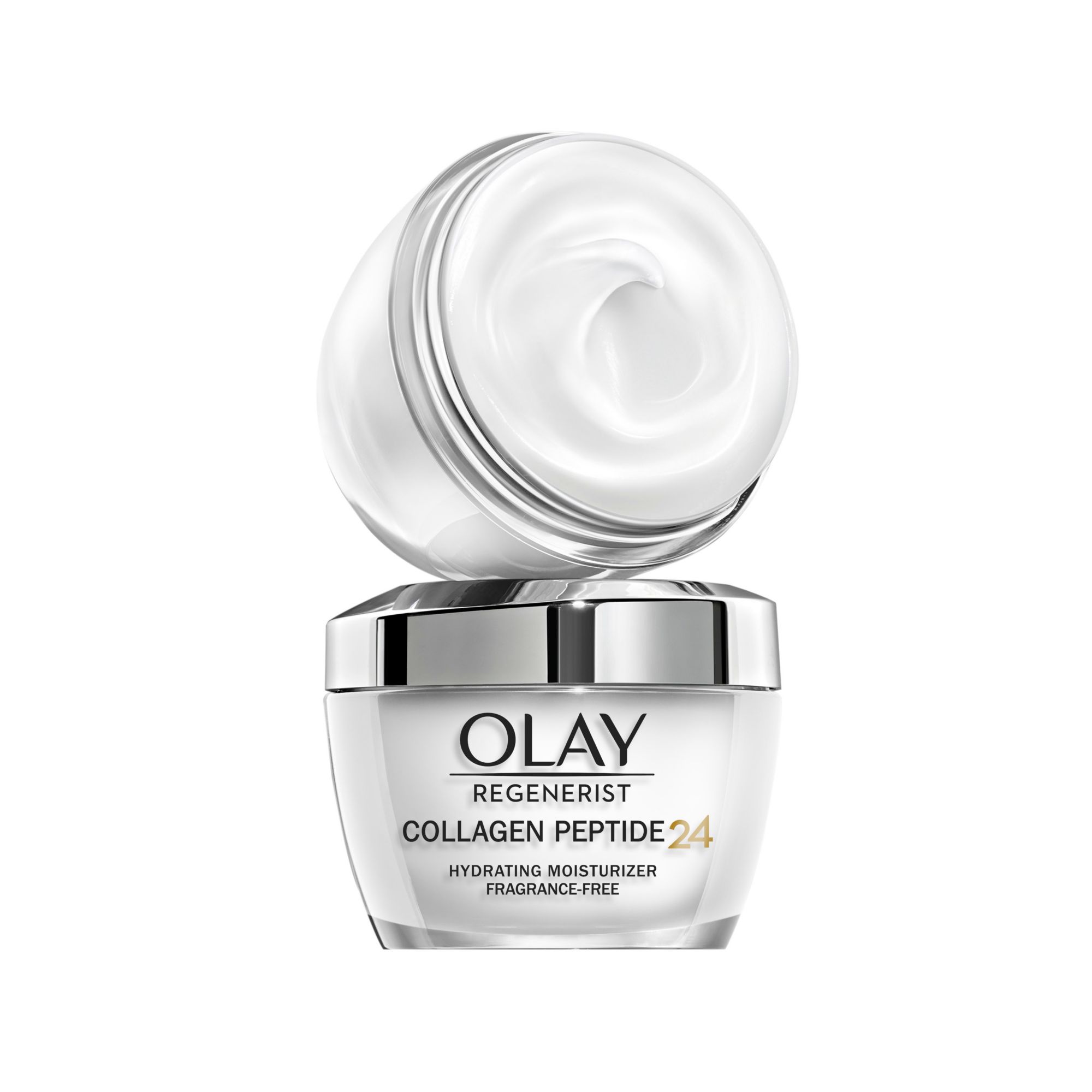 This facial moisturizer provides the benefits of collagen peptide + 24 hours of intense hydration This fragrance-free cream gives you powerful results without a sticky, greasy feel Specifically formulated with tried-and-true ingredients, like Collagen Peptide and Vitamin B3+, to transform the look of your skin Smooth over your face and neck morning and night for 24 hours of hydration This powerful cream is proven to hydrate better than the $400 cream. Use daily for visibly firm skin Immediately after use, your skin will look and feel healthy With two weeks of use, your skin will look and feel visibly firmer and your fine lines and wrinkles will be less noticeable This pack includes two 1.7 oz jars of OLAY Regenerist Collagen Peptide 24 Face Moisturizer