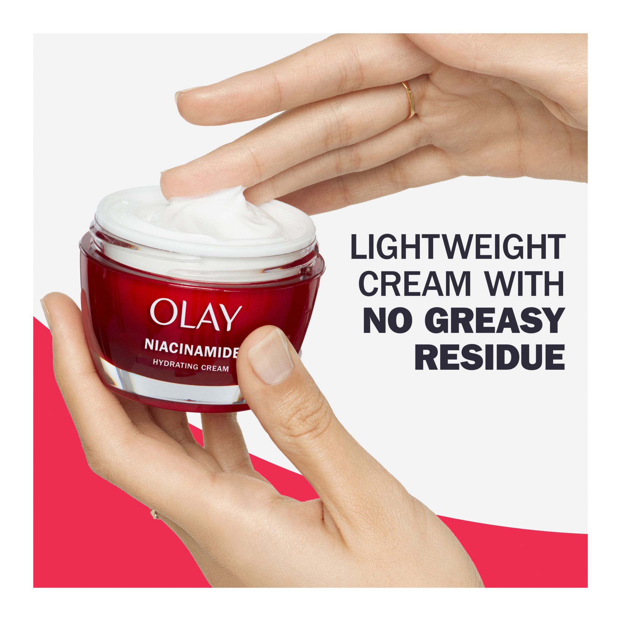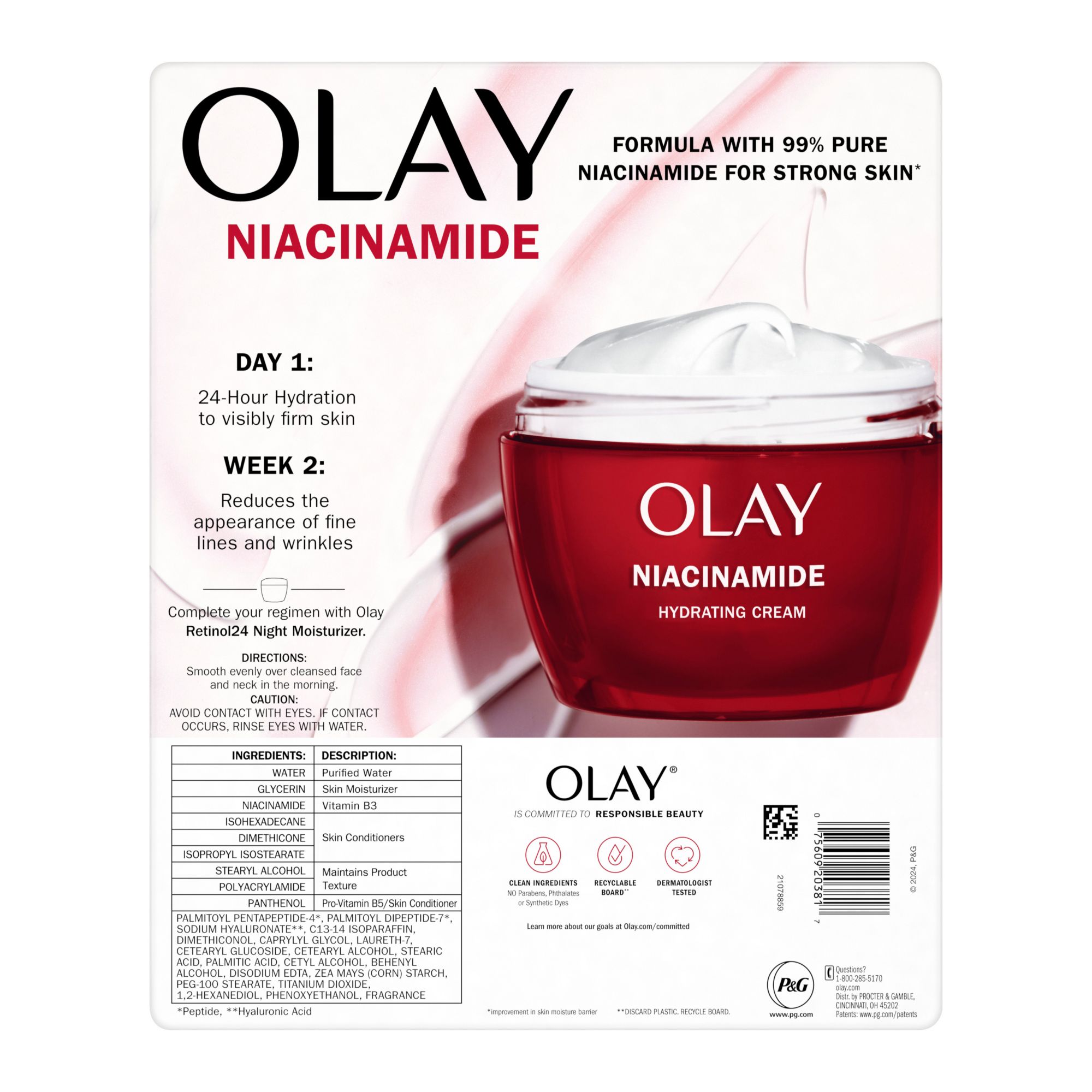 Want to reduce the appearance of fine lines and wrinkles? Unlock 24-hour hydration to visibly firm skin with Olay Niacinamide Face Moisturizer. This lightweight cream melts into skin with no greasy residue. In 1 week you'll see improvements in wrinkles and complexion, and in 1 month you'll see hydrated and visibly improved skin with a 2x stronger skin barrier.* The face moisturizer helps skin retain moisture to keep it seriously hydrated, aids in surface skin cell turnover and regeneration, and exfoliates to remove dull skin. Olay Niacinamide's dermatologist-recommended ingredients are: 99% Pure Niacinamide, Vitamin B, Amino Peptides - And you know what's not in it? There are no parabens, phthalates, or synthetic dyes. How to Use: Smooth evenly over cleansed face and neck both morning and night. Use with SPF in the daytime to protect your glow. Follow up with Olay Retinol 24 Night Moisturizer in the evening. At Olay, they're serious about their commitments. The Olay Skin Promise to you is zero skin retouching in all advertising. Olay is the first mass skin care brand in the U.S. to take this stance because they know real beauty is honestly beautiful. They also guarantee you'll love your Olay product. If you are not satisfied, they'll give you your money back via a prepaid card. Must submit within 60 days of purchase. Call toll-free 1-855-845-9797 or visit https://www.olay.com/guarantee.