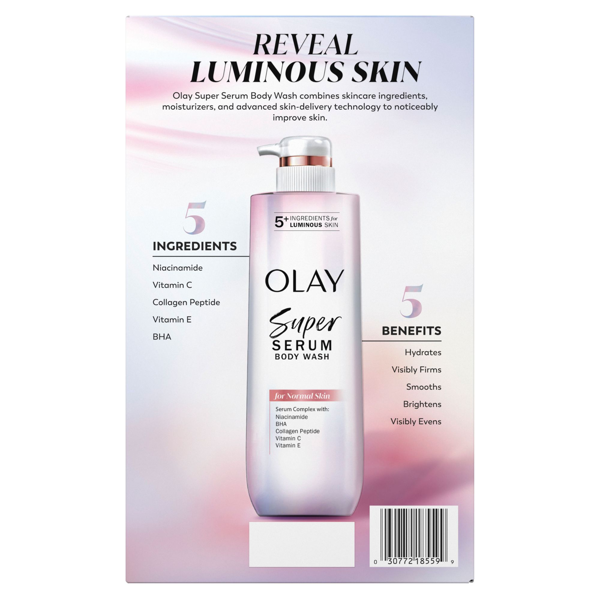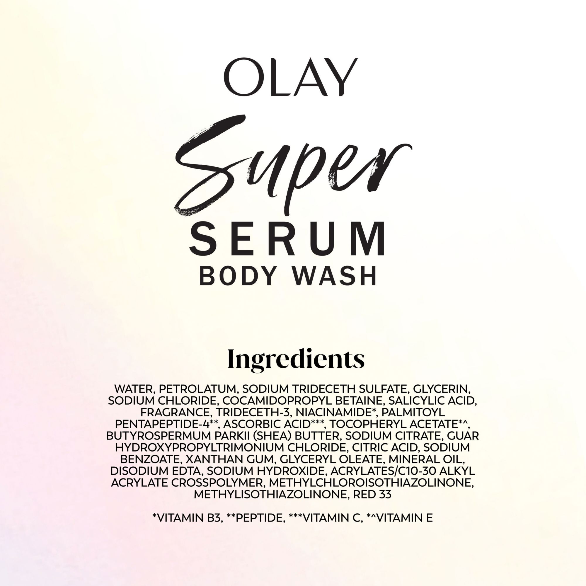 Feel the difference Olay Super Serum Body Wash can make for your skin. See and feel the difference of 5+ ingredients as they work to brighten, even, and firm skin for an ultra-luminous look. Hydrate your skin for 24 hours and experience how skin care ingredients, moisturizers, and advanced skin-delivery technology can noticeably improve skin. Stock up and make less trips with this Olay Super Serum Body Wash 2-pack. This body wash for women is formulated with Olay Super Serum technology: Niacinamide, BHA, Collagen Peptide, Vitamin C, and Vitamin E. It is dermatologist-tested and free of phthalates and silicones. Directions: Simply lather with a puff and rinse. At Olay, they are serious about their commitments. Their Olay Skin Promise to you is zero skin retouching in all advertising. Olay is the first mass skin care brand in the U.S. to take this stance because we know real beauty is honestly beautiful. They also guarantee you will love your Olay product. If you are not satisfied, they'll give you your money back via a prepaid card. Must submit within 60 days of purchase. Call toll-free 1-855-845-9797 or visit https://www.olay.com/guarantee.