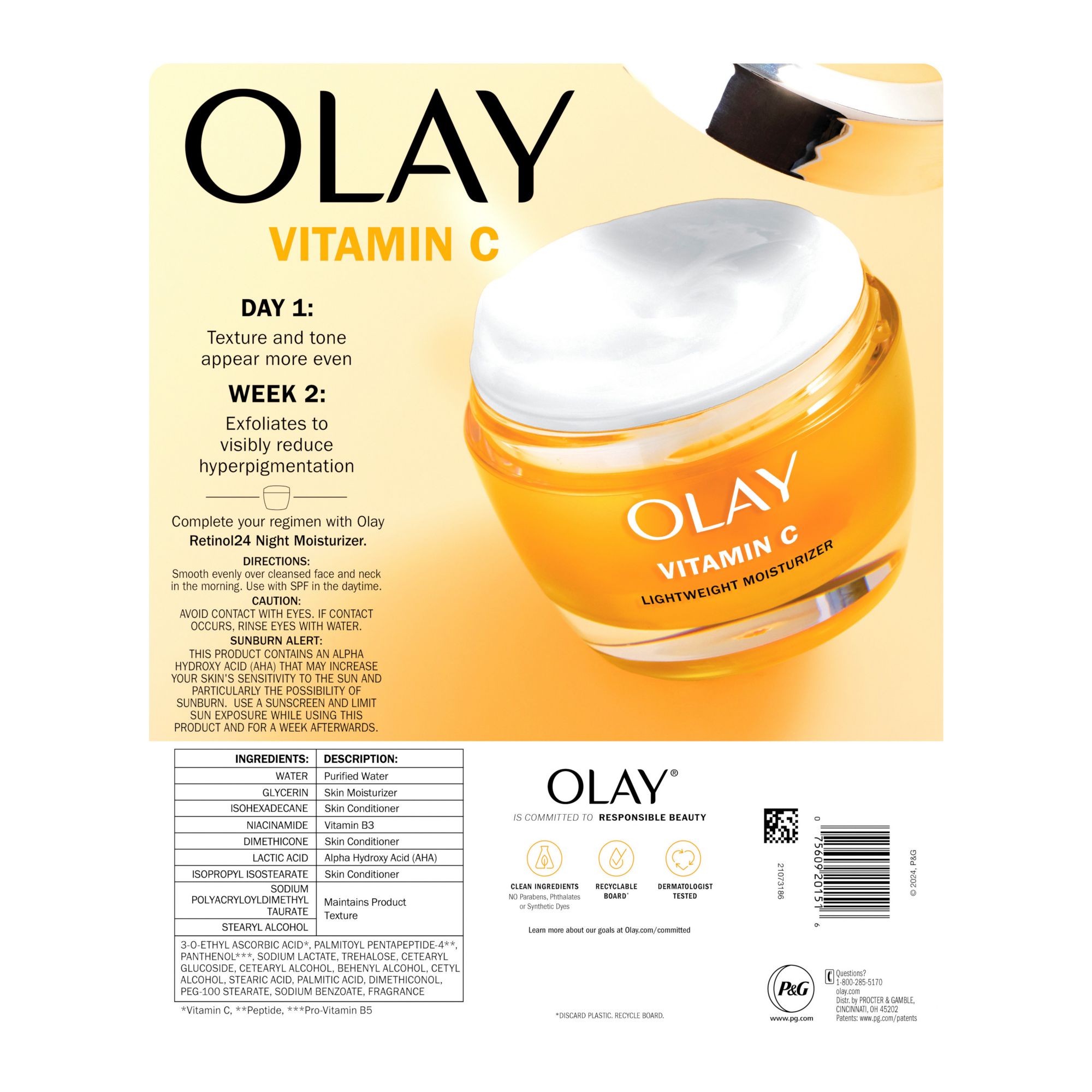 Dull skin? Brighten up, babe! Olay Vitamin C Lightweight Moisturizer delivers 2X Brighter Skin* in just 28 days. And they didn't stop there - Instantly gives a healthy radiant glow! What's not to love about glowing and radiant skin? Citrus-scented, silky, and lightweight, the cream formula melts into your skin without any sticky or greasy residue. The secret to this face cream's glowing success? Olay's formula, with powerful ingredients like Vitamin C, Vitamin B3 and Lactic Acid, can reduce dull skin, like dead skin cells, and improve the look of uneven tone, to let your inner radiance come out. Use both morning and night, and don't forget to follow with a good SPF in the daytime to protect your newfound glow. This cream is dermatologist-tested and made without parabens, phthalates, synthetic dyes or mineral oil. It's only the best for you, you brilliant thing. The Olay Skin Promise to you is zero skin retouching in all advertising. Olay is the first mass skin care brand in the US to take this stance, because they know real beauty is honestly beautiful. They also guarantee you'll love your Olay product. If you are not satisfied, they'll give you your money back via a prepaid card. Must submit within 60 days of purchase. Call toll-free 1-855-845-9797 or visit olay.com/guarantee. *vs a basic moisturizer