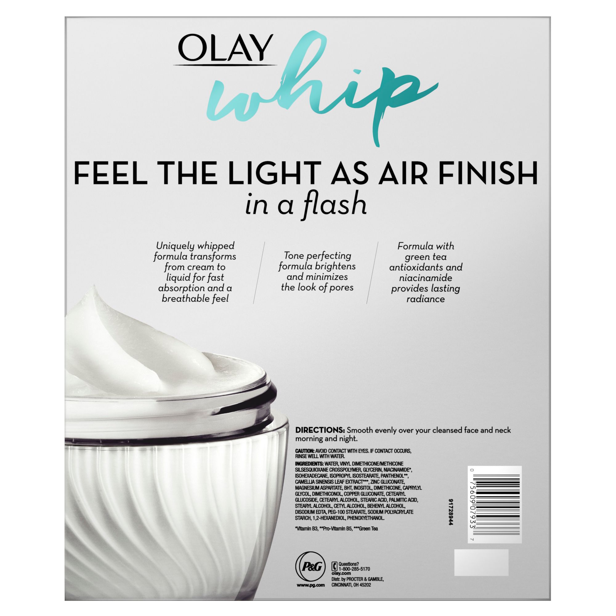 Olay Whip perfects tone and pores with a light as air finish. This breakthrough facial moisturizer transforms from cream to liquid on contact for fast absorption and a breathable feel. You'll see skin that's smooth, matte and shine-free. Formulated with green tea antioxidants and niacinamide, this tone-perfecting moisturizer actively hydrates to brighten and minimize the look of pores for lasting radiance. Its innovative Active Rush Technology features a unique three-dimensional structure that transforms from cream to liquid on skin to deliver potent ingredients in an ultra-lightweight form. Forget about that sticky or greasy feeling, have it all with Olay Whip for powerful skincare with a light-as-air finish.