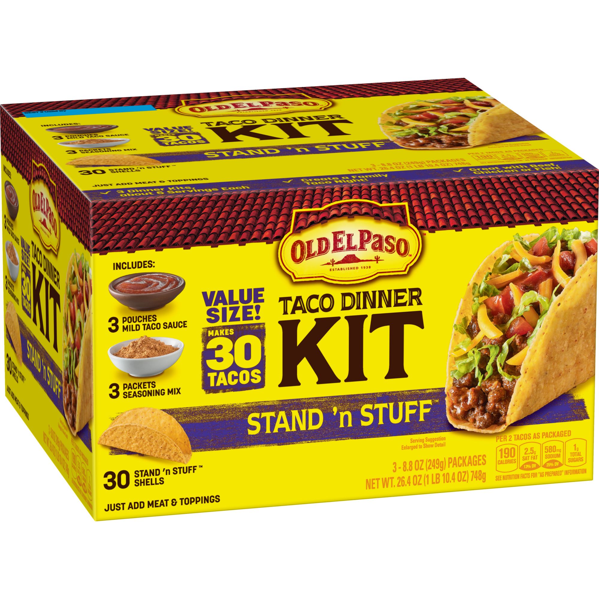 Dinner kit contains Stand 'N Stuff taco shells, taco sauce, and seasoning mix
