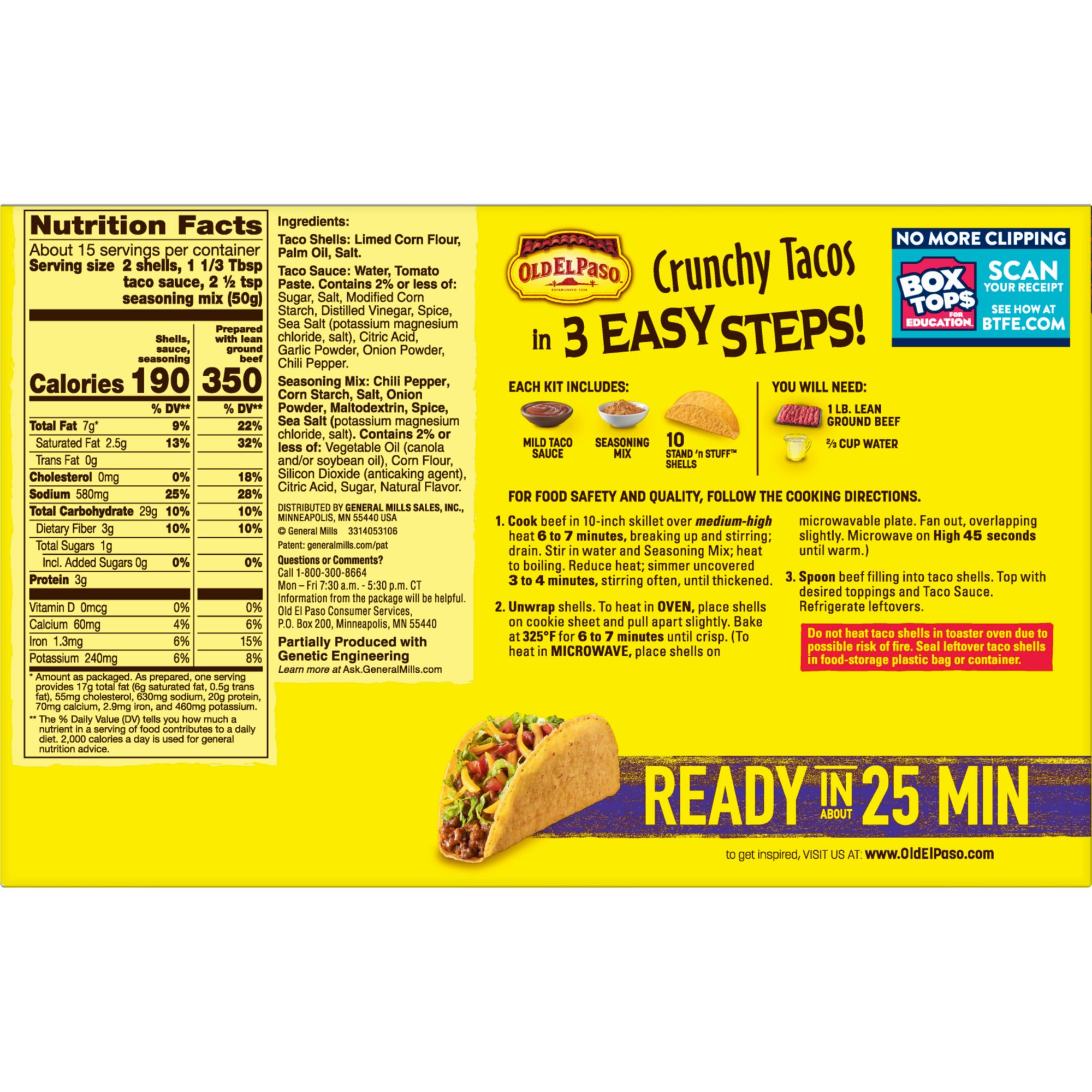 You don't have to worry about your taco falling over when you use Old El Paso Stand 'n Stuff taco shells. These gluten free taco shells combine the taste of traditional hard taco shells with the convenience of a flat bottom to keep them standing on your plate. The kit adds taco sauce and taco seasoning to mix into your chicken or beef. Put tacos on the table in under 30 minutes!